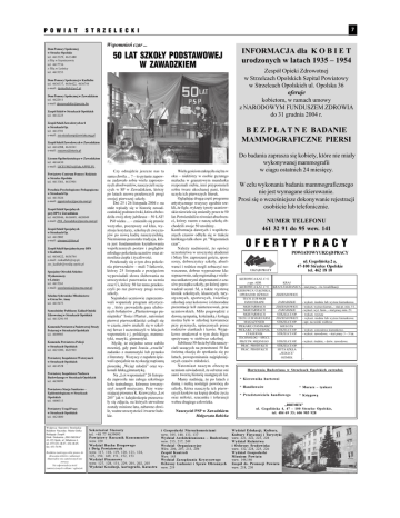 P O W I A T 7 S T R Z E L E C K I Wspomnieñ czar ... Dom Pomocy Spo³ecznej 50 LAT SZKO£Y PODSTAWOWEJ W ZAWADZKIEM w Strzelce Opolskie tel. 4612329, 4613480 z fili¹ w Szymiszowie tel. 4617736 z fili¹ w Lenicy INFORMACJA dla K O B I E T urodzonych w latach 1935 1954 Zespó³ Opieki Zdrowotnej tel. 4615253 w Strzelcach Opolskich Szpital Powiatowy Dom Pomocy Spo³ecznej w Kad³ubie w Strzelcach Opolskich ul. Opolska 36 tel. 4636337, 4636422, 4636744 e-mail: [email protected] oferuje Dom Pomocy Spo³ecznej w Zawadzkiem kobietom, w ramach umowy tel. 4622011 e-mail: [email protected] z NARODOWYM FUNDUSZEM ZDROWIA Zespó³ Szkó³ w Strzelcach Opolskich do 31 grudnia 2004 r. tel. 4612225 Zespó³ Szkó³ Zawodowych nr1 B E Z P £ A T N E BADANIE w Strzelcach Op. tel. 4612701 e-mail: [email protected] MAMMOGRAFICZNE PIERSI Zespó³ Szkó³ Zawodowych w Zawadzkiem tel. 4616288, 4616541 e-mail: [email protected] Do badania zaprasza siê kobiety, które nie mia³y Liceum Ogólnokszta³c¹ce w Zawadzkiem wykonywanej mammografii tel. 4616430 e-mail: [email protected] Powiatowe Centrum Pomocy Rodzinie w Strzelce Opolskie Czy odnajdzie jeszcze nas ta sama chwila ... ? to pytanie zapewne zadawa³o sobie wielu zaproszo- tel. 4613381, 4613901 nych absolwentów, nauczycieli ucz¹- Poradnia Psychologiczno-Pedagogiczna cych w SP w Zawadzkiem, którzy w Strzelcach Op. po latach znowu przekroczyli progi tel. 4613026 e-mail: [email protected] Zespó³ Szkó³ Specjalnych swojej pierwszej szko³y. Dni 25 i 26 listopada 2004 r. na tel. 4620046, 4616049, 4620049 w Strzelcach Op. Zespó³ Szkó³ Specjalnych przy DPS tel. 4636422, 4636744 Konfrontacja dawnych i wspó³czesnych czasów odby³a siê w trakcie ra jest fundamentem kszta³towania czar. nia pierwszaków mali 7-latkowie, którzy 25 listopada z przejêciem Specjalny Orodek SzkolnoWychowawczy tel. 4615261 e-mail: [email protected] Szkolne Schronisko M³odzie¿owe w Górze w. Anny szko³y. Najm³odsi uczniowie zaprezento- tel. 4613291-95 nych bohaterów Plastusiowego pamiêtnika Tosia i Plastu , natomiast pierwsi pierwszoklasici cofnêli siê Komenda Powiatowa Pañstwowej Stra¿y Po¿arnej w Strzelcach Opolskich w czasie, znów znaleli siê w szkolnej ³awce i uczestniczyli w lekcjach wspomnieñ z j. polskiego, matema- tel. 4049903 tyki, muzyki, gimnastyki. Komenda Powiatowa Policji Mylê, ¿e niejedno serce zabi³o w Strzelcach Opolskich mocniej, gdy pani Joasia rzuci³a tel. 4621200, 4621903 zadanko z matematyki lub pytanko Powiatowy Inspektorat Weterynarii w Strzelcach Opolskich z literatury. Wszyscy z zapa³em piewali specjalnie na tê okazjê napisan¹ piosenkê Wci¹¿ m³odzi oraz wy- tel. 4614528 konali lekk¹ gimnastykê. Powiatowy Inspektorat Nadzoru Budowlanego w Strzelcach Opolskich tel. 4639099 Na Lot wspomnieñ 26 listopa- da zaprosi³a nas za³oga szkolnego ma unikatowymi eksponatami z czawadza³ uczeñ 5d, a tak¿e wystawê kronik szkolnych, klasowych, tury- stycznych, sportowych, wietlicy szkolnej oraz kolorowe i ró¿norodne prezentacje kó³ zainteresowañ, prac uczniowskich. Mi³o pogawêdziæ z dawn¹ sympati¹, kole¿ank¹ i koleg¹ mo¿na by³o w szkolnej kawiarence przy pysznych, upieczonych przez rodziców ciastkach i kawie. Wyj¹tkowo smakowa³ w tym dniu bigos spo¿ywany w sto³ówce szkolnej. Jubileusz 50-lecia by³ dla nauczycieli ucz¹cych na przestrzeni 50 lat wietn¹ okazj¹ do spotkania siê po szych czasów m³odoci. Natomiast naszym sami tworz¹ historiê nastêpnych lat. Mamy nadziejê, ¿e po latach z 205 jak w kalejdoskopie przesuwa- Wydawca: Starostwo Strzeleckie Redaktor Naczelny: Marta Górka Redaguje Zespó³. Druk: Drukarnia PRO MEDIA 45-125 Opole, ul. Sk³adowa 4, tel. 077/453-18-07, 454-18-69, fax 453-74-96 Redakcta zastrzega sobie prawo do skracania tekstów i adiustacji. Materia³ów nie zamówionych nie zwraca. Nie odpowiada za treæ zamieszczonych reklam i og³oszeñ. szko³y, która nauczy³a ich pierworaz mi³oci, szacunku i tolerancji le, wa¿ne uroczystoci i twarze ludz- Starosty Powiatowy Rzecznik tel. +48 77 4639093 wew. 220 i Konsumentów Wydzia³ Ruchu Drogowego i Dróg Powiatowych wew. 117, 118, 119, 120, 121, 124, 125, 150, 149, 151, 152, 153 Wydzia³ Finansowy wew. 127, 128, 131, 229, 201, 202, 203 Wydzia³ Geodezji, kartografii, Katastru OPERATOR DWIGU ZDZIESZOWICE FIZJOTERAPII ZAWADZKIE Gospodarki Nieruchomociami Wy d z i a ³ A rc h i t e k t o n i c z n o wew. 215, 217, 249 Wydzia³ Budowlany Organizacyjny Wew. 206, 207, 213, 204 Zespó³ Kontroli Wew. 145 Wydzia³ Zarz¹dzania Kryzysowego Ochrony Ludnoci i Spraw Obronnych wew. 219 _ MGR FARMACJI ZDZIESZOWICE - wykszt. rednie lub wy¿sze kierunkowe, - wykszt. wy¿sze kierun., - sta¿ pr. min. 5 l. MGR FARMACJI ZAWADZKIE MGR FARMACJI STRZELCE OP. TECH. LUB MGR FARM. ZDZIESZOWICE MAGAZYNIER STRZELCE OP. PIEKARZ, CIASTKARZ KIELCZA PIEKARZ, CUKIERNIK - wykszt. wy¿. farm., - sta¿ pracy min. 2 l. STRZELCE OP. CUKIERNIK STRZELCE OP. - wykszt. zawodowe, - sta¿ pracy 3 5 lat. PRZETW. MIÊSNEGO STRZELCE OP. - wykszt. rednie, - dow. zawodowe. PRAC. PRODUKCJI STRZELCE OP. _ PRAC. PRODUKCJI HUTA SZK£A - wykszt. wy¿sze - wykszt. rednie lub wy¿sze kierunkowe. - upr. na wózki wid³owe _ - wykszt. zawodowe kierunkowe. TECHNOLOG SPECJ. JEDLICE OZIMEK _ Hurtownia Budowlana w Strzelcach Opolskich zatrudni: * Kierownika hurtowni * Handlowców * Murarz tynkarz * Przedstawiciela handlowego * Ksiêgow¹ DREMEX ul . Gogol i ñska 4, 47 100 Strzel ce Opol ski e, tel. 484 69 33; 606 985 928 Ma³gorzata Rabicka wew. 105, 140, 133, 137 _ - sta¿ pracy, - w. kwalifikacji TECH. LUB MGR Nauczyciel PSP w Zawadzkiem kie. Sekretariat KRAJ KRAJ I ZAGRANICA wobec drugiego cz³owieka. zosta³y minione lata, zabawne chwi- tel. 4621800 z upr. ADR KIEROWCA KAT. C+E KIEROWCA CI¥GNIKA, uczniom uwiadomi³, ¿e od teraz oni Opolskich w Strzelcach Opolskich KIEROWCA KAT. C+E obecnym szych kroków na krêtej drodze ¿ycia Powiatowy Urz¹d Pracy tel. 462 18 10 latach, powspominani