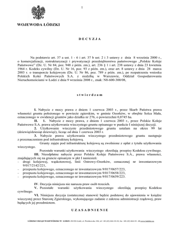 1 WOJEWODA ŁÓDZKI DECYZJA Na podstawie art. 37 a ust. 1 - 6 i art. 37 b ust. 2 i 3 ustawy z dnia 8 września 2000 r., o komercjalizacji, restrukturyzacji i prywatyzacji przedsiębiorstwa państwowego „Polskie Koleje Państwowe” (Dz. U. Nr 84, poz. 948 z późn. zm.), art. 236 § 1 i art. 238 ustawy z dnia 23 kwietnia 1964 r. Kodeks cywilny (Dz. U. Nr 16, poz. 93 z późn. zm.), oraz art. 8 ustawy z dnia 28 marca 2003 r. o transporcie kolejowym (Dz. U. Nr 86, poz. 789 z późn. zm.), po rozpatrzeniu wniosku Polskich Kolei Państwowych S.A. z siedzibą w Warszawie, Oddział Gospodarowania Nieruchomościami w Łodzi z dnia 9 września 2008 r., znak: N8-600-300/08, stwierdzam I. Nabycie z mocy prawa z dniem 1 czerwca 2003 r., przez Skarb Państwa prawa własności gruntu położonego w powiecie zgierskim, w gminie Ozorków, w obrębie Solca Mała, oznaczonego w ewidencji gruntów jako działka nr 276, o powierzchni 0,8745 ha. II. 1. Nabycie z mocy prawa, z dniem 1 czerwca 2003 r., przez Polskie Koleje Państwowe S.A. prawa użytkowania wieczystego gruntu opisanego w punkcie I niniejszej decyzji. 2. Użytkowanie wieczyste przedmiotowego gruntu ustalam na okres 99 lat (dziewięćdziesiąt dziewięć), licząc od dnia 1 czerwca 2003 r. 3. Nabycie prawa użytkowania wieczystego przedmiotowego gruntu następuje z przeznaczeniem pod infrastrukturę kolejową. Grunty zajęte pod infrastrukturę kolejową są zwolnione z opłat z tytułu użytkowania wieczystego. Pozostałe warunki użytkowania wieczystego określają przepisy Kodeksu cywilnego. III. Nieodpłatne nabycie przez Polskie Koleje Państwowe S.A., prawa własności, znajdujących się na gruncie opisanym w pkt I naniesień: − drogi kolejowej, wąskotorowej, linii Ostrowy-Ozorków, oznaczonej nr inwentarzowym 9/017/2142/221, − przepustu kolejowego, oznaczonego nr inwentarzowym 9/017/0657/223, − przepustu kolejowego, oznaczonego nr inwentarzowym 9/017/0658/223, − przepustu kolejowego, oznaczonego nr inwentarzowym 9/017/0659/223. IV. Decyzja niniejsza nie narusza praw osób trzecich. V. Pozostałe warunki użytkowania wieczystego określają przepisy Kodeksu cywilnego. VI. Niniejsza decyzja (ostateczna) stanowić będzie podstawę do ujawnienia w księdze wieczystej przez Starostę Zgierskiego, wykonującego zadanie z zakresu administracji rządowej, praw będących jej przedmiotem. UZASADNIENIE ŁÓDZKI URZĄD WOJEWÓDZKI W ŁODZI -90-926 Łódź, ul. Piotrkowska 104, tel +48 (42) 664-10-10, fax +48 (42) 664-10 –40,www.lodzkie.eu ŁÓDZKI URZĄD WOJEWÓDZKI W ŁODZI - ul. Piotrkowska 104, 90-926 Łódź, tel +48 (42) 664-18-00, fax +48 (42) 664-18–04 2 „Polskie Koleje Państwowe” Spółka Akcyjna z siedzibą w Warszawie, wnioskiem z dnia z dnia 9 września 2008 r., znak: N8-600-300/08, wystąpiła do Wojewody Łódzkiego o stwierdzenie nabycia na podstawie art. 34 i 35 ustawy z dnia 8 września 2000 r. o komercjalizacji (...) z dniem 27 października 2000 r., z mocy prawa przez Polskie Koleje Państwowe S.A. prawa użytkowania wieczystego gruntu położonego w powiecie zgierskim, w gminie Ozorków, w obrębie Solca Mała, oznaczonego w ewidencji gruntów jako działka nr 276, o powierzchni 0,8745 ha z jednoczesnym nabyciem prawa własności znajdujących się na nim naniesień. Pismem z dnia 19 listopada 2009 r. znak: N8a-600-479/09, PKP S.A. wystąpiły o rozpatrywania przedmiotowej sprawy na podstawie art. 37 a oraz 37 b ust. 2 ustawy o komercjalizacji (...), znowelizowanej ustawą z dnia 24 października 2008 r. o zmianie ustawy o komercjalizacji, restrukturyzacji i prywatyzacji przedsiębiorstwa państwowego "Polskie Koleje Państwowe" oraz ustawy o transporcie kolejowym (Dz. U. z 2008 r., Nr 206, poz. 1289). Po rozpatrzeniu wymienionego na wstępie wniosku, na podstawie zebranej w sprawie dokumentacji ustalono, co następuje: Zgodnie z przepisem art. 37 a ust. 1 ustawy o komercjalizacji (...), grunty wchodzące w skład linii kolejowych, pozostające w dniu 28 lutego 2003 r., we władaniu PKP S.A. niestanowiące własności Skarbu Państwa, jednostek samorządu terytorialnego lub PKP S.A. stają się z dniem 1 czerwca 2003 r., z mocy prawa własnością Skarbu Państwa za odszkodowaniem. Z treści oświadczenia PKP S.A., z dnia 8 września 2008 r., wynika, że „(...) nieruchomość położona w gminie Ozorków, w obrębie Solca Mała oznaczona w ewidencji gruntów jako działka nr 276 stanowi w 100% infrastrukturę kolejową linii wąskotorowej Ostrowy Wąs.-Ozorków Wąs. w rozumieniu art. 4 Ustawy z dnia 28.03.2003 r. o transporcie kolejowym (Dz. U. Nr 86 poz. 789), w tym pas przyległy do linii służący prawidłowej eksploatacji (art. 4 ust. 3 cyt. ustawy).”. Ponadto ustalono, że opisywana nieruchomość: −nie była w dniu 1 czerwca 2003 r., własnością Skarbu Państwa ani jednostek samorządu terytorialnego, −nie była w dniu 1 czerwca 2003 r., własnością „Polskich Kolei Państwowych” S.A. (oświadczenie PKP S.A. z dnia 19 listopada 2009 r. znak: N8a-600-479/09), −nie ma założonej księgi wieczystej ani zbioru dokumentów oraz innych dokumentów potwierdzających prawa rzeczowe do przedmiotowej nieruchomości (pismo Starosty Zgierskiego z dnia 24 listopada 2009 r. znak: GK.I.7013/82/104O/08). Z powyższego wynika, że grunt objęty niniejszą decyzją, wchodzi w skład linii kolejowych i nie posiada założonej księgi wieczystej, zbioru dokumentów ani innych dokumentów, na podstawie których można byłoby ustalić osoby, którym przysługują do niego prawa rzeczowe. Zatem stosownie do treści art. 37 b ust. 2 ustawy o komercjalizacji (...), w przypadku gruntów, dla których ze względu na brak księgi wieczystej, zbioru dokumentów albo innych dokumentów nie można ustalić osób, którym przysługują do nich prawa rzeczowe, informację o zamiarze potwierdzenia nabycia praw, o których mowa w art. 37 a ust. 1 i 2, wojewoda podaje do publicznej wiadomości w drodze obwieszczenia 