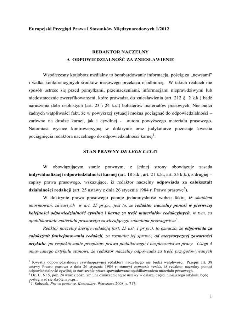 Europejski Przegląd Prawa i Stosunków Międzynarodowych 1/2012 REDAKTOR NACZELNY A ODPOWIEDZIALNOŚĆ ZA ZNIESŁAWIENIE Współczesny krajobraz medialny to bombardowanie informacją, pościg za „newsami” i walka konkurencyjnych środków masowego przekazu o odbiorcę. W takich realiach nie sposób ustrzec się przed pomyłkami, przeinaczeniami, informacjami nieprawdziwymi lub niedostatecznie zweryfikowanymi, które prowadzą do zniesławienia (art. 212 § 2 k.k.) bądź naruszenia dóbr osobistych (art. 23 i 24 k.c.) bohaterów materiałów prasowych. Nie budzi Ŝadnych wątpliwości fakt, Ŝe w powyŜszej sytuacji moŜna pociągnąć do odpowiedzialności – zarówno na drodze karnej, jak i cywilnej - autora powyŜszego materiału prasowego. Natomiast wysoce kontrowersyjną w doktrynie oraz judykaturze pozostaje kwestia pociągnięcia redaktora naczelnego do odpowiedzialności karnej1. STAN PRAWNY DE LEGE LATA? W obowiązującym stanie prawnym, z jednej strony obowiązuje zasada indywidualizacji odpowiedzialności karnej (art. 18 k.k., art. 21 k.k., art. 55 k.k.), z drugiej – zapisy prawa prasowego, wskazujące, iŜ redaktor naczelny odpowiada za całokształt działalności redakcji (art. 25 ustawy z dnia 26 stycznia 1984 r. Prawo prasowe2). W doktrynie prawa prasowego panuje jednomyślność wobec faktu, iŜ skutkiem unormowań, zawartych w art. 25 pr.pr., jest to, Ŝe redaktor naczelny ponosi w pierwszej kolejności odpowiedzialność cywilną i karną za treść materiałów redakcyjnych, w tym, za opublikowanie materiału prasowego zawierającego znamiona przestępstwa3. Reaktor naczelny kieruje redakcją (art. 25 ust. 1 pr.pr.), to oznacza, Ŝe odpowiada za całokształt funkcjonowania redakcji, za rozmaite jej sprawy, od merytorycznej zawartości artykułu, po respektowanie przepisów prawa podatkowego i bezpieczeństwa pracy. Ustęp 4 omawianego artykułu stanowi, Ŝe redaktor naczelny odpowiada za treść przygotowywanych 1 Kwestia odpowiedzialności cywilnoprawnej redaktora naczelnego nie budzi wątpliwości. Przepis art. 38 ustawy Prawo prasowe z dnia 26 stycznia 1984 r. stanowi expressis verbis, iŜ redaktor naczelny ponosi odpowiedzialność cywilną za naruszenie prawa spowodowane opublikowaniem materiału prasowego. 2 Dz. U. Nr 5, poz. 24 wraz z późn. zm.; na oznaczenie tejŜe ustawy w dalszej części niniejszego artykułu będę posługiwać się skrótem pr.pr.; 3 J. Sobczak, Prawo prasowe. Komentarz, Warszawa 2008, s. 717; 1 przez redakcję materiałów prasowych oraz za sprawy redakcyjne i finansowe redakcji w granicach określonych w jej statucie lub właściwych przepisach. Dlatego rolę redaktora naczelnego, jego prawa, obowiązki i odpowiedzialność w redakcji porównuje się do niekiedy do roli kapitana statku4. Prawo prasowe nie zna instytucji redaktora odpowiedzialnego, co sprawia, Ŝe za publikację materiałów prasowych odpowiadać musi ten redaktor naczelny, który pełnił funkcję w momencie opublikowania zniesławiającego artykułu5. DIABEŁ TKWI W STRUKTURZE ORGANIZACYJNEJ REDAKCJI Poza sporem pozostaje moŜliwość pociągnięcia redaktora naczelnego do odpowiedzialności karnej, gdy był autorem, współautorem pomawiającego materiału (albo wystąpiła inna okoliczność wskazana w art. 18 § 1 i 2 k.k.) bądź spowodował jego opublikowanie. JednakŜe w praktyce (tj. w realiach funkcjonowania redakcji) bardzo często zdarzają się sytuacje, kiedy redaktor naczelny de facto nie decydował o opublikowaniu materiału prasowego, którego dotyczy przestępstwo ani nie miał Ŝadnego wpływu na jego treść. Wynika to ze struktury organizacyjnej większości redakcji, gdzie redaktor naczelny moŜe w ogóle nie mieć rzeczywistego wpływu na treść publikowanych artykułów. Zdarzają się redakcje, w których obok redaktora naczelnego, będącego funkcją prestiŜową (honorową), występuje redaktor prowadzący i to on podejmuje wszelkie decyzje, związane z publikacjami materiałów prasowych. Wydaje się, Ŝe w takich sytuacjach odpowiedzialność karną powinien ponosić ten redaktor, który faktycznie zadecydował o opublikowaniu materiału prasowego, a nie ten, który widnieje w stopce redakcyjnej jako naczelny (zasada indywidualizacji odpowiedzialności karnej). Ponadto w duŜych redakcjach, o rozbudowanej strukturze organizacyjnej, istnieją redaktorzy poszczególnych działów i to oni współpracują z dziennikarzami oraz decydują o publikacji materiałów prasowych. W takim przypadku odpowiedzialność karną winien ponosić redaktor działu, który miał wpływ na treść pomawiającego artykułu lub spowodował jego opublikowanie. W jednej ze spraw, sąd - umarzając postępowanie karne przeciwko redaktorowi naczelnemu w trybie art. 17 § 1 pkt 1 k.p.k. – wskazywał, iŜ jak wynika z naczelnej zasady prawa karnego – indywidualizacji odpowiedzialności karnej – odpowiedzialność wynikającą z realizacji dyspozycji przepisów karnych ponosi autor konkretnej, zniesławiającej publikacji prasowej, a więc dziennikarz – autor tekstu zamieszczonego na łamach prasy. (…) W konkretnej sytuacji nie jest wykluczona 4 5 E. Ferenc – Szydełko, Prawo prasowe. Komentarz, Warszawa 2008 , s. 153; J. Sobczak, Prawo prasowe. Komentarz, Warszawa 2008, s. 721; 2 odpowiedzialność innych osób, mających wpływ na zamieszczenie zniesławiającej publikacji, w szczególności redaktora naczelnego, gdy zostanie wykazane, Ŝe z jego strony wchodził w grę współsprawstwo czy teŜ sprawstwo przez polecenie6. Reasumując, pokrzywdzony przestępstwem z art. 212 § 2 k.k., konstruując prywatny akt oskarŜenia7, winien oskarŜyć (niezaleŜnie od autora pomawiającego artykułu lub obok niego) tego redaktora, który posiadał realny wpływ na treść zniesławiającego materiału lub spowodował jego opublikowanie. W praktyce wskazanie „właściwego” redaktora oskarŜonego moŜe być wysoce problematyczne, zwłaszcza Ŝe termin pr