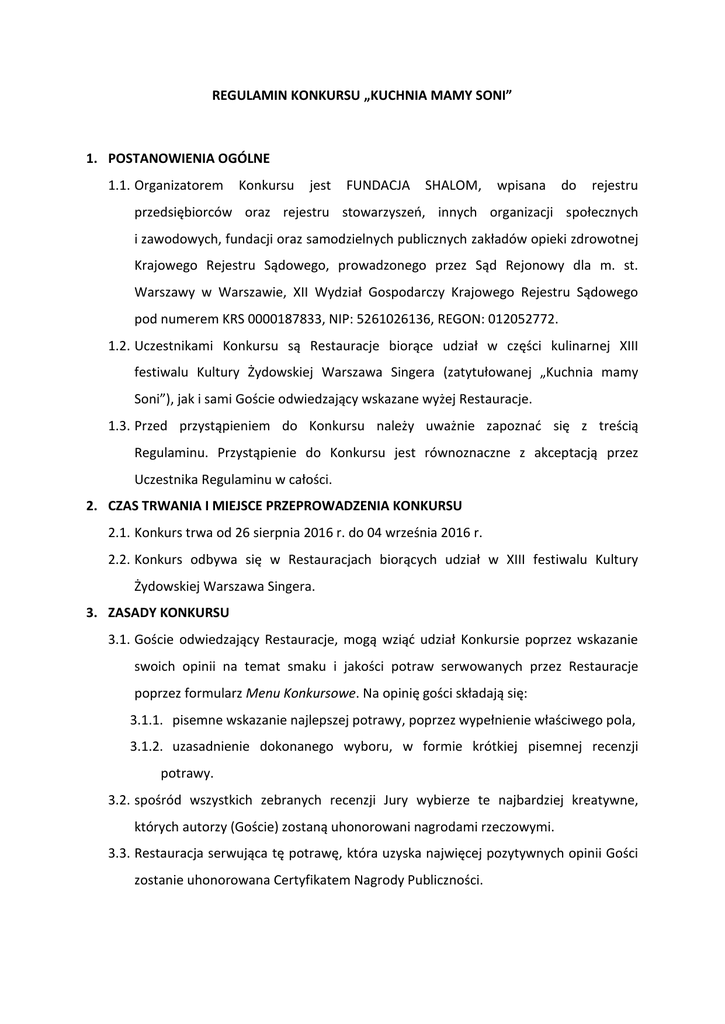 REGULAMIN KONKURSU „KUCHNIA MAMY SONI” 1. POSTANOWIENIA OGÓLNE 1.1. Organizatorem Konkursu jest FUNDACJA SHALOM, wpisana do rejestru przedsiębiorców oraz rejestru stowarzyszeń, innych organizacji społecznych i zawodowych, fundacji oraz samodzielnych publicznych zakładów opieki zdrowotnej Krajowego Rejestru Sądowego, prowadzonego przez Sąd Rejonowy dla m. st. Warszawy w Warszawie, XII Wydział Gospodarczy Krajowego Rejestru Sądowego pod numerem KRS 0000187833, NIP: 5261026136, REGON: 012052772. 1.2. Uczestnikami Konkursu są Restauracje biorące udział w części kulinarnej XIII festiwalu Kultury Żydowskiej Warszawa Singera (zatytułowanej „Kuchnia mamy Soni”), jak i sami Goście odwiedzający wskazane wyżej Restauracje. 1.3. Przed przystąpieniem do Konkursu należy uważnie zapoznać się z treścią Regulaminu. Przystąpienie do Konkursu jest równoznaczne z akceptacją przez Uczestnika Regulaminu w całości. 2. CZAS TRWANIA I MIEJSCE PRZEPROWADZENIA KONKURSU 2.1. Konkurs trwa od 26 sierpnia 2016 r. do 04 września 2016 r. 2.2. Konkurs odbywa się w Restauracjach biorących udział w XIII festiwalu Kultury Żydowskiej Warszawa Singera. 3. ZASADY KONKURSU 3.1. Goście odwiedzający Restauracje, mogą wziąć udział Konkursie poprzez wskazanie swoich opinii na temat smaku i jakości potraw serwowanych przez Restauracje poprzez formularz Menu Konkursowe. Na opinię gości składają się: 3.1.1. pisemne wskazanie najlepszej potrawy, poprzez wypełnienie właściwego pola, 3.1.2. uzasadnienie dokonanego wyboru, w formie krótkiej pisemnej recenzji potrawy. 3.2. spośród wszystkich zebranych recenzji Jury wybierze te najbardziej kreatywne, których autorzy (Goście) zostaną uhonorowani nagrodami rzeczowymi. 3.3. Restauracja serwująca tę potrawę, która uzyska najwięcej pozytywnych opinii Gości zostanie uhonorowana Certyfikatem Nagrody Publiczności. 3.4. Niezależnie od powyższego, Jury dokona również wyboru najlepszej potrawy na podstawie własnej oceny, a Restauracja która ją serwuje, otrzyma Certyfikat Nagrody Jury. 3.5. Decyzje Jury są ostateczne. 3.6. Ogłoszenie zwycięzców nastąpi 4 września o godzinie 15:00 na patio Cosmopolitan, przy ul. Twardej 4 w Warszawie. 4. OCHRONA DANYCH OSOBOWYCH 4.1. Dane Uczestników Konkursu będą przetwarzane przez Organizatora, w celach jego przeprowadzenia oraz wydania i odbioru nagród konkursowych (Certyfikatów). 4.2. Dane osobowe Uczestników Konkursu będą przetwarzane zgodnie z przepisami Ustawy z 29 sierpnia 1997 r. o ochronie danych osobowych (t.j.: Dz. U. z 2016 r., poz. 992). 4.3. Każdy z Uczestników ma prawo do wglądu do swoich danych osobowych, ich modyfikacji lub wykreślenia. 4.4. Dane osobowe podawane są na formularzu Menu Konkursowe na zasadzie dobrowolności – ich niepodanie uniemożliwia udział w Konkursie. 5. POSTANOWIENIA KOŃCOWE 5.1. Treść Regulaminu oraz Program Festiwalu dostępne są na stronie Organizatora: http://shalom.org.pl/, oraz w Restauracjach biorących udział w Konkursie. 5.2. W sprawach nieuregulowanych niniejszym Regulaminem będą miały zastosowanie przepisy powszechnie obowiązującego prawa, w szczególności Kodeksu cywilnego. 5.3. Konkurs nie jest grą losową w rozumieniu Ustawy z 19 listopada 2009 r. o grach hazardowych (t.j.: Dz. U. z 2016 r., poz. 471).