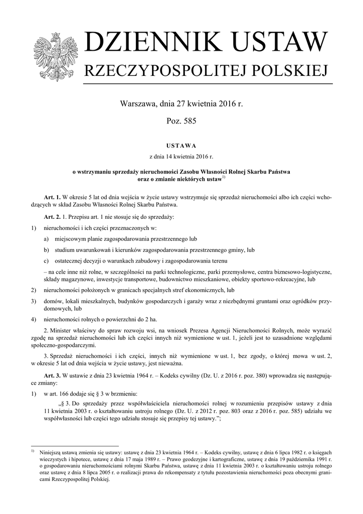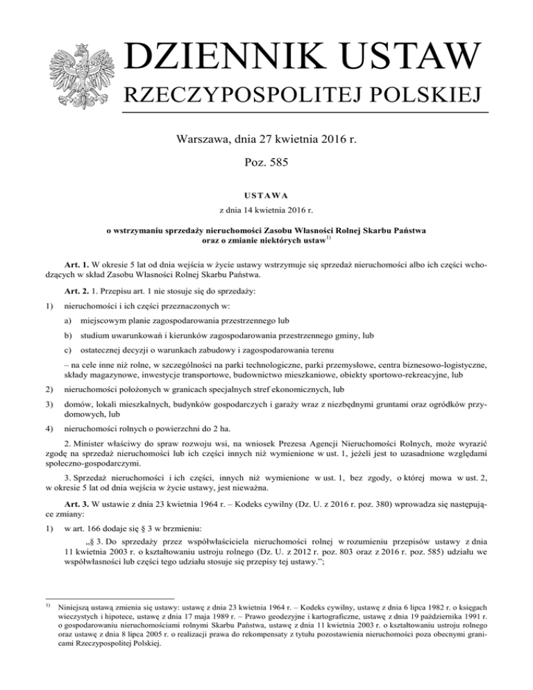 DZIENNIK USTAW RZECZYPOSPOLITEJ POLSKIEJ Warszawa, dnia 27 kwietnia 2016 r. Poz. 585 US T AW A z dnia 14 kwietnia 2016 r. o wstrzymaniu sprzedaży nieruchomości Zasobu Własności Rolnej Skarbu Państwa oraz o zmianie niektórych ustaw1) Art. 1. W okresie 5 lat od dnia wejścia w życie ustawy wstrzymuje się sprzedaż nieruchomości albo ich części wchodzących w skład Zasobu Własności Rolnej Skarbu Państwa. Art. 2. 1. Przepisu art. 1 nie stosuje się do sprzedaży: 1) nieruchomości i ich części przeznaczonych w: a) miejscowym planie zagospodarowania przestrzennego lub b) studium uwarunkowań i kierunków zagospodarowania przestrzennego gminy, lub c) ostatecznej decyzji o warunkach zabudowy i zagospodarowania terenu – na cele inne niż rolne, w szczególności na parki technologiczne, parki przemysłowe, centra biznesowo-logistyczne, składy magazynowe, inwestycje transportowe, budownictwo mieszkaniowe, obiekty sportowo-rekreacyjne, lub 2) nieruchomości położonych w granicach specjalnych stref ekonomicznych, lub 3) domów, lokali mieszkalnych, budynków gospodarczych i garaży wraz z niezbędnymi gruntami oraz ogródków przydomowych, lub 4) nieruchomości rolnych o powierzchni do 2 ha. 2. Minister właściwy do spraw rozwoju wsi, na wniosek Prezesa Agencji Nieruchomości Rolnych, może wyrazić zgodę na sprzedaż nieruchomości lub ich części innych niż wymienione w ust. 1, jeżeli jest to uzasadnione względami społeczno-gospodarczymi. 3. Sprzedaż nieruchomości i ich części, innych niż wymienione w ust. 1, bez zgody, o której mowa w ust. 2, w okresie 5 lat od dnia wejścia w życie ustawy, jest nieważna. Art. 3. W ustawie z dnia 23 kwietnia 1964 r. – Kodeks cywilny (Dz. U. z 2016 r. poz. 380) wprowadza się następujące zmiany: 1) w art. 166 dodaje się § 3 w brzmieniu: „§ 3. Do sprzedaży przez współwłaściciela nieruchomości rolnej w rozumieniu przepisów ustawy z dnia 11 kwietnia 2003 r. o kształtowaniu ustroju rolnego (Dz. U. z 2012 r. poz. 803 oraz z 2016 r. poz. 585) udziału we współwłasności lub części tego udziału stosuje się przepisy tej ustawy.”; 1) Niniejszą ustawą zmienia się ustawy: ustawę z dnia 23 kwietnia 1964 r. – Kodeks cywilny, ustawę z dnia 6 lipca 1982 r. o księgach wieczystych i hipotece, ustawę z dnia 17 maja 1989 r. – Prawo geodezyjne i kartograficzne, ustawę z dnia 19 października 1991 r. o gospodarowaniu nieruchomościami rolnymi Skarbu Państwa, ustawę z dnia 11 kwietnia 2003 r. o kształtowaniu ustroju rolnego oraz ustawę z dnia 8 lipca 2005 r. o realizacji prawa do rekompensaty z tytułu pozostawienia nieruchomości poza obecnymi granicami Rzeczypospolitej Polskiej. Dziennik Ustaw 2) –2– Poz. 585 w art. 172 dodaje się § 3 w brzmieniu: „§ 3. Nabyć nieruchomość rolną w rozumieniu przepisów ustawy, o której mowa w art. 166 § 3, przez zasiedzenie może jedynie rolnik indywidualny w rozumieniu przepisów tej ustawy, jeżeli – ustalona zgodnie z przepisami art. 5 ust. 2 i 3 tej ustawy – powierzchnia nabywanej nieruchomości rolnej wraz z nieruchomościami rolnymi stanowiącymi jego własność nie przekroczy 300 ha użytków rolnych.”; 3) w art. 210 dotychczasową treść oznacza się jako § 1 i dodaje się § 2 w brzmieniu: „§ 2. Zniesienie współwłasności nieruchomości rolnej oraz gospodarstwa rolnego w rozumieniu przepisów ustawy, o której mowa w art. 166 § 3, następuje z uwzględnieniem przepisów tej ustawy.”; 4) w art. 213 dotychczasową treść oznacza się jako § 1 i dodaje się § 2 w brzmieniu: „§ 2. Przyznanie przez sąd gospodarstwa rolnego w rozumieniu przepisów ustawy, o której mowa w art. 166 § 3, następuje z uwzględnieniem przepisów tej ustawy.”; 5) w art. 214 § 3 otrzymuje brzmienie: „§ 3. Na wniosek wszystkich współwłaścicieli sąd zarządzi sprzedaż gospodarstwa rolnego stosownie do przepisów Kodeksu postępowania cywilnego, a w przypadku gospodarstwa rolnego w rozumieniu przepisów ustawy, o której mowa w art. 166 § 3, z uwzględnieniem przepisów tej ustawy.”; 6) art. 10701 otrzymuje brzmienie: „Art. 10701. Do zbycia spadku lub części spadku lub udziału w spadku obejmującym gospodarstwo rolne lub nieruchomość rolną w rozumieniu przepisów ustawy, o której mowa w art. 166 § 3, stosuje się przepisy tej ustawy dotyczące zbycia nieruchomości rolnej.”. Art. 4. W ustawie z dnia 6 lipca 1982 r. o księgach wieczystych i hipotece (Dz. U. z 2013 r. poz. 707, z późn. zm.2)) wprowadza się następujące zmiany: 1) w art. 364 w ust. 8 w pkt 18 kropkę zastępuje się średnikiem i dodaje się pkt 19 w brzmieniu: „19) Agencja Nieruchomości Rolnych.”; 2) w art. 365 ust. 3 otrzymuje brzmienie: „3. Nie pobiera się opłat od wniosków o wydanie odpisu księgi wieczystej, wyciągu z księgi wieczystej, zaświadczenia o zamknięciu księgi wieczystej oraz wniosku o wyszukanie ksiąg wieczystych złożonego przez podmioty, o których mowa w art. 364 ust. 8 pkt 1–6, 8–17 oraz 19, lub organ administracji rządowej.”; 3) w art. 68 po ust. 2 dodaje się ust. 2a w brzmieniu: „2a. Suma hipoteki na nieruchomości rolnej w rozumieniu ustawy z dnia 11 kwietnia 2003 r. o kształtowaniu ustroju rolnego (Dz. U. z 2012 r. poz. 803 oraz z 2016 r. poz. 585) nie może przewyższać wartości rynkowej tej nieruchomości ustalonej na dzień ustanowienia hipoteki. Do wniosku o wpis hipoteki do księgi wieczystej dołącza się operat szacunkowy, sporządzony przez rzeczoznawcę majątkowego stosownie do przepisów o gospodarce nieruchomościami.”. Art. 5. W ustawie z dnia 17 maja 1989 r. – Prawo geodezyjne i kartograficzne (Dz. U. z 2015 r. poz. 520, z późn. zm.3)) w art. 24b w ust. 1 pkt 6 otrzymuje brzmienie: „6) udostępnianie organom administracji publicznej oraz innym podmiotom, realizującym zadania publiczne na podstawie odrębnych przepisów albo na skutek ich powierzenia lub zlecenia przez organ administr