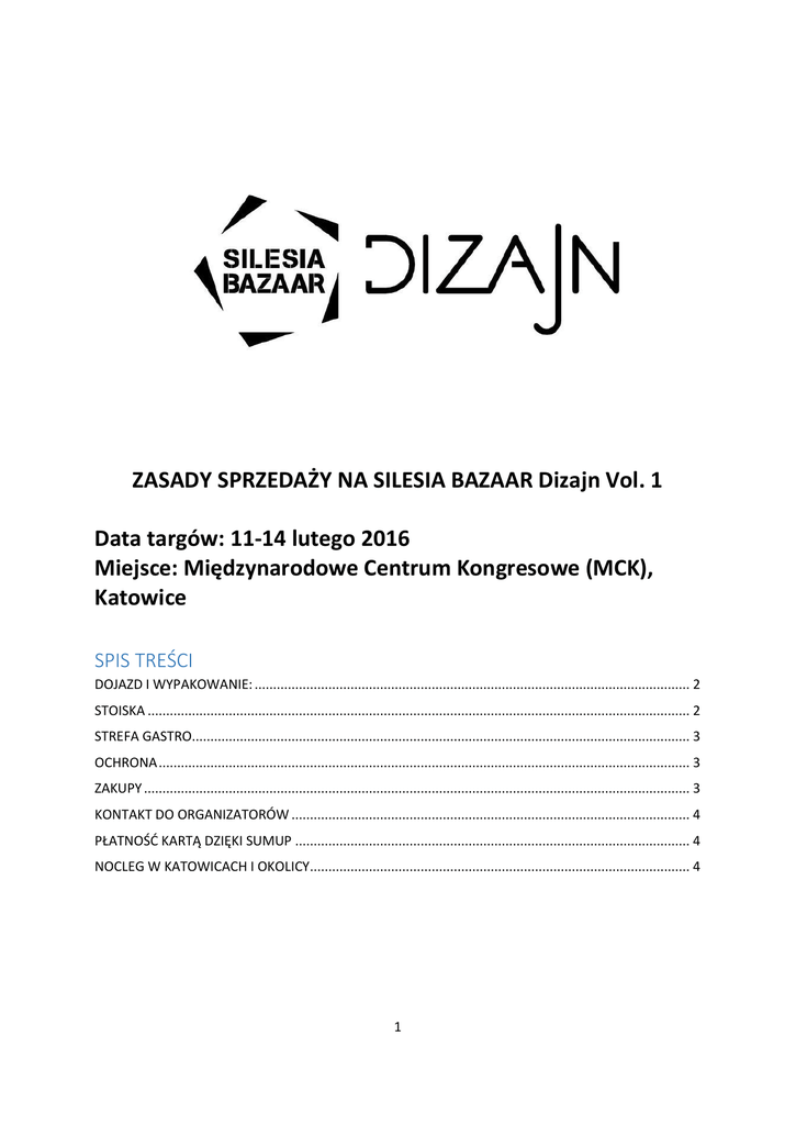 ZASADY SPRZEDAŻY NA SILESIA BAZAAR Dizajn Vol. 1 Data targów: 11-14 lutego 2016 Miejsce: Międzynarodowe Centrum Kongresowe (MCK), Katowice SPIS TREŚCI DOJAZD I WYPAKOWANIE: ...................................................................................................................... 2 STOISKA ................................................................................................................................................... 2 STREFA GASTRO....................................................................................................................................... 3 OCHRONA ................................................................................................................................................ 3 ZAKUPY .................................................................................................................................................... 3 KONTAKT DO ORGANIZATORÓW ............................................................................................................ 4 PŁATNOŚĆ KARTĄ DZIĘKI SUMUP ........................................................................................................... 4 NOCLEG W KATOWICACH I OKOLICY....................................................................................................... 4 1 DOJAZD I WYPAKOWANIE: Targi odbywają się w hali Międzynarodowego Centrum Kongresowego (MCK) w Katowicach w dniach 11-14 lutego br. (sobota/niedziela). Poniżej najważniejsze godziny: Rozkładanie stoisk: Wystawcy na 4 dni (11-14 lutego): Środa 10 lutego od godz 12:00 - 20:00 Czwartek 11 lutego od godz 7:00-9:00 Wystawcy na 2 dni (13-14 lutego): Piątek 12 lutego od godz 17:00 - 20:00 Sobota 13 lutego od godz 7:00 - 9:00 Demontaż stoisk: Niedziela 14 lutego od 18:30 - 24:00 (wystawcy nie mogą opuścić swoich stoisk wcześniej niż godz. 17:30 w niedzielę) Poniedziałek 15 lutego od 8:00 - 24:00. Sprzedaż Codziennie w godzinach 10:00 – 18:00 Opis sposobu wypakowania: Wystawcy podjeżdżają na parking techniczny pod MCK od strony ul. Olimpijskiej. Mapka dostępna do pobrania na MAPKA. Wjazd powinien być oznaczony znakami na imprezę 4 Design Days, a nie SB Dizajn. Na wjeździe musisz pokazać Wjazdówkę, którą możesz pobrać TUTAJ, wydrukować, wypełnić i wsadzić za przednią szybę. Na parkingu, w ustalonych powyżej godzinach będą czekać wolontariusze, którzy pomogą Ci odnaleźć stoisko. Parking znajduje się zaraz przy hali targowej, więc nie trzeba będzie nosić daleko towarów, ale sama hala ma 80 m długości, więc łącznie max trzeba będzie pokonać do 400 m po równym gruncie. Prosimy o zabranie swoich wózków transportowych. OGÓLNA UWAGA: 1. Każdy wystawca musi mieć Wjazdówkę, którą może pobrać TUTAJ, wydrukować, wypełnić i wsadzić za przednią szybę! 2. Każdy wystawca na początku otrzyma od wolontariusza identyfikator umożliwiający mu swobodne poruszanie się po terenie targów. Prosimy o upominanie się o identyfikatory, bo pracownicy ochrony będą ich wymagać przy wchodzeniu do budynku targów. 3. W rozpakowaniu i na targach będą wam pomagać wolontariusze. Pytajcie ich co i jak. Oni mają kontakt z organizatorami. Możecie też ich prosić o chwilowe 2 przypilnowanie towaru lub o odstawienie wózka. Wolontariusz to twój Przyjaciel STOISKA Kształty stoisk będą wyrysowane kredą na podłodze sali. Dodatkowo każde stoisko będzie opisane numerem. Każdy wystawca powinien mieć wydrukową mapkę (pobierz TUTAJ) i znać numer swojego stoiska. Lista przydzielonych stoisk będzie również umieszczona TUTAJ. Stoisko to „wolny kawałek podłogi”. Prosimy nie wykraczać poza wyznaczone stoisko! Na płycie jest dostęp do prądu, ale każdy z wystawców musi mieć ze sobą przedłużacz o długości min. 10m. Max moc do wykorzystania na stoisku to 200 W (laptop, telefon, kasa - OK). OFERTA NA ELEMENTY WYPOSAŻENIE STOISK Wystawcy mogą u Organizatora Głównego zamówić wyposażenie stoiska. Cennik i jednocześnie Formularz Zamówienie możesz pobrać TUTAJ, a wypełniony formularz odesłać na adres [email protected], powołując się na targi SB Dizajn – to ważne! W wiadomości do pracownika organizatora głównego 4 Design Days podaj swój nr stoiska. Do dyspozycji są m.in. stoły, krzesła i nawet lady do prezentacji biżuterii. Organizatorzy SB Dizajn nie dysponują tymi elementami na wynajem. Cennik i jednocześnie Formularz Zamówienie możesz pobrać TUTAJ. STREFA GASTRO Podczas targów będą funkcjonowały dwie Gastro Strefy zlokalizowane w naszej części targów oraz na głównych targach. Na strefach znajdziecie różnego rodzaju jedzenie i napoje. OCHRONA 1. Miejsce targów będzie pilnowała wyspecjalizowana firma ochroniarska. Prosimy o kierowanie się uwagami ochrony, bo są to osoby odpowiedzialne za nasze bezpieczeństwo. 2. Codziennie w nocy hala targowa będzie zamknięta i pilnowana z zewnątrz przez ochronę. W związku z tym można bezpiecznie zostawić swój towar na hali targowej. ZAKUPY Targi dla kupujących będą otwarte w godz. 10:00 – 18:00 (sobota/niedziela). Prosimy, aby wystawcy byli obecni codziennie na swoich stoiskach przynajmniej do godz. 17:30, żeby zapewnić odpowiednią jakość zakupów. Na targi obowiązuje dla kupujących opłata za wstęp.Opłata nie obowiązuje wystawców i ich współpracowników. PARKING DLA KUPUJĄCYCH Osoby kupujący muszą parkować na parkingu zlokalizowanym za siedzibą NOSPR oraz na placu przed Spodkiem. Znaki drogowe wskazują to miejsce. Wejście do MCK będzie z obu stron budynku (od strony Spodka i NOSPR). 3 WYDAWANIE PARAGONÓW Organizatorzy przygotowali specjalną promocję dla kupujących polegającą na tym, że każdy kupujący, który okaże się paragonami na kwotę min 300 zł otrzyma specjalną torbę na zakupy. Organizatorzy nie narzucają jak mają wyglądać paragony, ale odpowiedzialność karno-skarbowa za ich jakość