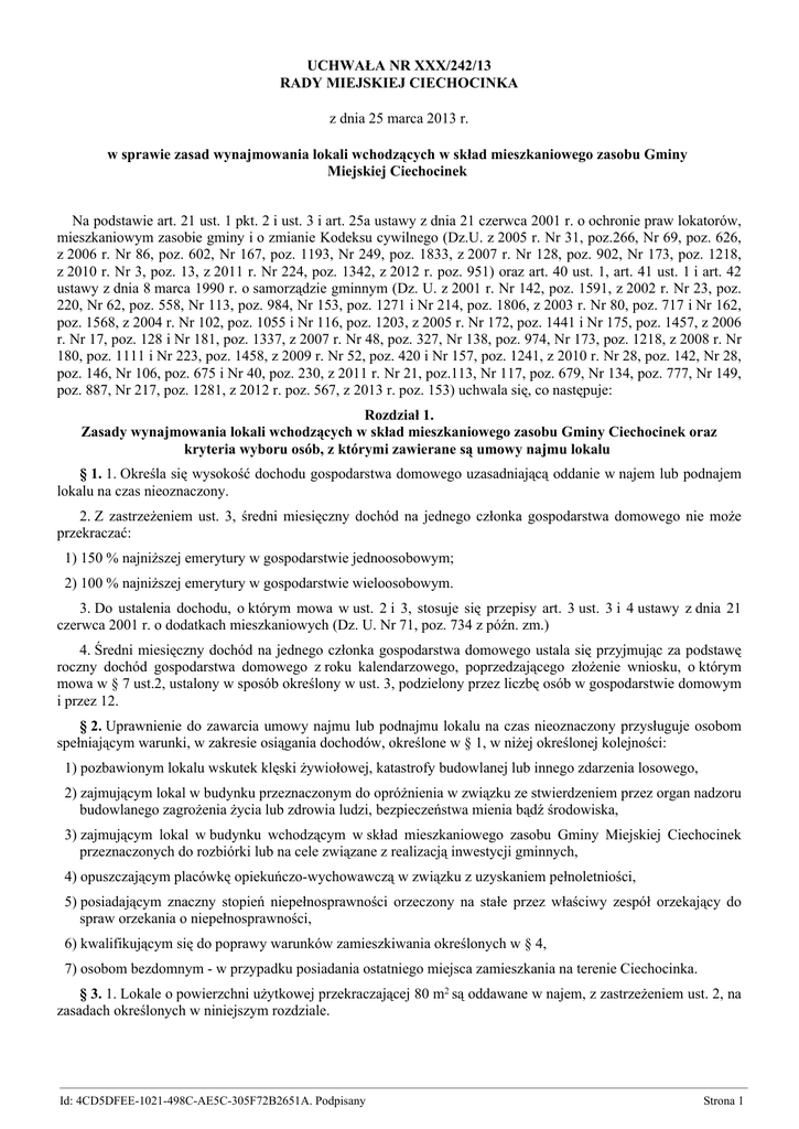 UCHWAŁA NR XXX/242/13 RADY MIEJSKIEJ CIECHOCINKA z dnia 25 marca 2013 r. w sprawie zasad wynajmowania lokali wchodzących w skład mieszkaniowego zasobu Gminy Miejskiej Ciechocinek Na podstawie art. 21 ust. 1 pkt. 2 i ust. 3 i art. 25a ustawy z dnia 21 czerwca 2001 r. o ochronie praw lokatorów, mieszkaniowym zasobie gminy i o zmianie Kodeksu cywilnego (Dz.U. z 2005 r. Nr 31, poz.266, Nr 69, poz. 626, z 2006 r. Nr 86, poz. 602, Nr 167, poz. 1193, Nr 249, poz. 1833, z 2007 r. Nr 128, poz. 902, Nr 173, poz. 1218, z 2010 r. Nr 3, poz. 13, z 2011 r. Nr 224, poz. 1342, z 2012 r. poz. 951) oraz art. 40 ust. 1, art. 41 ust. 1 i art. 42 ustawy z dnia 8 marca 1990 r. o samorządzie gminnym (Dz. U. z 2001 r. Nr 142, poz. 1591, z 2002 r. Nr 23, poz. 220, Nr 62, poz. 558, Nr 113, poz. 984, Nr 153, poz. 1271 i Nr 214, poz. 1806, z 2003 r. Nr 80, poz. 717 i Nr 162, poz. 1568, z 2004 r. Nr 102, poz. 1055 i Nr 116, poz. 1203, z 2005 r. Nr 172, poz. 1441 i Nr 175, poz. 1457, z 2006 r. Nr 17, poz. 128 i Nr 181, poz. 1337, z 2007 r. Nr 48, poz. 327, Nr 138, poz. 974, Nr 173, poz. 1218, z 2008 r. Nr 180, poz. 1111 i Nr 223, poz. 1458, z 2009 r. Nr 52, poz. 420 i Nr 157, poz. 1241, z 2010 r. Nr 28, poz. 142, Nr 28, poz. 146, Nr 106, poz. 675 i Nr 40, poz. 230, z 2011 r. Nr 21, poz.113, Nr 117, poz. 679, Nr 134, poz. 777, Nr 149, poz. 887, Nr 217, poz. 1281, z 2012 r. poz. 567, z 2013 r. poz. 153) uchwala się, co następuje: Rozdział 1. Zasady wynajmowania lokali wchodzących w skład mieszkaniowego zasobu Gminy Ciechocinek oraz kryteria wyboru osób, z którymi zawierane są umowy najmu lokalu § 1. 1. Określa się wysokość dochodu gospodarstwa domowego uzasadniającą oddanie w najem lub podnajem lokalu na czas nieoznaczony. 2. Z zastrzeżeniem ust. 3, średni miesięczny dochód na jednego członka gospodarstwa domowego nie może przekraczać: 1) 150 % najniższej emerytury w gospodarstwie jednoosobowym; 2) 100 % najniższej emerytury w gospodarstwie wieloosobowym. 3. Do ustalenia dochodu, o którym mowa w ust. 2 i 3, stosuje się przepisy art. 3 ust. 3 i 4 ustawy z dnia 21 czerwca 2001 r. o dodatkach mieszkaniowych (Dz. U. Nr 71, poz. 734 z późn. zm.) 4. Średni miesięczny dochód na jednego członka gospodarstwa domowego ustala się przyjmując za podstawę roczny dochód gospodarstwa domowego z roku kalendarzowego, poprzedzającego złożenie wniosku, o którym mowa w § 7 ust.2, ustalony w sposób określony w ust. 3, podzielony przez liczbę osób w gospodarstwie domowym i przez 12. § 2. Uprawnienie do zawarcia umowy najmu lub podnajmu lokalu na czas nieoznaczony przysługuje osobom spełniającym warunki, w zakresie osiągania dochodów, określone w § 1, w niżej określonej kolejności: 1) pozbawionym lokalu wskutek klęski żywiołowej, katastrofy budowlanej lub innego zdarzenia losowego, 2) zajmującym lokal w budynku przeznaczonym do opróżnienia w związku ze stwierdzeniem przez organ nadzoru budowlanego zagrożenia życia lub zdrowia ludzi, bezpieczeństwa mienia bądź środowiska, 3) zajmującym lokal w budynku wchodzącym w skład mieszkaniowego zasobu Gminy Miejskiej Ciechocinek przeznaczonych do rozbiórki lub na cele związane z realizacją inwestycji gminnych, 4) opuszczającym placówkę opiekuńczo-wychowawczą w związku z uzyskaniem pełnoletniości, 5) posiadającym znaczny stopień niepełnosprawności orzeczony na stałe przez właściwy zespół orzekający do spraw orzekania o niepełnosprawności, 6) kwalifikującym się do poprawy warunków zamieszkiwania określonych w § 4, 7) osobom bezdomnym - w przypadku posiadania ostatniego miejsca zamieszkania na terenie Ciechocinka. § 3. 1. Lokale o powierzchni użytkowej przekraczającej 80 m2 są oddawane w najem, z zastrzeżeniem ust. 2, na zasadach określonych w niniejszym rozdziale. ————————————————————————————————————————————————————————— Id: 4CD5DFEE-1021-498C-AE5C-305F72B2651A. Podpisany Strona 1 2. Dochód na osobę w rodzinie ubiegającego się o najem lokalu, o którym mowa w ust. 1, nie może przekraczać 150 % najniższej emerytury, a liczba członków gospodarstwa domowego uzasadnia, zgodnie z normami określonymi w ustawie, ubieganie się o lokal o takiej powierzchni. § 4. Określa się warunki zamieszkiwania kwalifikujące wnioskodawcę ubiegającego się o najem lub podnajem lokalu z mieszkaniowego zasobu Gminy Miejskiej Ciechocinek do ich poprawy: 1) zamieszkiwanie w lokalu nie spełniającym warunków do zamieszkania w nim ludzi ze względu na stan techniczny (lokal: w suterenie, na poddaszu, w baraku, zawilgocony, zagrzybiony); 2) zamieszkiwanie w lokalu, w którym powierzchnia mieszkalna (łączna powierzchnia pokoi) na członka gospodarstwa domowego nie spełnia norm określonych w ustawie. § 5. 1. Określa się wysokość dochodu gospodarstwa domowego uzasadniającą oddanie w najem lub podnajem lokalu socjalnego. 2. Średni miesięczny dochód na jednego członka gospodarstwa domowego nie może przekraczać: 1) 75 % najniższej emerytury w gospodarstwie osoby samotnie gospodarującej; 2) 50 % najniższej emerytury w gospodarstwie wieloosobowym. § 6. 1. Uprawnienie do zawarcia umowy najmu lub podnajmu lokalu socjalnego przysługuje osobom spełniającym warunki, w zakresie osiągania dochodów, określone w § 4 w niżej określonej kolejności: 1) zajmującym lokal w budynku przeznaczonym do opróżnienia w związku ze stwierdzeniem przez organ nadzoru budowlanego zagrożenia życia lub zdrowia ludzi, bezpieczeństwa mienia bądź środowiska; 2) posiadającym znaczny stopień niepełnosprawności orzeczony na stałe przez właściwy zespół orzekający do spraw orzekania o niepełnosprawności; 3) kwalifikującym się do poprawy warunków zamieszkiwania określonych w § 5; 4) bezdomnym, których ostatnim miejscem zamieszkania był Ciechocinek. 2. Do ustalenia wysokości dochodu,