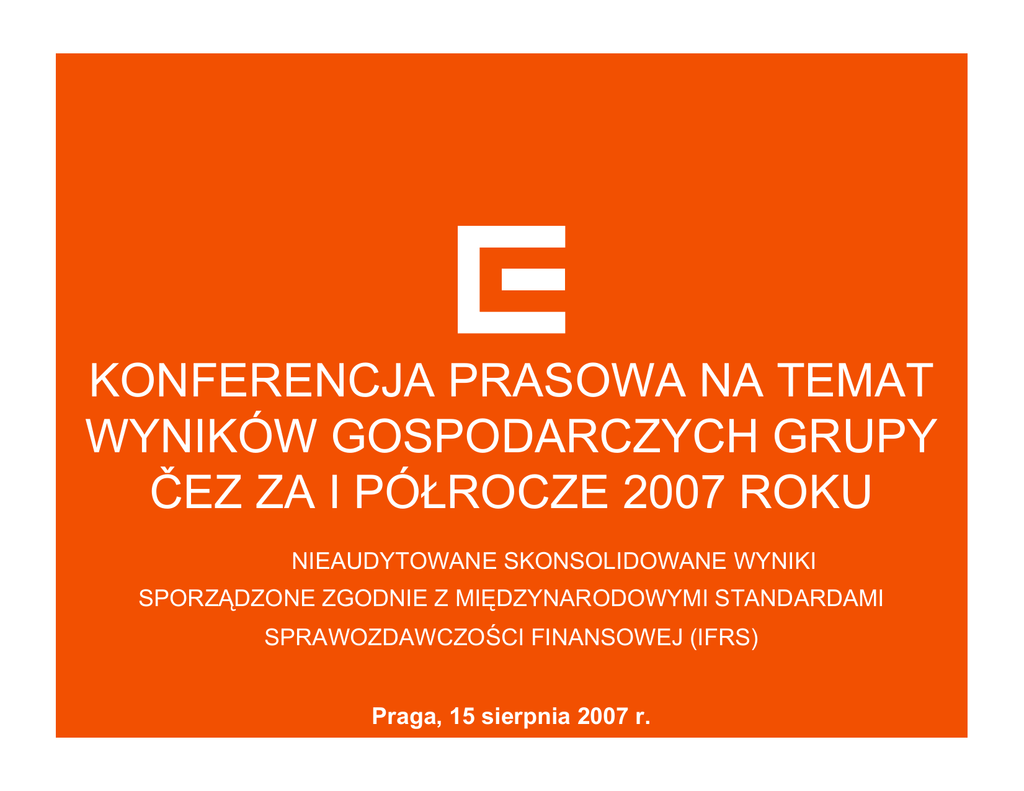 KONFERENCJA PRASOWA NA TEMAT WYNIKÓW GOSPODARCZYCH GRUPY ČEZ ZA I PÓŁROCZE 2007 ROKU NIEAUDYTOWANE SKONSOLIDOWANE WYNIKI SPORZĄDZONE ZGODNIE Z MIĘDZYNARODOWYMI STANDARDAMI SPRAWOZDAWCZOŚCI FINANSOWEJ (IFRS) Praga, 15 sierpnia 2007 r. PROGRAM Główne wyniki i wydarzenia w Grupie ČEZ za I półrocze 2007 r. Daniel Beneš, Dyrektor Wykonawczy Wyniki gospodarcze Petr Vobořil, Dyrektor Pionu Finansowego Pozycja handlowa Grupy ČEZ Alan Svoboda, Dyrektor Pionu Handlowego 1 GŁÓWNE WYNIKI ZA I PÓŁROCZE 2007 ROKU ORAZ OCZEKIWANIA DOTYCZĄCE WYNIKÓW W 2007 ROKU zysk operacyjny przed amortyzacją (EBITDA) wzrósł w stosunku do analogicznego okresu ubiegłego roku o 11,1 % do 38,2 miliarda CZK, czyli o 3,8 miliarda CZK zysk operacyjny (EBIT) wzrósł w stosunku do analogicznego okresu ubiegłego roku o 16,9 % do 27,3 miliarda CZK, o 3,9 miliarda CZK zysk netto wzrósł w stosunku do analogicznego okresu ubiegłego roku o 26,8 % do 21,0 miliarda CZK (wzrost o 4,4 miliarda CZK) rentowność kapitału własnego* wzrosła w stosunku do analogicznego okresu ubiegłego roku z 14,6 % do 17,2 %. cena akcji na BCPP oraz GPW na dzień 13. 08. 2007 wynosiła 1 110 CZK stan oczekiwany na 2007 rok: EBITDA w wysokości 70,9 miliarda CZK (wzrost o 10 %) oraz zysk netto w wysokości 35,1 miliarda CZK (wzrost o 22 %) * Dane wejściowe wyrażone za ostatnie 12 miesięcy. 2 OCZEKIWANE WYNIKI GOSPODARCZE W 2007 ROKU (BEZ UWZGLĘDNIENIA ODKUPU AKCJI) Główne wskaźniki finansowe w mld CZK + 28 % 80 60 EBITDA + 10 % 64,3 70 70,9 50,1 50 Pomimo spadku 40 30 20 10 0 2005 2006 60 + 21 % + 36 % 50 40 EBIT 2007E 48,5 40,1 29,4 30 20 10 0 2005 2006 + 22 % 40 35 ZYSK NETTO 30 25 2007E + 29 % 35,1 28,8 22,3 20 15 10 5 0 2005 2006 2007E popytu na energię elektryczną i ciepło oraz niższych cen hurtowych w I półroczu (w wyniku nadzwyczaj wysokiej temperatury powietrza), Grupa ČEZ podtrzymuje prognozy dotyczące wyników prognoz oczekiwanego stanu na tym samym poziomie. Spadek przychodów zostanie skompensowany przez działania mające na celu obniżenie kosztów. 3 AKCJE ČEZ, a. s., W DNIU 13. 08. 2007 ZAMKNĘŁY SIĘ NA 1 110 CZK 120% 30. 6. 2007 + 12 % 115% 110% 105% 13. 8. 2007 1 110 CZK 2. 1. 2007 991 CZK 1 096 CZK 100% 95% Walne zgromadzenie w dniu 23.04. uchwaliło dywidendę w wysokości 20 CZK/akcję brutto, wypłaty dywidend rozpoczęto 01. 08. 2007 Kapitalizacja rynkowa spółki ČEZ osiągnęła na dzień 13. 08. 2007 wartość 629 miliarda CZK. 90% 85% 80% styczeń 2007 luty 2007 marzec 2007 ČEZ, a. s. kwiecień 2007 maj 2007 czerwiec 2007 Bloomberg Utilities Index lipiec 2007 sierpień 2007 PX 4 ODKUP AKCJI Liczba odkupionych akcji na dzień 30. 06. 2007 mln sztuk (dane skumulowane) Liczba odkupionych akcji na dzień 13. 08. 2007 mln sztuk (dane skumulowane) 108,9 64,8 21,8 % 21,1 % 23,8 13,7 Liczba sztuk zakupionych akcji własnych od 30. 04. do 30.06. Wartość obrotu akcjami ČEZ, a. s., na BCPP oraz GPW ogółem Liczba sztuk zakupionych akcji własnych od 30.04. do 13.08. Wartość obrotu akcjami ČEZ, a. s., na BCPP oraz GPW ogółem Środki finansowe wydatkowane na odkup akcji od 30.4 do 13.8.: 25,7 miliarda CZK 5 WAŻNE WYDARZENIA W DRUGIM KWARTALE 2007 ROKU Fuzja REAS - w czerwcu zarząd ČEZ, a. s., podjął decyzję o fuzji poprzez połączenie z 5 byłymi regionalnymi spółkami energetycznymi (czeski skrót REAS). Następcą prawnym zostanie ČEZ, a. s., fuzję zaplanowano na 30 września 2007 r. z ważnością od 1 stycznia 2007 r. Zakończenie projektu WIZJA 2008 – 10 maja 2007 r., z ponad rocznym wyprzedzeniem. Od przyszłego roku oczekuje się oszczędności kosztów w wysokości 2,8 miliarda CZK/rok po przeliczeniu na bazę porównywalną z rokiem 2003, kiedy to zapoczątkowano przekształcenia. Podnoszenie efektywności – rozpoczęcie nowego programu skoncentrowanego na podwyższaniu wydajności produkcyjnej oraz podnoszeniu efektywności kosztów w kluczowych procesach w ramach całej Grupy ČEZ. Złożenie pozwu wobec spółki Mostecká uhelná a.s. (29 czerwca) – w związku z nie wywiązywaniem się ze zobowiązań wynikających z porozumienia zawartego w 2005 roku. Rząd rosyjski zadecydował o wyborze ČEZ, a. s., do realizacji budowy bloków parogazowych o mocy zainstalowanej 3 x 200 MW. Podpisano umowę wdrożeniową dotyczącą Gacko (16. 05. 2007) – projekt budowy nowej elektrowni Gacko II, modernizacja istniejącej elektrowni Gacko I oraz poszerzenie zakresu wydobycia w przyległej kopalni węgla, która będzie zaopatrywała w węgiel obydwie elektrownie. 6 UDZIAŁ W PRZETARGACH ZA GRANICĄ Bułgaria – przetarg na partnera strategicznego w projekcie Belene ČEZ, a. s., został zakwalifikowany do węższej grupy 6 kandydatów partnerstwo strategiczne ze spółką NEK odpowiada udziałowi w spółce Belene w wysokości do 49 % moc elektrowni jądrowej – 2 000 MW data składania zobowiązującej oferty wyznaczona została na 1 października 2007 r. Rumunia – przetarg na partnera strategicznego w projektach Borzeşti – budowa nowego bloku zasilanego gazem ziemnym lub węglem kamiennym Galaţi – budowa nowego bloku zasilanego gazem ziemnym lub węglem kamiennym, modernizacja istniejącej elektrowni o mocy 535 MW (3 x 105 MW, 2 x 60 MW, 1 x 100 MW) 7 PROGRAM Główne wyniki i wydarzenia w Grupie ČEZ za I półrocze 2007 r. Daniel Beneš, Dyrektor Wykonawczy Wyniki gospodarcze Petr Vobořil, Dyrektor Pionu Finansowego Pozycja handlowa Grupy ČEZ Alan Svoboda, Dyrektor Pionu Handlowego 8 ZYSK NETTO WZRÓSŁ W STOSUNKU DO ANALOGICZNEGO OKRESU UBIEGŁEGO ROKU O 4,4 MILIARDA- czyli o 27 % w mld CZK 30 8,4 25 0,0 0,6 2,6 20 0,1 5,2 1,5 1,0 1,5 15 10 16,6 + 4,4 mld CZK + 27 % 21,0 5 0 ZYSK NETTO Przychody Pozostałe Zezwolenia emisyjne 1 - 6 / 2006 ze sprzedaży przychody CO2 energii ze sprzedaży elektrycznej produktów (w tym i usług instrumenty (w tym ciepło pochodne i węgiel) z energii el.), netto Paliwo Marża brutto Inne koszty (tylko poza z produkcj