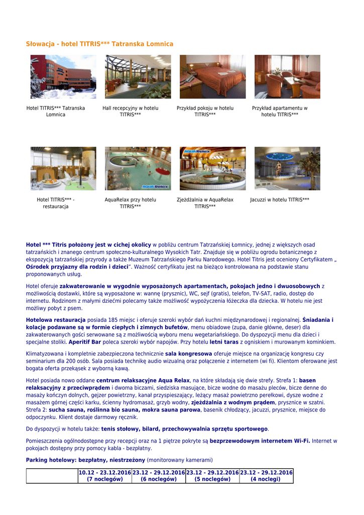 Słowacja - hotel TITRIS*** Tatranska Lomnica Hotel TITRIS*** Tatranska Lomnica Hall recepcyjny w hotelu TITRIS*** Przykład pokoju w hotelu TITRIS*** Przykład apartamentu w hotelu TITRIS*** Hotel TITRIS*** restauracja AquaRelax przy hotelu TITRIS*** Zjeżdżalnia w AquaRelax TITRIS*** Jacuzzi w hotelu TITRIS*** Hotel *** Titris położony jest w cichej okolicy w pobliżu centrum Tatrzańskiej Łomnicy, jednej z większych osad tatrzańskich i znanego centrum społeczno-kulturalnego Wysokich Tatr. Znajduje się w pobliżu ogrodu botanicznego z ekspozycją tatrzańskiej przyrody a także Muzeum Tatrzańskiego Parku Narodowego. Hotel Titris jest oceniony Certyfikatem „ Ośrodek przyjazny dla rodzin i dzieci”. Ważność certyfikatu jest na bieżąco kontrolowana na podstawie stanu proponowanych usług. Hotel oferuje zakwaterowanie w wygodnie wyposażonych apartamentach, pokojach jedno i dwuosobowych z możliwością dostawki, które są wyposażone w: wannę (prysznic), WC, sejf (gratis), telefon, TV-SAT, radio, dostęp do internetu. Rodzinom z małymi dziećmi polecamy także możliwość wypożyczenia łóżeczka dla dziecka. W hotelu nie jest możliwy pobyt z psem. Hotelowa restauracja posiada 185 miejsc i oferuje szeroki wybór dań kuchni międzynarodowej i regionalnej. Śniadania i kolacje podawane są w formie ciepłych i zimnych bufetów, menu obiadowe (zupa, danie główne, deser) dla zakwaterowanych gości serwowane są z możliwością wyboru menu wegetariańskiego. Do dyspozycji menu dla dzieci i specjalne stoliki. Aperitif Bar poleca szeroki wybór napojów. Przy hotelu letni taras z ogniskiem i murowanym kominkiem. Klimatyzowana i kompletnie zabezpieczona technicznie sala kongresowa oferuje miejsce na organizację kongresu czy seminarium dla 200 osób. Sala posiada technikę audio wizualną oraz połączenie z internetem (wi fi). Klientom oferowane jest bogata oferta przekąsek z wyborną kawą. Hotel posiada nowo oddane centrum relaksacyjne Aqua Relax, na które składają się dwie strefy. Strefa 1: basen relaksacyjny z przeciwprądem i dwoma biczami, siedziska masujące, bicze wodne do masażu pleców, bicze denne do masaży kończyn dolnych, gejzer powietrzny, kanał przyspieszający, leżący masaż powietrzno perełkowi, dysze wodne z masażem górnej części karku, ścienny hydromasaż, grzyb wodny, zjeżdżalnia z wodnym prądem, prysznice w szatni. Strefa 2: sucha sauna, roślinna bio sauna, mokra sauna parowa, basenik chłodzący, jacuzzi, prysznice, miejsce do odpoczynku. Klient dostaje darmowy ręcznik. Do dyspozycji w hotelu także: tenis stołowy, bilard, przechowywalnia sprzętu sportowego. Pomieszczenia ogólnodostępne przy recepcji oraz na 1 piętrze pokryte są bezprzewodowym internetem Wi-Fi. Internet w pokojach dostępny przy pomocy kabla - bezpłatny. Parking hotelowy: bezpłatny, niestrzeżony (monitorowany kamerami) 10.12 - 23.12.2016 23.12 - 29.12.2016 23.12 - 29.12.2016 23.12 - 29.12.2016 (7 noclegów) (6 noclegów) (5 noclegów) (4 noclegi) Osoba w pokoju 1 lub 2 osobowym 252 309 257 206 23.12 - 29.12.2016 29.12.16 - 02.01.17 02.01 - 11.03.2017 11.03 - 13.04.2017 (3 noclegów) (4 noclegi) (7 noclegów) (7 noclegów) Osoba w pokoju 1 lub 2 osobowym 154 290 315 269 13.04 - 18.04.2016 13.04 - 18.04.2017 13.04 - 18.04.2017 18.04 - 06.05.2017 (5 noclegów) (4 noclegi) (3 noclegi) (7 noclegów) Osoba w pokoju 1 lub 2 osobowym Osoba w pokoju 1 lub 2 osobowym 257 206 154 252 06.05 27.05.2017 (7 noclegów) 27.05 24.06.2017 (7 noclegów) 24.06 02.09.2017 (7 noclegów) 02.09 30.09.2017 (7 noclegów) 30.09 09.12.2017 (7 noclegów) 262 287 325 287 262 CENA OBEJMUJE: * 3/4/5/6/7 noclegów w pokoju 1 lub 2 osobowym * śniadania w formie ciepłego i zimnego bufetu * obiadokolacje w formie zimnego i ciepłego bufetu * 1 wejście do AquaRelax (pakiet 2 godzinny, strefa "mix"), kolejne wejścia z 40% zniżką * ubezpieczenie KL, NNW (bez ubezpieczenia narciarskiego) ZNIŻKI: * 100% zniżki - dziecko do 3 lat (bez świadczeń) * 100% zniżki - jedno dziecko do 8 lat śpiące na dostawce lub wspólnym łóżku (przy zakwaterowaniu z 2 osobami pełnopłatnymi) * 50% zniżki - dziecko 3-15 lat na dostawce * 30% zniżki - dziecko 3-15 lat na łóżku podstawowym * 20% zniżki - osoba powyżej 15 lat na dostawce SKRÓCENIE POBYTU (w wariantach nie ujętych w cenniku): * do 6 noclegów - 10% taniej (od ceny pobytu na 7 noclegów) * do 5 noclegów - 20% taniej (od ceny pobytu na 7 noclegów) * do 4 noclegów - 30% taniej (od ceny pobytu na 7 noclegów) DOPŁATY: - zakwaterowanie w pokoju 1 osobowym: GRATIS - wolne łóżko w pokoju 2 osobowym: 7 EUR (za każdy nocleg) - zakwaterowanie w apartamencie 2+1: 26,50 EUR (za każdy nocleg) - zakwaterowanie w apartamencie 2+1 plus: 33,20 EUR (za każdy nocleg) - obiad dla osoby dorosłej: 7,80 EUR - obiad dla dziecka do 15 lat: 6,20 EUR - taksa klimatyczna: 1 EUR za dzień (za osobę powyżej 18 lat) Pobyt z psem nie jest możliwy! Pytania? Sugestie? Rezerwacja? AGA TRAVEL Bielsko-Biała, Konfederatów Barskich 8/9, Tel. fax. +338 160 150, e-mail: [email protected], gg: 5389588