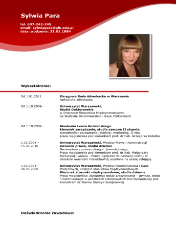 Sylwia Para tel. 607-242-245 email: [email protected] data urodzenia: 21.01.1984 .01.1 98 4 Wykształcenie: Od 1.01.2011 Okręgowa Rada Adwokacka w Warszawie Aplikantka adwokacka Od 1.10.2009- Uniwersytet Warszawski, Studia Doktoranckie w Instytucie Stosunków Międzynarodowych, na Wydziale Dziennikarstwa i Nauk Politycznych Od 1.10.2009- Akademia Leona Koźmińskiego kierunek zarządzanie, studia zaoczne II stopnia, specjalności: zarządzanie jakością i marketing, II rok; praca magisterska pod kierunkiem prof. dr hab. Grzegorza Kołodko 1.10.2004 – 15.06.2010 Uniwersytet Warszawski, Wydział Prawa i Administracji kierunek prawo, studia dzienne Seminarium z prawa rolnego i żywnościowego Praca magisterska pod kierunkiem prof. dr hab. Małgorzaty Korzyckiej-Iwanow - Prawo wyłączne do odmiany rośliny w obszarze własności intelektualnej oceniona na ocenę celującą. 1.10.2003 24.09.2008 Uniwersytet Warszawski, Wydział Dziennikarstwa i Nauk Politycznych, Instytut Stosunków Międzynarodowych Kierunek stosunki międzynarodowe, studia dzienne Praca magisterska: Europejski nakaz aresztowania – geneza, istota i implementacja w państwach członkowskich Unii Europejskiej pod kierunkiem dr Joanny Starzyk-Sulejewskiej Doświadczenie zawodowe: Od 15.10.2010 Centrum Badawcze Transformacji, Integracji i Globalizacji TIGER stażysta 01.11.200831.10.2009 Uniwersytet Warszawski, Starszy referent, Pełnomocnik Dyrekcji ISM ds. rekrutacji i promocji 13.03. 200720.12.2009 Viktonex Sp. Z.o.o / Kino Atlantic Specjalista ds. marketingu i reklamy 01.09.200601.09.2007 TVN 24 Archiwista Praktyki i straże: 1.07 – 15.07.2010 1.09 – 30.09.2009 Kancelaria Prawna Domino Praktykant 1.07- 21.07.2008 Prokuratura Rejonowa w Zakopanem Praktykant Publikacje Październik 2010 Sylwia Para, Perspektywy sterowania gospodarką światową po kryzysie [w:] Grzegorz Kołodko (red.) Globalizacja kryzys i co dalej Listopad 2010 Sylwia Para, W poszukiwaniu nowej formuły współpracy globalnej: od G7 do G20, [w:] Janusz Symonides (red.) Świat wobec współczesnych wyzwań i zagrożeń Działalność dodatkowa: 10.2004 – 05.2008 Samorząd Studencki Uniwersytetu Warszawskiego m.in.: Przewodnicząca Komisji Zagranicznej Zarządu Głównego Przewodnicząca Uczelnianej Komisji Wyborczej Senator Studencki Przewodnicząca Samorządu Instytutu Stosunków Międzynarodowych Przedstawiciel w Radzie Instytutu i Radzie Wydziału Znajomość języków obcych: Język angielski Bardzo dobra Język niemiecki Bardzo dobra Język hiszpański Podstawowa Umiejętności: Bardzo dobra znajomość obsługi komputera: Systemy operacyjne Windows, Pakiet MS Office (Word, Excel, Power Point), Prawo jazdy kat. B Zainteresowania: prawo żywnościowe, prawo własności intelektualnej, tennis ziemny, gospodarka światowa