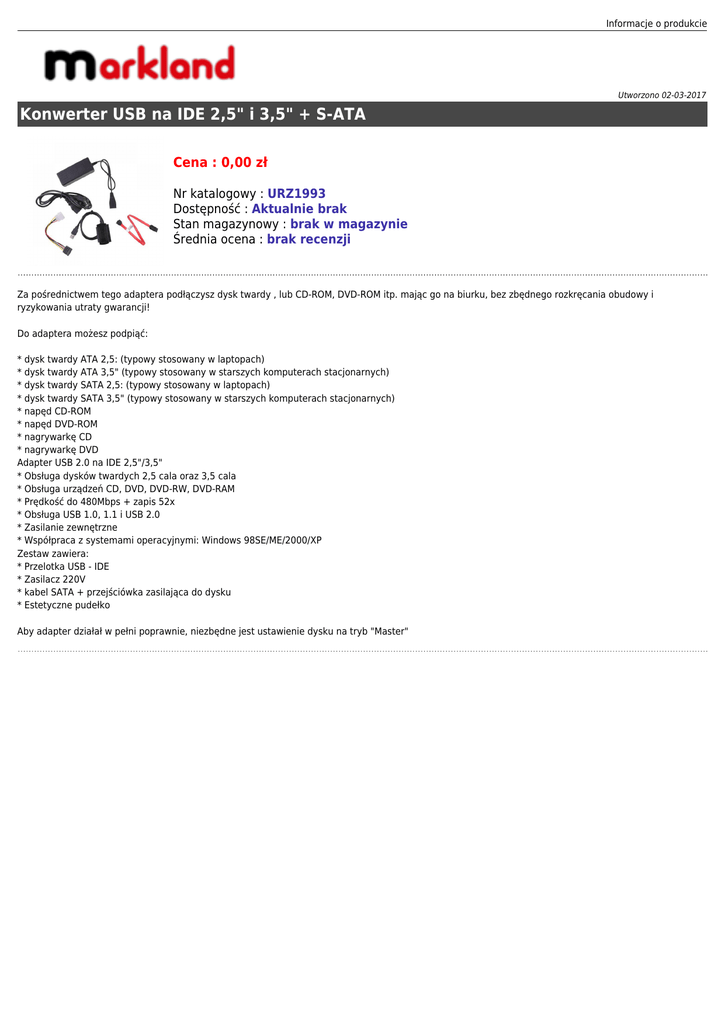 Informacje o produkcie Utworzono 02-03-2017 Konwerter USB na IDE 2,5" i 3,5" + S-ATA Cena : 0,00 zł Nr katalogowy : URZ1993 Dostępność : Aktualnie brak Stan magazynowy : brak w magazynie Średnia ocena : brak recenzji Za pośrednictwem tego adaptera podłączysz dysk twardy , lub CD-ROM, DVD-ROM itp. mając go na biurku, bez zbędnego rozkręcania obudowy i ryzykowania utraty gwarancji! Do adaptera możesz podpiąć: * dysk twardy ATA 2,5: (typowy stosowany w laptopach) * dysk twardy ATA 3,5" (typowy stosowany w starszych komputerach stacjonarnych) * dysk twardy SATA 2,5: (typowy stosowany w laptopach) * dysk twardy SATA 3,5" (typowy stosowany w starszych komputerach stacjonarnych) * napęd CD-ROM * napęd DVD-ROM * nagrywarkę CD * nagrywarkę DVD Adapter USB 2.0 na IDE 2,5"/3,5" * Obsługa dysków twardych 2,5 cala oraz 3,5 cala * Obsługa urządzeń CD, DVD, DVD-RW, DVD-RAM * Prędkość do 480Mbps + zapis 52x * Obsługa USB 1.0, 1.1 i USB 2.0 * Zasilanie zewnętrzne * Współpraca z systemami operacyjnymi: Windows 98SE/ME/2000/XP Zestaw zawiera: * Przelotka USB - IDE * Zasilacz 220V * kabel SATA + przejściówka zasilająca do dysku * Estetyczne pudełko Aby adapter działał w pełni poprawnie, niezbędne jest ustawienie dysku na tryb "Master"