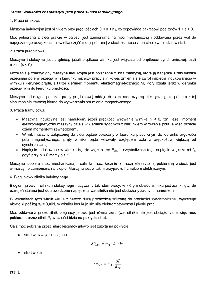 Temat: Wielkości charakteryzujące pracę silnika indukcyjnego. 1. Praca silnikowa. Maszyna indukcyjna jest silnikiem przy prędkościach 0 < n < n1, co odpowiada zakresowi poślizgów 1 > s > 0. Moc pobierana z sieci prawie w całości jest zamieniana na moc mechaniczną i oddawana przez wał do napędzanego urządzenia; niewielka część mocy pobranej z sieci jest tracona na ciepło w miedzi i w stali. 2. Praca prądnicowa. Maszyna indukcyjna jest prądnicą, jeżeli prędkość wirnika jest większa od prędkości synchronicznej, czyli n > n1 (s < 0). Może to się zdarzyć gdy maszyna indukcyjna jest połączona z inną maszyną, która ją napędza. Pręty wirnika przecinają pole w przeciwnym kierunku niż przy pracy silnikowej, zmienia się zwrot napięcia indukowanego w wirniku i kierunek prądu, a także kierunek momentu elektromagnetycznego M, który działa teraz w kierunku przeciwnym do kierunku prędkości. Maszyna indukcyjna podczas pracy prądnicowej oddaje do sieci moc czynną elektryczną, ale pobiera z tej sieci moc elektryczną bierną do wytworzenia strumienia magnetycznego. 3. Praca hamulcowa. Maszyna indukcyjna jest hamulcem, jeżeli prędkość wirowania wirnika n < 0, tzn. jeżeli moment elektromagnetyczny maszyny działa w kierunku zgodnym z kierunkiem wirowania pola, a więc przecie działa momentowi zewnętrznemu. Wirnik maszyny załączonej do sieci będzie obracany w kierunku przeciwnym do kierunku prędkości pola magnetycznego, pręty wirnika będą wirowały względem pola z prędkością większą od synchronicznej. Napięcie indukowane w wirniku będzie większe od E20, a częstotliwość tego napięcia większa od f1, gdyż przy n < 0 mamy s > 1. Maszyna pobiera moc mechaniczną i cała ta moc, łącznie z mocą elektryczną pobieraną z sieci, jest w maszynie zamieniana na ciepło. Maszyna jest w takim przypadku hamulcem elektrycznym. 4. Bieg jałowy silnika indukcyjnego. Biegiem jałowym silnika indukcyjnego nazywamy taki stan pracy, w którym obwód wirnika jest zamknięty, do uzwojeń stojana jest doprowadzone napięcie, a wał silnika nie jest obciążony żadnym momentem. W warunkach tych wirnik wiruje z bardzo dużą prędkością zbliżoną do prędkości synchronicznej, występuje niewielki poślizg s0 = 0,001, w wirniku indukuje się siła elektromotoryczna i płynie prąd. Moc oddawana przez silnik biegnący jałowo jest równa zeru (wał silnika nie jest obciążony), a więc moc pobierana przez silnik P0 w całości idzie na pokrycie strat. Cała moc pobrana przez silnik biegnący jałowo jest zużyta na pokrycie: strat w uzwojeniu stojana ∆ str.1 ∙ strat w stali ∆ ∙ ∙ strat mechanicznych Pm stąd ∆ ∆ ∆ Straty jałowe P0, które nie zależą od obciążenia ∆ ∆ Prąd jałowy w typowych maszynach indukcyjnych przy zasilaniu napięciem znamionowym wynosi: 0,25 0,5 ∙ Współczynnik mocy przy biegu jałowym: 0,1 0,2 Mały współczynnik mocy wskazuje, że silnik przy biegu jałowym pobiera z sieci niemal wyłącznie moc bierną indukcyjną. Znaczny w porównaniu ze znamionowym, prąd jałowy i mały współczynnik mocy stanowią zasadnicze wady silnika indukcyjnego. Pobierana przez silnik moc bierna: powoduje zwiększenie strat zasilania ogranicza pobór mocy ze źródła i sieci zasilającej UWAGA !!! SILNIKI INDUKCYJNE NIE OBCIĄŻONE POWINNY BYĆ WYŁĄCZONE Z SIECI. 5. Charakterystyka biegu jałowego. Przy zmianie napięcia zasilającego U1 zmienia się prąd I0, moc P0 pobierana z sieci i cos 0. str.2 6. Układ połączeń do badania silników indukcyjnych. Pomiary wykonuje się przy napięciu regulowanym od 1,3 UN do takiej wartości minimalnej przy której silnik zacznie wyraźnie zmniejszać prędkość obrotową. 7. Stan zwarcia silnika indukcyjnego. Stanem zwarcia silnika indukcyjnego nazywamy taki stan, w którym do uzwojenia stojana jest doprowadzone napięcie, a obwód wirnika jest zwarty i wirnik jest unieruchomiony. W takiej sytuacji n = 0, a więc s = 1, stąd prąd wirnika jest stosunkowo duży i może osiągnąć 4÷10 IN. Pobrana przez silnik w stanie zwarcia moc elektryczna jest w całości zamieniana na ciepło na skutek strat (moc mechaniczna nie jest wydawana, ponieważ wirnik się nie obraca). Całkowita moc pobrana Pz idzie na pokrycie strat obciążeniowych (w uzwojeniu stojana PCu1 i w uzwojeniu wirnika PCu2): ∆ ∆ Napięciem zwarcia uz maszyny indukcyjnej nazywamy takie napięcie, jakie należy doprowadzić do uzwojenia jednej ze stron, np. stojana, aby przy zwarciu uzwojenia drugiej strony i unieruchomionym wirniku popłynął prąd znamionowy po stronie zasilanej. Napięcie zwarcia, podobnie jak w transformatorze, podaje się w stosunku do napięcia znamionowego: ∙ 100 % Napięcie zwarcia typowych maszyn indukcyjnych wynosi 10÷25% UN. Jeżeli maszynę indukcyjną w stanie zwarcia zasilimy napięciem znamionowym, to pobiera ona prąd zwarciowy Iz = 4÷10 IN, a jeżeli zasilimy ją napięciem zwarcia, to pobiera prąd znamionowy. Zależność między prądem zwarciowym Iz, prądem znamionowym IN i napięciem zwarcia uz% jest następująca: ∙ 100 % W transformatorze stan zwarcia przy napięciu znamionowym występuje tylko jako stan awaryjny, natomiast w silnikach klatkowych występuje on przy każdym załączeniu (rozruchu) silnika do sieci, jeżeli nie stosuje się specjalnych urządzeń do obniżania napięcia. W silnikach pierścieniowych prąd zwarciowy (prąd rozruchowy) można zmniejszyć przez zwiększenie rezystancji obwodu wirnika. str.3 8. Stan obciążenia silnika indukcyjnego. Stan obciążenia silnika indukcyjnego występuje wtedy, gdy silnik jest sprzężony z maszyną napędzaną przy jednoczesnym zasilaniu uzwojenia stojana napięciem z sieci. W stanie obciążenia ustala się prędkość obrotowa wirnika, przy jakiej występuje równowaga momentu wydawanego przez silnik M i hamującego Mh. Przy każdej zmianie obciążenia moment wydawany przez silnik dostosowuje się d