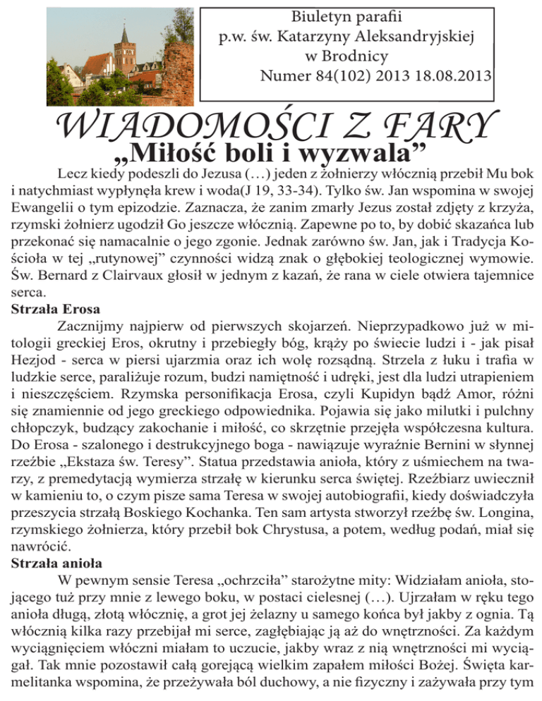 Biuletyn parafii p.w. św. Katarzyny Aleksandryjskiej w Brodnicy Numer 84(102) 2013 18.08.2013 WIADOMOŚCI Z FARY „Miłość boli i wyzwala” Lecz kiedy podeszli do Jezusa (…) jeden z żołnierzy włócznią przebił Mu bok i natychmiast wypłynęła krew i woda(J 19, 33-34). Tylko św. Jan wspomina w swojej Ewangelii o tym epizodzie. Zaznacza, że zanim zmarły Jezus został zdjęty z krzyża, rzymski żołnierz ugodził Go jeszcze włócznią. Zapewne po to, by dobić skazańca lub przekonać się namacalnie o jego zgonie. Jednak zarówno św. Jan, jak i Tradycja Kościoła w tej „rutynowej” czynności widzą znak o głębokiej teologicznej wymowie. Św. Bernard z Clairvaux głosił w jednym z kazań, że rana w ciele otwiera tajemnice serca. Strzała Erosa Zacznijmy najpierw od pierwszych skojarzeń. Nieprzypadkowo już w mitologii greckiej Eros, okrutny i przebiegły bóg, krąży po świecie ludzi i - jak pisał Hezjod - serca w piersi ujarzmia oraz ich wolę rozsądną. Strzela z łuku i trafia w ludzkie serce, paraliżuje rozum, budzi namiętność i udręki, jest dla ludzi utrapieniem i nieszczęściem. Rzymska personifikacja Erosa, czyli Kupidyn bądź Amor, różni się znamiennie od jego greckiego odpowiednika. Pojawia się jako milutki i pulchny chłopczyk, budzący zakochanie i miłość, co skrzętnie przejęła współczesna kultura. Do Erosa - szalonego i destrukcyjnego boga - nawiązuje wyraźnie Bernini w słynnej rzeźbie „Ekstaza św. Teresy”. Statua przedstawia anioła, który z uśmiechem na twarzy, z premedytacją wymierza strzałę w kierunku serca świętej. Rzeźbiarz uwiecznił w kamieniu to, o czym pisze sama Teresa w swojej autobiografii, kiedy doświadczyła przeszycia strzałą Boskiego Kochanka. Ten sam artysta stworzył rzeźbę św. Longina, rzymskiego żołnierza, który przebił bok Chrystusa, a potem, według podań, miał się nawrócić. Strzała anioła W pewnym sensie Teresa „ochrzciła” starożytne mity: Widziałam anioła, stojącego tuż przy mnie z lewego boku, w postaci cielesnej (…). Ujrzałam w ręku tego anioła długą, złotą włócznię, a grot jej żelazny u samego końca był jakby z ognia. Tą włócznią kilka razy przebijał mi serce, zagłębiając ją aż do wnętrzności. Za każdym wyciągnięciem włóczni miałam to uczucie, jakby wraz z nią wnętrzności mi wyciągał. Tak mnie pozostawił całą gorejącą wielkim zapałem miłości Bożej. Święta karmelitanka wspomina, że przeżywała ból duchowy, a nie fizyczny i zażywała przy tym szczęścia. A więc zbliżenie Boga, czyli miłości, rodzi ból i radość, ogałaca i wzbogaca człowieka.Św. Jan w swoim świadectwie spod krzyża odwołuje się do słów z księgi proroka Zachariasza, że lud w akcie skruchy patrzy na „przebitego” (por. Za 12, 10). Zranione Serce Jezusa, podobnie jak figura Berniniego, przeznaczone są do patrzenia i wyciągnięcia nauki. Nie zapominajmy też, że dla tego Ewangelisty krzyż jest tronem i aluzją do miedzianego węża, zatkniętego na pustyni przez Mojżesza. Spojrzenie w górę uzdrawia od śmiertelnego ukąszenia przez węże zesłane przez Boga na ziemię tuż po tym, jak Izraelici zaczęli szemrać i marudzić. Strzała Słowa Bożego W tym duchu św. Anzelm błagał, żeby jego serce zostało przebite Słowem Boga. Niewątpliwie biskup Canterbury nawiązuje tutaj do intuicji autora Listu do Hebrajczyków, który porównuje skuteczność Słowa Bożego do miecza obosiecznego, przenikającego w głąb ciała aż do „rozdzielenia stawów i szpiku” (por. Hbr 4, 12). Słowo jak lśniące ostrze zadaje bolesną ranę, która wręcz niemiłosiernie odsłania to, co człowiek pragnie ukryć. Wszystko jednak w tym celu, by oczyścić jego serce i przywrócić mu pokój. Wniosek z tego taki, że często działanie Boga, motywowane miłością, boli i uwiera. Przynajmniej w początkowej fazie uzdrowienia.Takie postawienie sprawy zadaje kłam potocznym wyobrażeniom o miłości, sprowadzającym ją jedynie do przyjemnego uczucia, chwilowego zauroczenia czy przeżycia seksualnego. Widok przebitego serca Chrystusa ma nas również uchronić przed postrzeganiem miłości jako miałkiego sentymentalizmu. Już pogańscy pisarze kojarzyli miłość z cierpieniem, z jakimś rodzajem szaleństwa, ze śmiercią. Chrystus, a później także wielu mistyków, miłość łączy z umieraniem, które jednakowoż daje życie. Jeśli chcesz kochać, musisz umrzeć - głosi jeden z ewangelicznych paradoksów. Jeśli ziarno pszenicy, wpadłszy w ziemię, nie obumrze, zostanie tylko samo. Oczywiście, chodzi o te dążenia, myśli i pragnienia serca, które koncentrują człowieka na sobie, utrzymują go w dziecinnym egoizmie, zorientowanym głównie na zaspokajanie własnych potrzeb. Interesujące, że według św. Teresy miłość rozpala się i osiąga swój szczyt, gdy człowiek zostaje zraniony. Wzrost duchowy, a więc przekroczenie własnego egoizmu, domaga się spotkania ze śmiercią, a także takich cnót, jak cierpliwość, wytrwałość i wierność. Tymczasem często ludzie wycofują się ze związków, kiedy tylko napotkają pierwsze trudności, gdyż sądzą, że nie tak powinny wyglądać sprawy z miłością. Porzucają powołanie, kiedy ich oczekiwania nie zostają spełnione. Przestają się modlić, jeśli nie odczuwają już wzruszeń i innych pozytywnych emocji. Zniechęcają się w czynieniu dobra, jeśli inni nie zauważają ich wysiłków i poświęcenia.Miłość ewangeliczna, odsłonięta w symboliczny sposób w przebitym Sercu Jezusa, chce nas poprowadzić dalej - na wyższy poziom. Tylko tam, gdzie pojawia się ofiarowanie siebie, życie może być pomnożone. Nie następuje to jednak od razu. Miłość, co zauważali już starożytni poeci i myśliciele, przechodzi wiele etapów, by kiedyś osiągnąć swój szczyt. Tak interpretuje ten końcowy efekt Benedykt XVI w encyklice Deus caritas est: w ostat