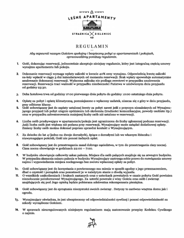 50'1t'40"N STRAlNICA I). 1''U'5f'E X Il ELE N I EC 43 REGULAMIN Aby zapewnić naszym Gościom spokojny i bezpieczny pobyt w apartamentach i pokojach, opracowaliśmy poniższy regulamin. 1. Gość, dokonując rezerwacji, jednocześnie akceptuje niniejszy regulamin, który jest integralną częścią umowy wynajmu apartamentu lub pokoju. 2. Dokonanie rezerwacji wymaga wpłaty zaliczki w kwocie 40% ceny wynajmu. Odpowiednią kwotę zaliczki należy wpłacić w ciągu 3 dni kalendarwwych od momentu rezerwacji. Brak wpłaty spowoduje automatyczne anulowanie dokonanej rezerwacji. Wpłacona zaliczka nie podlega zwrotowi w przypadku anulowania rezerwacji. Rezerwacja traci ważność w przypadku nieobecności Państwa w umówionym dniu przyjazdu od godziny 2g:30. 3. Doba hotelowa trwa od godziny 17:00 pierwszego dnia pobytu do godziny 10:00 ostatniego dnia pobytu. 4. Opłatę za pobyt i opłatę klimatyczną, pomniejszone o wpłacony zadatek, uiszcza się z góry w dniu przyjazdu, przy odbiorze kluczy. Gość zobowiązany jest do zapłaty ustalonej kwoty za pobyt nawet jeśli z przyczyn niezależnych od Wynajmu jącego przyjazd lub pobyt ulegnie opóźnieniu lub skróceniu (trudności komunikacyjne, powody osobiste itp.) oraz w przypadku zakwaterowania mniejszej liczby osób niż ustalono w rezerwacji. S. 6. Liczba osób przebywająca w apartamencie/pokoju jest ograniczona do liczby zgłoszonej podczas rezerwacji. Jeśli liczba osób jest większa niż podana przy rezerwacji, Wynajmujący może zażądać dodatkowej opłaty. Zmiany liczby osób można dokonać poprzez uprzedni kontakt z Wynajmującym. 7. Za dziecko do lat 4 Gedno na dwoje dorosłych), śpiące z dorosłymi lub we własnym łóżeczku i niewymagające pościeli, Gość nie ponosi żadnych opłat. 8. Gość zobowiązany jest do przestrzegania zasad dobrego sąsiedztwa, w tym do przestrzegania ciszy nocnej. Cisza nocna obowiązuje w godzinach 22:00 - 7:00. 9. W budynku obowiązuje całkowity zakaz palenia. Miejsce dla osób palących znajduje się na zewnątrz budynku. W przypadku złamania zakazu palenia w budynku Wynajmujący zastrzega sobie prawo do rozwiązania umowy najmu i wypowiedzenia miejsca noclegowego bez zwrotu wpłaconej opłaty za pobyt. 10. Gość zobowiązany jest do korzystania z powierzonego mu mienia w sposób zgodny z jego przeznaczeniem, dbać o czystość i porządek oraz pozostawić je w należytym stanie z chwilą wyjazdu. 11. O wszelkich uszkodzeniach i brakach zastanych oraz o usterkach powstałych w czasie pobytu Gość powinien niezwłocznie poinformować Wynajmującego. Za usterki powstałe z winy Gościa oraz osób i zwierząt znajdujących się pod Jego opieką będzie pobierana adekwatna rekompensata pieniężna. 12. Gość zobowiązany jest do sprzątania nieczystości swoich zwierząt . Dotyczy to zarówno wnętrza domu jak i ogrodu. 13. Wynajmujący oświadcza, że jest ubezpieczony od odpowiedzialności cywilnej i ponosi odpowiedzialność za szkody wyrządzone Gościom. 14. W sprawach nieuregulowanych niniejszym regulaminem mają zastosowanie przepisy Kodeksu Cywilnego o najmie.