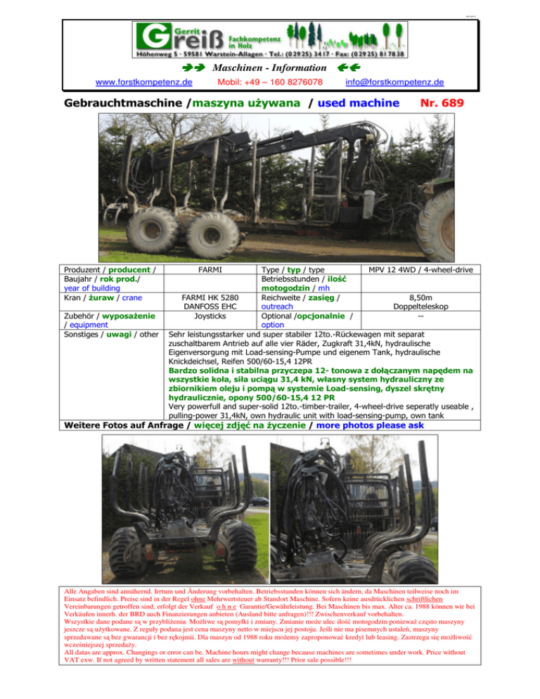 689-040513 Maschinen - Information www.forstkompetenz.de Mobil: +49 – 160 8276078 [email protected] Gebrauchtmaschine /maszyna uŜywana / used machine Produzent / producent / Baujahr / rok prod./ year of building Kran / Ŝuraw / crane Zubehör / wyposaŜenie / equipment Sonstiges / uwagi / other Nr. 689 FARMI Type / typ / type MPV 12 4WD / 4-wheel-drive Betriebsstunden / ilość motogodzin / mh FARMI HK 5280 Reichweite / zasięg / 8,50m DANFOSS EHC outreach Doppelteleskop Joysticks Optional /opcjonalnie / -option Sehr leistungsstarker und super stabiler 12to.-Rückewagen mit separat zuschaltbarem Antrieb auf alle vier Räder, Zugkraft 31,4kN, hydraulische Eigenversorgung mit Load-sensing-Pumpe und eigenem Tank, hydraulische Knickdeichsel, Reifen 500/60-15,4 12PR Bardzo solidna i stabilna przyczepa 12- tonowa z dołączanym napędem na wszystkie koła, siła uciągu 31,4 kN, własny system hydrauliczny ze zbiornikiem oleju i pompą w systemie Load-sensing, dyszel skrętny hydraulicznie, opony 500/60-15,4 12 PR Very powerfull and super-solid 12to.-timber-trailer, 4-wheel-drive seperatly useable , pulling-power 31,4kN, own hydraulic unit with load-sensing-pump, own tank Weitere Fotos auf Anfrage / więcej zdjęć na Ŝyczenie / more photos please ask Alle Angaben sind annähernd. Irrtum und Änderung vorbehalten. Betriebsstunden können sich ändern, da Maschinen teilweise noch im Einsatz befindlich. Preise sind in der Regel ohne Mehrwertsteuer ab Standort Maschine. Sofern keine ausdrücklichen schriftlichen Vereinbarungen getroffen sind, erfolgt der Verkauf o h n e Garantie/Gewährleistung. Bei Maschinen bis max. Alter ca. 1988 können wir bei Verkäufen innerh. der BRD auch Finanzierungen anbieten (Ausland bitte anfragen)!!! Zwischenverkauf vorbehalten. Wszystkie dane podane są w przybliŜeniu. MoŜliwe są pomyłki i zmiany. Zmianie moŜe ulec ilość motogodzin poniewaŜ często maszyny jeszcze są uŜytkowane. Z reguły podana jest cena maszyny netto w miejscu jej postoju. Jeśli nie ma pisemnych ustaleń, maszyny sprzedawane są bez gwarancji i bez rękojmii. Dla maszyn od 1988 roku moŜemy zaproponować kredyt lub leasing. Zastrzega się moŜliwość wcześniejszej sprzedaŜy. All datas are approx. Changings or error can be. Machine hours might change because machines are sometimes under work. Price without VAT exw. If not agreed by written statement all sales are without warranty!!! Prior sale possible!!!