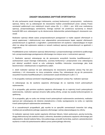 ZASADY SKŁADANIA ZAPYTAŃ OFERTOWYCH W celu zachowania zasad równego traktowania, uczciwej konkurencji i przejrzystości, realizatorzy operacji, którzy nie są zobowiązani do stosowania trybów przewidzianych przez ustawę Prawo zamówień publicznych oraz niektórych innych ustaw (Dz. U. z 2014 r. poz. 423) oraz realizatorzy operacji, przeprowadzający zamówienie, którego wartość nie przekracza wyrażonej w złotych kwoty30 000 euro zobowiązani są do dostarczenia dokumentów potwierdzających stosowanie ww. zasad. Realizator operacji składa wykaz przeprowadzonych postępowań w trybie zapytań ofertowych w wersji papierowej i elektronicznej oraz odpowiednio ponumerowane kopie zapytań ofertowych potwierdzonych za zgodność z oryginałem z potwierdzeniem ich wysłania i odpowiadające im kopie ofert na zakup lub wykonanie zadania w ramach realizacji operacji potwierdzonych za zgodność z oryginałem. Przedkładanie przez realizatora operacji dokumentacji z przeprowadzonego zamówienia publicznego lub z przeprowadzonego postępowania ofertowego ma miejsce wraz z rozliczeniem operacji. 1. Realizator operacji zobowiązuje się do ponoszenia wszystkich kosztów kwalifikowanych z zachowaniem zasad równego traktowania, uczciwej konkurencji i przejrzystości oraz zobowiązany jest dołożyć wszelkich starań w celu uniknięcia konfliktu interesów rozumianego jako brak bezstronności i obiektywności w wypełnianiu zadań. 2. Jeżeli realizator operacji nie jest zobowiązany do stosowania przepisów ustawy Pzp lub jest zwolniony z ich stosowania na mocy przepisów ustawy Pzp, zobowiązuje się go do ponoszenia wszystkich kosztów kwalifikowalnych z zachowaniem zasad określonych w pkt 1 i 3. 3. W przypadku realizacji zamówień niepodlegających przepisom ustawy Pzp realizator operacji: 1) zobowiązuje się do wysłania zapytania ofertowego do co najmniej trzech potencjalnych wykonawców; 2) w przypadku, gdy pomimo wysłania zapytania ofertowego do co najmniej trzech potencjalnych wykonawców, realizator operacji otrzyma tylko jedną ofertę, uznaje się zasadę konkurencyjności za spełnioną; 3) w przypadku, gdy na rynku nie istnieje trzech potencjalnych wykonawców zamówienia, realizator operacji jest zobowiązany do złożenia oświadczenia o braku występowania na rynku co najmniej trzech potencjalnych wykonawców zamówienia; 4) w uzasadnionych przypadkach, gdy wynika to ze specyfiki zamawianych towarów lub usług, możliwe jest przedłożenie jednego zapytania ofertowego i jednej odpowiadającej mu oferty; 5) realizator operacji może wysłać zapytanie ofertowe faksem, listem poleconym, pocztą kurierską, drogą elektroniczną lub osobiście złożyć u oferenta; dowodem przekazania zapytania ofertowego jest odpowiednio: dowód nadania faksu, listu poleconego, przesyłki kurierskiej, wydruk z potwierdzeniem wysłania e-maila lub pokwitowanie odbioru przez potencjalnego oferenta; 1 6) w zapytaniu ofertowym należy wyszczególnić wszystkie składowe przedmiotu zamówienia wraz z podaniem szczegółowej specyfikacji technicznej, w szczególności: przeznaczenie i funkcje przedmiotu zamówienia, dodatkowe wyposażenie, warunki dostawy, niestandardowe wykończenie; 7) kryteriami oceny ofert są cena albo cena i inne kryteria odnoszące się do przedmiotu zamówienia, w szczególności jakość, funkcjonalność, termin wykonania zamówienia; 8) kryteria wyboru najkorzystniejszej oferty nie mogą stanowić elementów nieuczciwej konkurencji, tj. nie mogą dyskryminować potencjalnych ofert, np. poprzez podanie takich kryteriów jak „dotychczasowa współpraca”, „renoma w branży”, „zaufanie, co do terminowości wykonania zadania i rzetelności dostawcy”, itp.; nie mogą dotyczyć właściwości wykonawcy, a w szczególności jego wiarygodności ekonomicznej, technicznej lub finansowej; 9) suma przyporządkowanych do poszczególnych kryteriów wartości cząstkowych musi stanowić 100%. Sposób formułowania kryteriów nie powinien ograniczać kręgu potencjalnych wykonawców do konkretnego usługodawcy/ dostawcy oraz ograniczać zasady równego traktowania i przejrzystości; 10) przedkładane oferty muszą odpowiadać treści zapytania ofertowego. Ponadto wskazane jest, by oferta zawierała inne dodatkowe informacje, jeżeli są wymagane, np. warunki płatności, możliwe do uzyskania upusty, kosztorys ofertowy, itp. Oferta musi być opatrzona pieczątką firmową i podpisem oferenta oraz zawierać datę sporządzenia; 11) oferta powinna być przesłana beneficjentowi za pośrednictwem poczty, kuriera, przesłana faksem, drogą elektroniczną lub przekazana osobiście; oferta powinna być ważna na dzień dokonywania zakupu usługi/dostawy; 12) realizator operacji wybiera najkorzystniejszą spośród złożonych ofert w oparciu o ustalone w zapytaniu ofertowym kryteria oceny; wybór oferty jest dokumentowany protokołem, do którego załączane są zebrane oferty; 13) cena podana w ofercie nie może zawierać kosztów ubezpieczenia, cła i akcyzy; 14) wszelkie czynności związane z realizacją zamówienia dokonuje się w formie pisemnej, przy czym dla udokumentowania czynności innych niż zawarcie umowy i sporządzenie protokołu z wyboru najkorzystniejszej oferty, dopuszczalna jest forma elektroniczna i faks; 15) w przypadku uzyskania ofert w walutach innych niż złote do przeliczenia kursu należy przyjąć kurs sprzedaży Narodowego Banku Polskiego z dnia wystawienia oferty. W przypadku, gdy NBP nie publikuje dla danej waluty kursów sprzedaży, do dokonywania przeliczeń należy zastosować kursy średnie NBP z dnia wystawienia oferty; 16) beneficjent realizator operacji, który w trakcie realizacji operacji zmieni oferenta, tj. wykonawcę, zobowiązany jest do przedłożenia wraz z rozliczeniem operacji pisemnego uzasadnienia konieczności dokonania zmiany. Realizator nie powinien wybrać oferty droższej niż wybrana w zapytaniu ofertowym. Jeśli wybra