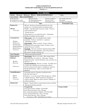 KURS ZASTEPOWYCH CHORAGIEW HARCEREK W STANACH ZJEDNOCZONYCH ZBIÓRKA #1 PLAN ZBIÓRKI Zbiórka: ozastepu odruzyny þhufca KURS ZASTEPOWYCH #1 Temat Zbiórki: ROLA ZASTEPOWEJ o Wychowanie þ Wiadomosci do stopni o Wiadomosci do sprawnosci Rozpoczecie Obrzed Twórczosc Cwiczenie/Gra Mundur Wodzostwo Schemat Org. Droga Sluzbowa Rada Druzyny Twórczosc Nowa Piosenka Zabawa lub Gra Ruchoma Zgranie Harcerek Twórczosc Gaweda/Rozmowa Raport Obrzed Twórczosc Zakonczenie þ Gry/Cwiczenia o Sluzba Bogu/Ojczyznie o Praca dla innych o P raca zarobkowa þ Prace reczne þ Piosenki, tance Plan Obrzed: Kazda uczestniczka podchodzi do stolu, wpisuje sie, i wyrabia kwiatek z przygotowoanej bibulki: stokrotki, fiolki, kaczence, maki. Przynosi swój kwiatek do kola. “Polskie Kwiaty” Uklad bukietu ze wszystkich kwiatów. Symbolizm: Kazda jest osobna i tworzy calosc. Pokaz mody. Dwie zle umundurowane, jedna porzadnie. Podczas “przebioru”, zaspiewac “Chodzilam po górze” Wódz indian. Jedna wychodzi. Calosc wybiera. Wykonuje ruch wybranego wodza. Ta która wyszla zgaduje która jest wodzem. Pyramida. Ulozenie schematu organizacyjnego ZHPpgk. Klockami lub ukladanka. Harcerki podstawa harcerstwa, zastepy, druzyny, itd. “Mysmy przyszloscia narodu” Wezel Ludzi. Zlaczyc sie razem. Musi zastep dzialac jako jednostka i sie rozkrecic. Dlaczego? Zastep dziala jako jedno. (Jezeli zabraknie czasu, przelozyc na zbiórke nr. 3) Wyscigi mundurem. Druzyny w rzedzie. Po jednej, leca i rysuja czesc munduru na wywieszonym arkuszu. Pierwsza druzyna narysujaca w kompliecie wygrywa. Kartki informacyjne: gdzie co mozna kupic do munduru. Po kazdym zajeciu 2 minutowe podsumowanie dlaczego bylo zajecie? Rozmowa: Co to jest zastep? Rola zastepowej. Udzial w Radzie Druzyny. Wybór zastepowej. Zastepowa wzbiera zastep. Moga sie wpierw poznac i dlatego sie wybiera na koncu. . Raport. Kazda zabiera swój kwiatek na koncu zbiórki. “Mysmy przyszloscia narodu” Przygotowaly: pwd. Kasia Gurba, Podhale, NJ/PA/MD pwd. Basia Pacyniak, Tatry, Chicago hm. Irena Dzierzbinska, Podhale, CT/NJ/PA/MD pion. Erika Królikowska, Tatry, Chicago trop. Kasia Glowaty, Tatry, Chicago Data: o Technika Harcerska þ Gaweda o Sprawy do zalatwienia Wykonanie/Uwagi Przeprowadzila: 28-go marca, 1999r. Zjazd Hufcowych, Chicago amnv:KZ2 Rola Zastepowej 032899 1 ZHP-pgK, Choragiew Harcerek w USA KURS ZASTEPOWYCH CHORAGIEW HARCEREK W STANACH ZJEDNOCZONYCH ZBIÓRKA #1 POLSKIE KWIATY Spiewa ci obcy wiatr, zachwyca wielki swiat A serce teskni. Bo gdzies daleko z tad zostal rodzinny dom, Tam jest najpiekniej Tam wlasnie teraz rozkwitly kwiaty Stokrotki, fiolki, kaczence i maki. Pod polskim niebem w szczerym polu wyrosly Ojczyste kwiaty. W ich zapachu, urodzie jest Polska. Zeby tak jeszcze raz ujrzec ojczysty las, Pola i laki. I do matczynych rak zaniesc z zielonych lak Rozkwitle paki. Bo najpiekniejsze sa polskie kwiaty Stokrotki, fiolki, kaczence i maki. Pod polskim niebem w szczerym polu wyrosly Ojczyste kwiaty. W ich zapachu, urodzie jest Polska. Spiewa ci obcy wiatr, tulaczy los cie gna Hen, gdzies po swiecie. Zabierz ze soba w swiat, zabierz z rodzinnych stron Maly bukiecik. Wez z ta piosenka bukiecik kwiatów Stokrotek, fiolków, kaczenców i maków. Pod polskim niebem w szczerym polu wyrosly Ojczyste kwiaty. W ich zapachu, urodzie jest Polska. MYSMY PRZYSZLOSCIA NARODU Mysmy przyszloscia narodu, piers nasza pelna jest sil Dazmy do wolnosci grodu, naprzód lecz nigdy w tyl Laurami przystrójmy glowy, nie znajmy w swem zyciu trwóg Polskiej Ojczyzny i mowy nie wydrze nam zaden wróg! Skrzydla zdobedzmy sokole, nauce poswiecmy czas A swiatlo zdobyte w szkole niesmy do ludu mas Laurami przystrójmy glowy, nie znajmy w swem zyciu trwóg Polskiej Ojczyzny i mowy nie wydrze nam zaden wróg! W kraju, gdy burza zawieje, gdy gromy hucza wsród burz W nas nie zagasly nadzieje choc ból sie wzartl do dusz Laurami przystrójmy glowy, nie znajmy w swem zyciu trwóg Polskiej Ojczyzny i mowy nie wydrze nam zaden wróg! amnv:KZ2 Rola Zastepowej 032899 2 ZHP-pgK, Choragiew Harcerek w USA KURS ZASTEPOWYCH CHORAGIEW HARCEREK W STANACH ZJEDNOCZONYCH ZBIÓRKA #1 CHODZILAM PO GÓRZE Chodzilam po górze i zbieralam róze, Nie widzialam skauta – w porzadnym mundurze. Bo kazdy z harcerzy ma za punkt honoru, By w jego mundurze nie poznac koloru. Bluza wyplowiala, spodnie polatane, Czapka z wentylacja – buty poszarpane. Dudni woda dudni w cembrowanej studni, Myja sie harcerze – lecz sa zawsze brudni. Wstydzcie sie harcerze, wygladac jak Antki, Patrzcie na harcerki – jakie elegantki! amnv:KZ2 Rola Zastepowej 032899 3 ZHP-pgK, Choragiew Harcerek w USA
