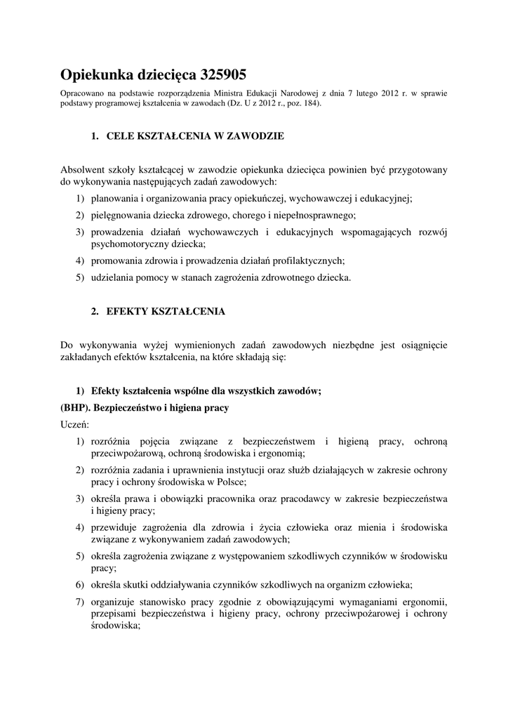 Opiekunka dziecięca 325905 Opracowano na podstawie rozporządzenia Ministra Edukacji Narodowej z dnia 7 lutego 2012 r. w sprawie podstawy programowej kształcenia w zawodach (Dz. U z 2012 r., poz. 184). 1. CELE KSZTAŁCENIA W ZAWODZIE Absolwent szkoły kształcącej w zawodzie opiekunka dziecięca powinien być przygotowany do wykonywania następujących zadań zawodowych: 1) planowania i organizowania pracy opiekuńczej, wychowawczej i edukacyjnej; 2) pielęgnowania dziecka zdrowego, chorego i niepełnosprawnego; 3) prowadzenia działań wychowawczych i edukacyjnych wspomagających rozwój psychomotoryczny dziecka; 4) promowania zdrowia i prowadzenia działań profilaktycznych; 5) udzielania pomocy w stanach zagrożenia zdrowotnego dziecka. 2. EFEKTY KSZTAŁCENIA Do wykonywania wyżej wymienionych zadań zawodowych niezbędne jest osiągnięcie zakładanych efektów kształcenia, na które składają się: 1) Efekty kształcenia wspólne dla wszystkich zawodów; (BHP). Bezpieczeństwo i higiena pracy Uczeń: 1) rozróżnia pojęcia związane z bezpieczeństwem przeciwpożarową, ochroną środowiska i ergonomią; i higieną pracy, ochroną 2) rozróżnia zadania i uprawnienia instytucji oraz służb działających w zakresie ochrony pracy i ochrony środowiska w Polsce; 3) określa prawa i obowiązki pracownika oraz pracodawcy w zakresie bezpieczeństwa i higieny pracy; 4) przewiduje zagrożenia dla zdrowia i życia człowieka oraz mienia i środowiska związane z wykonywaniem zadań zawodowych; 5) określa zagrożenia związane z występowaniem szkodliwych czynników w środowisku pracy; 6) określa skutki oddziaływania czynników szkodliwych na organizm człowieka; 7) organizuje stanowisko pracy zgodnie z obowiązującymi wymaganiami ergonomii, przepisami bezpieczeństwa i higieny pracy, ochrony przeciwpożarowej i ochrony środowiska; 8) stosuje środki ochrony indywidualnej i zbiorowej podczas wykonywania zadań zawodowych; 9) przestrzega zasad bezpieczeństwa i higieny pracy oraz stosuje przepisy prawa dotyczące ochrony przeciwpożarowej i ochrony środowiska; 10) udziela pierwszej pomocy poszkodowanym w wypadkach przy pracy oraz w stanach zagrożenia zdrowia i życia. (PDG). Podejmowanie i prowadzenie działalności gospodarczej Uczeń: 1) stosuje pojęcia z obszaru funkcjonowania gospodarki rynkowej; 2) stosuje przepisy prawa pracy, przepisy prawa dotyczące ochrony danych osobowych oraz przepisy prawa podatkowego i prawa autorskiego; 3) stosuje przepisy prawa dotyczące prowadzenia działalności gospodarczej; 4) rozróżnia przedsiębiorstwa i instytucje występujące w branży i powiązania między nimi; 5) analizuje działania prowadzone przez przedsiębiorstwa funkcjonujące w branży; 6) inicjuje wspólne przedsięwzięcia z różnymi przedsiębiorstwami z branży; 7) przygotowuje dokumentację niezbędną do uruchomienia i prowadzenia działalności gospodarczej; 8) prowadzi korespondencję związaną z prowadzeniem działalności gospodarczej; 9) obsługuje urządzenia biurowe oraz stosuje programy komputerowe wspomagające prowadzenie działalności gospodarczej; 10) planuje i podejmuje działania marketingowe prowadzonej działalności gospodarczej; 11) optymalizuje koszty i przychody prowadzonej działalności gospodarczej. (JOZ). Język obcy ukierunkowany zawodowo Uczeń: 1) posługuje się zasobem środków językowych (leksykalnych, gramatycznych, ortograficznych oraz fonetycznych), umożliwiających realizację zadań zawodowych; 2) interpretuje wypowiedzi dotyczące wykonywania typowych czynności zawodowych artykułowane powoli i wyraźnie, w standardowej odmianie języka; 3) analizuje i interpretuje krótkie teksty pisemne dotyczące wykonywania typowych czynności zawodowych; 4) formułuje krótkie i zrozumiałe wypowiedzi oraz teksty pisemne umożliwiające komunikowanie się w środowisku pracy; 5) korzysta z obcojęzycznych źródeł informacji. (KPS). Kompetencje personalne i społeczne Uczeń: 1) przestrzega zasad kultury i etyki; 2) jest kreatywny i konsekwentny w realizacji zadań; 3) przewiduje skutki podejmowanych działań; 4) jest otwarty na zmiany; 5) potrafi radzić sobie ze stresem; 6) aktualizuje wiedzę i doskonali umiejętności zawodowe; 7) przestrzega tajemnicy zawodowej; 8) potrafi ponosić odpowiedzialność za podejmowane działania; 9) potrafi negocjować warunki porozumień; 10) współpracuje w zespole. (OMZ). Organizacja pracy małych zespołów (wyłącznie dla zawodów nauczanych na poziomie technika) Uczeń: 1) planuje pracę zespołu w celu wykonania przydzielonych zadań; 2) dobiera osoby do wykonania przydzielonych zadań; 3) kieruje wykonaniem przydzielonych zadań; 4) ocenia jakość wykonania przydzielonych zadań; 5) wprowadza rozwiązania techniczne i organizacyjne wpływające na poprawę warunków i jakość pracy; 6) komunikuje się ze współpracownikami. 2) Efekty kształcenia wspólne dla zawodów w ramach obszaru medycznospołecznego, stanowiące podbudowę do kształcenia w zawodzie lub grupie zawodów PKZ(Z.a); PKZ(Z.a) Umiejętności stanowiące podbudowę do kształcenia w zawodach: opiekun medyczny, terapeuta zajęciowy, ortoptystka, opiekunka dziecięca, ratownik medyczny, technik masażysta, higienistka stomatologiczna, asystentka stomatologiczna, dietetyk, technik ortopeda, technik dentystyczny, protetyk słuchu, technik farmaceutyczny, technik sterylizacji medycznej, technik elektroradiolog, technik elektroniki i informatyki medycznej Uczeń: 1) wyjaśnia ogólną budowę i funkcje organizmu człowieka; 2) charakteryzuje podstawowe pojęcia z zakresu zdrowia oraz promocji i profilaktyki zdrowia; 3) przestrzega zasad promocji zdrowia i zdrowego stylu życia; 4) wyjaśnia pojęcia z zakresu patologii, charakteryzuje objawy i przyczyny zaburzeń oraz zmian chorobowych; 5) przestrzega zasad postępowania w przypadku podejrzenia występowania przemocy; 6) charakteryzuje stany nagłego zagrożenia życia; 7) dok