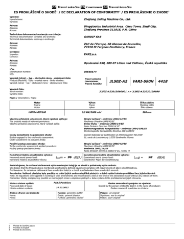CZ Travní sekačka EN Lawmower SK Travná kosačka ES PROHLÁŠENÍ O SHODĚ1 / EC DECLARATION OF CONFORMITY2 / ES PREHLÁSENIE O ZHODE3 Výrobce: Manufacturer: Výrobca: Zhejiang Jieling Machine Co., Ltd. Adresa: Address: Adresa: Dingqiaotou Industrial Area, Ciwu Town, Zhuji City, Zhejiang Province 311815, P.R. China Technickou dokumentaci sestavuje a archivuje: Technical documentation compiles and archives: Technicků dokumentáciu sestavuje a archivuje: GARDIF SAS Adresa: Address: Adresa: ZAC de l'Europe, 60 Abenue de Bruxelles, 77310 St Fargeau Ponthierry, France Dovozce: Importer: Dovozca: VARI,a.s. Adresa: Address: Adresa: Opolanská 350, 289 07 Libice nad Cidlinou, Česká republika IČO: Identification Number: IČO: 00660574 Výrobek (stroj) – typ – obchodní název - objednací číslo: Product (Machine) -Type – market name - Order number: Výrobok (stroj) – typ – obchoidné meno - objednávacie číslo: Travní sekačka Lawnmower Travná kosačka Výrobní číslo: Serial number: Výrobné číslo: JL50Z-A2 VARI-590H 4418 JL50Z-A22013090001 >> JL50Z-A22020129999 Popis / Description / Popis: Motor Engine Motor Výkon Power Výkon Šířka záběru Working width Šírka záberu: HONDA GCV160 3,3 kW/3600 min-1 508 mm Všechna příslušná ustanovení, která výrobek splňuje: The product meets all relevant provisions: Všechna príslušná ustanovenia, ktorá výrobok splňa: Strojní zařízení - směrnice 2006/42/ES Machinery Directive 2006/42/EC Emise hluku – směrnice 2000/14/ES Noise Emission Directive 2000/14/ EC Elektromagnetická kompatibilita - směrnice 2004/108/ES Electromagnetic Compatibility Directive 2004/108/EC Osoby zúčastněné na posouzení shody: Bodies engaged in the conformity assessment: Osoby zúčastnené na posúzení zhody: Societé Nationale de Certification et ďHomologation NO.0499 11, route de Luxembourg L-5230 Sandweiler, France Použitý postup posouzení shody: To the conformity assessment applied procedure: Použitý postup posúzenia zhody: Strojní zařízení - směrnice 2006/42/ES Machinery Directive 2006/42/EC Směrnice 2000/14/ES Noise Emission Directive 2000/14/ EC, Annex VI Naměřená hladina akustického výkonu: Measured sound power level: Nameraná hladina akustického výkonu: Garantovaná hladina akustického výkonu: Guaranteed sound power level: Garantierter Pegel der Schallleistung: LWAm = 96 dB(A) LWAg = 98 dB(A) Prohlašujeme, že zařízení definované výše uvedenými údaji je ve shodě s požadavky výše směrnic. We declare that the through above mentioned specifications defined equipment complies with requirements of above cited Directives. Prehlasujeme, že zariadenie definované hore uvedenými údaji je v zhodě s požiadavkami hore uvedených smerníc. Poznámka: Veškeré předpisy byly použity ve znění jejich změn a doplňků platných v době vydání tohoto prohlášení bez jejich citování. Note: All regulations were applied in wording of later amendments and modifications valid at the time of this declaration issue without any citation of them. Poznámka: Všetky predpisy byly použité ve zneniu jejich zmien a doplnkov platných v dobe vydania tohto prehlásenia bez jejich citovania. Místo a datum vydání: Place and date of issue: Miesto a datum vydania: Jméno: Bruno van Elslande Name: Meno: 1 2 3 Překlad do českého jazyka Translate to English Preklad do slovenčiny Fait á Ponthiery 10.12.2012 Funkce: generální ředitel Grade: general director Funkcia: generálný riaditeľ Osoba zmocněná k podpisu za výrobce: Signed by the person entitled to deal in in the name of producer: Osoba zmocnená k podpisu za výrobcu: Podpis: viz originál Signature: see to original Podpis: pozri original PL Kosiarka do trawy DEKLARACJA ZGODNOŚCI WE4 Producent:5 Zhejiang Jieling Machine Co., Ltd. Dingqiaotou Industrial Area, Ciwu Town, Zhuji City, Zhejiang Province 311815, P.R. China Adres: Dokumentację techniczną przechowuje GARDIF SAS ZAC de l'Europe, 60 Abenue de Bruxelles, 77310 St Fargeau Ponthierry, France Adres: Dystrybutor: VARI,a.s. Adres: Opolanská 350, 289 07 Libice nad Cidlinou, Česká republika NR IDENT.: 00660574 Wyrób (maszyna) - typ - nazwa handlowa - Numer porządkowy: Travní sekačka Lawnmower Travná kosačka Numery fabryczne: JL50Z-A2 VARI-590H 4418 JL50Z-A22013090001 >> JL50Z-A22020129999 Popis: Silnik Moc Szerokość pokosu HONDA GCV160 3,3 kW/3600 min-1 508 mm Wszystkie odpowiednie postanowienia, jakie wyrób spełnia: Strojní zařízení - směrnice 2006/42/ES Machinery Directive 2006/42/EC Emise hluku – směrnice 2000/14/ES Noise Emission Directive 2000/14/ EC Elektromagnetická kompatibilita - směrnice 2004/108/ES Electromagnetic Compatibility Directive 2004/108/EC Osoby uczestniczące w ocenie zgodności: Societé Nationale de Certification et ďHomologation NO.0499 11, route de Luxembourg L-5230 Sandweiler, France Użyte postępowanie przy ocenie zgodności: Strojní zařízení - směrnice 2006/42/ES Machinery Directive 2006/42/EC Směrnice 2000/14/ES Noise Emission Directive 2000/14/ EC, Annex VI Zmierzony poziom mocy akustycznej: LWAm = 96 dB(A) Gwarantowany poziom mocy akustycznej: LWAg = 98 dB(A) Oświadczamy, że urządzenie zdefiniowane za pośrednictwem wymienionych wyżej danych jest zgodne z wymaganiami podanych wyżej rozporządzeń i dyrektyw. Uwaga: Wszystkie przepisy zostały zastosowane w brzmieniu ich zmian i uzupełnień obowiązujących w czasie wydania niniejszej deklaracji bez ich cytowania. Miejsce i data wydania: Fait á Ponthiery Osoba upoważniona do podpisania w imieniu producenta: 10.12.2012 Imię: Bruno van Elslande 4 5 Stanowisko: general director Podpis: patrz oryginał Ttłumaczeniem na język polski Producent zbiera przechovuje wszystkich dokumentację techniczną wszystkich dyrektyw, odpowiednio rozporządzenie rządu, odnoszącą się do deklaracji zgodności z wymocami WE