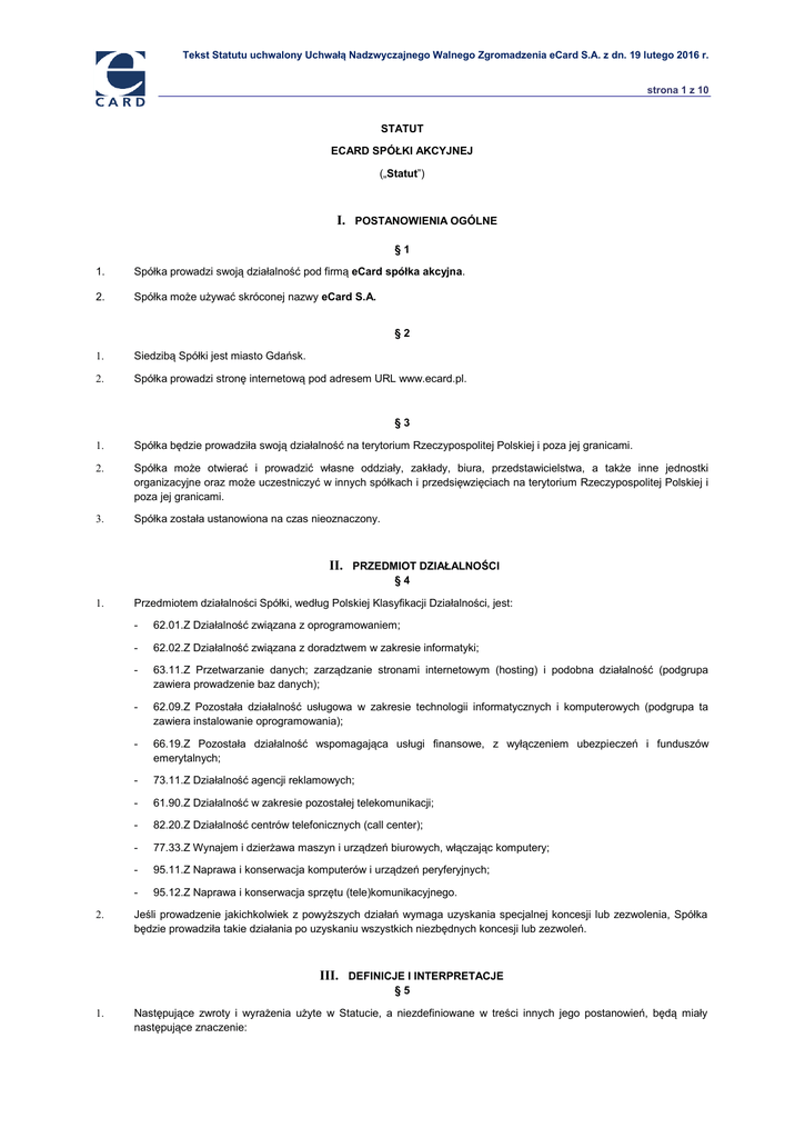 Tekst Statutu uchwalony Uchwałą Nadzwyczajnego Walnego Zgromadzenia eCard S.A. z dn. 19 lutego 2016 r. strona 1 z 10 STATUT ECARD SPÓŁKI AKCYJNEJ („Statut”) I. POSTANOWIENIA OGÓLNE §1 1. Spółka prowadzi swoją działalność pod firmą eCard spółka akcyjna. 2. Spółka może używać skróconej nazwy eCard S.A. §2 1. Siedzibą Spółki jest miasto Gdańsk. 2. Spółka prowadzi stronę internetową pod adresem URL www.ecard.pl. §3 1. Spółka będzie prowadziła swoją działalność na terytorium Rzeczypospolitej Polskiej i poza jej granicami. 2. Spółka może otwierać i prowadzić własne oddziały, zakłady, biura, przedstawicielstwa, a także inne jednostki organizacyjne oraz może uczestniczyć w innych spółkach i przedsięwzięciach na terytorium Rzeczypospolitej Polskiej i poza jej granicami. 3. Spółka została ustanowiona na czas nieoznaczony. II. PRZEDMIOT DZIAŁALNOŚCI §4 1. 2. Przedmiotem działalności Spółki, według Polskiej Klasyfikacji Działalności, jest: - 62.01.Z Działalność związana z oprogramowaniem; - 62.02.Z Działalność związana z doradztwem w zakresie informatyki; - 63.11.Z Przetwarzanie danych; zarządzanie stronami internetowym (hosting) i podobna działalność (podgrupa zawiera prowadzenie baz danych); - 62.09.Z Pozostała działalność usługowa w zakresie technologii informatycznych i komputerowych (podgrupa ta zawiera instalowanie oprogramowania); - 66.19.Z Pozostała działalność wspomagająca usługi finansowe, z wyłączeniem ubezpieczeń i funduszów emerytalnych; - 73.11.Z Działalność agencji reklamowych; - 61.90.Z Działalność w zakresie pozostałej telekomunikacji; - 82.20.Z Działalność centrów telefonicznych (call center); - 77.33.Z Wynajem i dzierżawa maszyn i urządzeń biurowych, włączając komputery; - 95.11.Z Naprawa i konserwacja komputerów i urządzeń peryferyjnych; - 95.12.Z Naprawa i konserwacja sprzętu (tele)komunikacyjnego. Jeśli prowadzenie jakichkolwiek z powyższych działań wymaga uzyskania specjalnej koncesji lub zezwolenia, Spółka będzie prowadziła takie działania po uzyskaniu wszystkich niezbędnych koncesji lub zezwoleń. III. DEFINICJE I INTERPRETACJE §5 1. Następujące zwroty i wyrażenia użyte w Statucie, a niezdefiniowane w treści innych jego postanowień, będą miały następujące znaczenie: Tekst Statutu uchwalony Uchwałą Nadzwyczajnego Walnego Zgromadzenia eCard S.A. z dn. 19 lutego 2016 r. strona 2 z 10 „Akcja” oznacza każdą istniejącą akcję wyemitowaną przez Spółkę; „Akcjonariusz” oznacza akcjonariusza Spółki; „dzień roboczy” oznacza każdy dzień tygodnia od poniedziałku do piątku z wyłączeniem dni ustawowo wolnych od pracy w Rzeczypospolitej Polskiej; „Kontrola”, „Kontrolujący” oznacza każdą formę bezpośredniego lub pośredniego posiadania przez dany podmiot uprawnień wobec innego podmiotu („Podmiot Zależny”), które osobno albo łącznie, przy uwzględnieniu wszystkich okoliczności prawnych lub faktycznych, umożliwiają wywieranie decydującego wpływu na inny podmiot lub podmioty; uprawnienia takie tworzą w szczególności: 1) dysponowanie bezpośrednio lub pośrednio większością 50%+1 głosów odpowiednio na zgromadzeniu wspólników albo na walnym zgromadzeniu, albo zgromadzeniu inwestorów funduszu inwestycyjnego, także jako zastawnik albo użytkownik, bądź w innym organie Podmiotu Zależnego, także na podstawie porozumienia z innym podmiotem (porozumień z innymi podmiotami); 2) uprawnienie do powoływania lub odwoływania większości członków zarządu lub rady nadzorczej Podmiotu Zależnego, także na podstawie porozumienia z innym podmiotem (porozumień z innymi podmiotami); 3) członkowie jego zarządu lub rady nadzorczej stanowią połowę lub więcej członków zarządu lub rady nadzorczej Podmiotu Zależnego; 4) dysponowanie bezpośrednio lub pośrednio większością głosów w spółce osobowej albo na walnym zgromadzeniu spółdzielni (jako Podmiotów Zależnych), także na podstawie porozumienia z innym podmiotem (porozumień z innymi podmiotami); 5) umowa przewidująca powierzenie zarządzania Podmiotem Zależnym lub przekazywanie zysku przez Podmiot Zależny; „KRS” oznacza rejestr Sądowego; przedsiębiorców Krajowego Rejestru „Obciążenie” oznacza zastaw, hipotekę, inne zabezpieczenie lub obciążenie in rem lub in personam, powstałe zgodnie z polskim lub innym prawem, umowne lub z mocy prawa, w tym prawo pierwszeństwa/pierwokupu lub jakiekolwiek inne obciążenie na rzecz osób trzecich o charakterze rzeczowym lub obligacyjnym; „Organ” każdy organ administracji publicznej, w szczególności organ jednostki samorządu terytorialnego i organ administracji rządowej oraz każdy inny państwowy lub samorządowy organ, służba, podmiot lub inna jednostka organizacyjna, która jest powołana z mocy prawa lub na podstawie porozumień do załatwiania spraw indywidualnych rozstrzyganych w drodze decyzji administracyjnych lub sprawowania kontroli; każdy sąd powszechny, Sąd Najwyższy, sąd administracyjny (wojewódzki sąd administracyjny lub Naczelny Sąd Administracyjny), komornik sądowy, organ egzekucyjny, organ podatkowy, organ kontroli skarbowej oraz każdy inny organ lub sąd powołany z mocy prawa do rozstrzygnięcia, rozpoznawania lub egzekwowania spraw lub roszczeń danego rodzaju (w szczególności spraw cywilnych lub spraw administracyjnych); Celem uchylenia wątpliwości definicja Organu odnosi się Tekst Statutu uchwalony Uchwałą Nadzwyczajnego Walnego Zgromadzenia eCard S.A. z dn. 19 lutego 2016 r. strona 3 z 10 również do Komisji Nadzoru Finansowego; „Osoba trzecia” każda osoba fizyczna, osoba prawna lub jednostka organizacyjna niemająca osobowości prawnej, której ustawa przyznaje zdolność prawną, niebędąca Akcjonariuszem; „Podmiot Stowarzyszony” oznacza: 1) 2) w odniesieniu do Akcjonariusza i Osoby trzeciej (niebędących osob