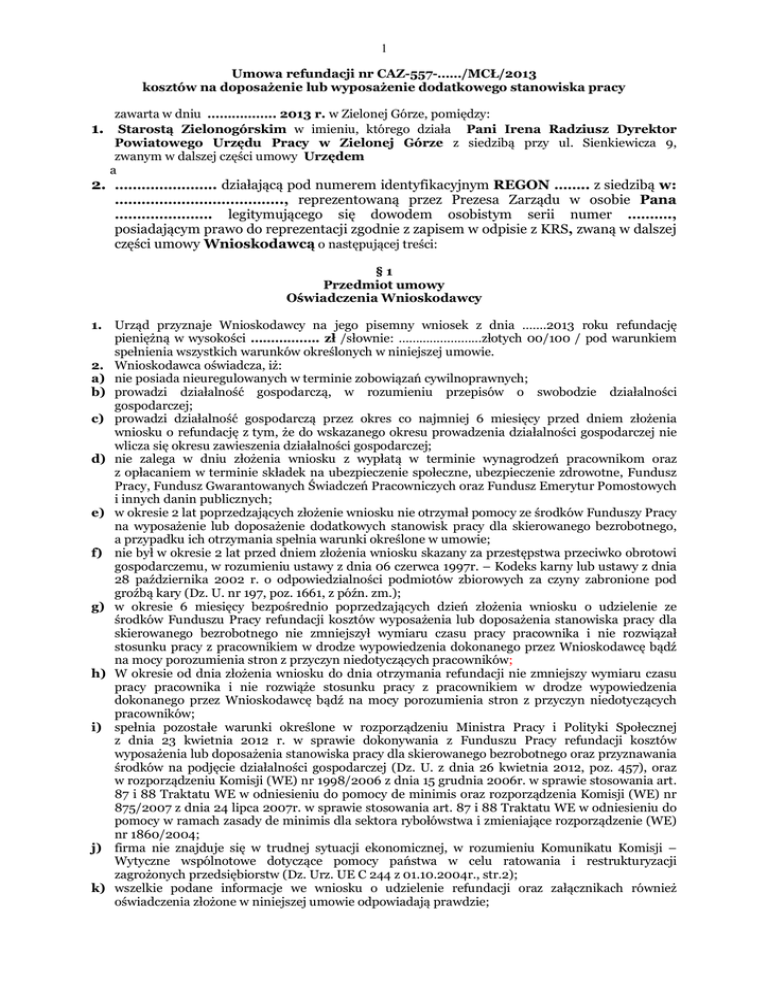 1 Umowa refundacji nr CAZ-557-……/MCŁ/2013 kosztów na doposażenie lub wyposażenie dodatkowego stanowiska pracy zawarta w dniu …………….. 2013 r. w Zielonej Górze, pomiędzy: 1. Starostą Zielonogórskim w imieniu, którego działa Pani Irena Radziusz Dyrektor Powiatowego Urzędu Pracy w Zielonej Górze z siedzibą przy ul. Sienkiewicza 9, zwanym w dalszej części umowy Urzędem a 2. ………………….. działającą pod numerem identyfikacyjnym REGON …….. z siedzibą w: ……………………………….., reprezentowaną przez Prezesa Zarządu w osobie Pana …………………. legitymującego się dowodem osobistym serii numer ………., posiadającym prawo do reprezentacji zgodnie z zapisem w odpisie z KRS, zwaną w dalszej części umowy Wnioskodawcą o następującej treści: §1 Przedmiot umowy Oświadczenia Wnioskodawcy 1. Urząd przyznaje Wnioskodawcy na jego pisemny wniosek z dnia …….2013 roku refundację pieniężną w wysokości …………….. zł /słownie: ……………………złotych 00/100 / pod warunkiem spełnienia wszystkich warunków określonych w niniejszej umowie. 2. Wnioskodawca oświadcza, iż: a) nie posiada nieuregulowanych w terminie zobowiązań cywilnoprawnych; b) prowadzi działalność gospodarczą, w rozumieniu przepisów o swobodzie działalności gospodarczej; c) prowadzi działalność gospodarczą przez okres co najmniej 6 miesięcy przed dniem złożenia wniosku o refundację z tym, że do wskazanego okresu prowadzenia działalności gospodarczej nie wlicza się okresu zawieszenia działalności gospodarczej; d) nie zalega w dniu złożenia wniosku z wypłatą w terminie wynagrodzeń pracownikom oraz z opłacaniem w terminie składek na ubezpieczenie społeczne, ubezpieczenie zdrowotne, Fundusz Pracy, Fundusz Gwarantowanych Świadczeń Pracowniczych oraz Fundusz Emerytur Pomostowych i innych danin publicznych; e) w okresie 2 lat poprzedzających złożenie wniosku nie otrzymał pomocy ze środków Funduszy Pracy na wyposażenie lub doposażenie dodatkowych stanowisk pracy dla skierowanego bezrobotnego, a przypadku ich otrzymania spełnia warunki określone w umowie; f) nie był w okresie 2 lat przed dniem złożenia wniosku skazany za przestępstwa przeciwko obrotowi gospodarczemu, w rozumieniu ustawy z dnia 06 czerwca 1997r. – Kodeks karny lub ustawy z dnia 28 października 2002 r. o odpowiedzialności podmiotów zbiorowych za czyny zabronione pod groźbą kary (Dz. U. nr 197, poz. 1661, z późn. zm.); g) w okresie 6 miesięcy bezpośrednio poprzedzających dzień złożenia wniosku o udzielenie ze środków Funduszu Pracy refundacji kosztów wyposażenia lub doposażenia stanowiska pracy dla skierowanego bezrobotnego nie zmniejszył wymiaru czasu pracy pracownika i nie rozwiązał stosunku pracy z pracownikiem w drodze wypowiedzenia dokonanego przez Wnioskodawcę bądź na mocy porozumienia stron z przyczyn niedotyczących pracowników; h) W okresie od dnia złożenia wniosku do dnia otrzymania refundacji nie zmniejszy wymiaru czasu pracy pracownika i nie rozwiąże stosunku pracy z pracownikiem w drodze wypowiedzenia dokonanego przez Wnioskodawcę bądź na mocy porozumienia stron z przyczyn niedotyczących pracowników; i) spełnia pozostałe warunki określone w rozporządzeniu Ministra Pracy i Polityki Społecznej z dnia 23 kwietnia 2012 r. w sprawie dokonywania z Funduszu Pracy refundacji kosztów wyposażenia lub doposażenia stanowiska pracy dla skierowanego bezrobotnego oraz przyznawania środków na podjęcie działalności gospodarczej (Dz. U. z dnia 26 kwietnia 2012, poz. 457), oraz w rozporządzeniu Komisji (WE) nr 1998/2006 z dnia 15 grudnia 2006r. w sprawie stosowania art. 87 i 88 Traktatu WE w odniesieniu do pomocy de minimis oraz rozporządzenia Komisji (WE) nr 875/2007 z dnia 24 lipca 2007r. w sprawie stosowania art. 87 i 88 Traktatu WE w odniesieniu do pomocy w ramach zasady de minimis dla sektora rybołówstwa i zmieniające rozporządzenie (WE) nr 1860/2004; j) firma nie znajduje się w trudnej sytuacji ekonomicznej, w rozumieniu Komunikatu Komisji – Wytyczne wspólnotowe dotyczące pomocy państwa w celu ratowania i restrukturyzacji zagrożonych przedsiębiorstw (Dz. Urz. UE C 244 z 01.10.2004r., str.2); k) wszelkie podane informacje we wniosku o udzielenie refundacji oraz załącznikach również oświadczenia złożone w niniejszej umowie odpowiadają prawdzie; 2 l) został pouczony o odpowiedzialności karnej w tym zakresie, gdyby podane informacje i złożone oświadczenia okazały się nieprawdziwe. 3. Refundacja kosztów wyposażenia lub doposażenia stanowiska pracy objętych niniejszą umową finansowana jest ze środków Funduszu Pracy i stanowi pomoc de minimis, która nie spełnia wszystkich kryteriów określonych w art. 107 Traktatu o funkcjonowaniu Unii Europejskiej i jest zwolniona z wymogu notyfikacji wynikającego z art. 108 Traktatu. §2 Przeznaczenie refundacji 1. Refundacja zostaje przyznana na doposażenie jednego dodatkowego stanowiska pracy z przeznaczeniem na zakup: …………………….., ………………………, ………………………, 2. Wnioskodawca zobowiązuje się do wyposażenia lub doposażenia stanowiska pracy: ………………………………………. (kod zawodu ………) dla osoby bezrobotnej w terminie do dnia ………….2013 roku. 3. Stanowisko pracy zostanie zorganizowane w: …………………………... 4. Wnioskodawca zobowiązuje się do zatrudnienia osoby bezrobotnej skierowanej przez Urząd w terminie do dnia ……………..2013 roku. 5. Za zatrudnienie uważa się tylko i wyłącznie zawarcie umowy o pracę z osobą bezrobotną skierowaną przez Urząd Pracy. 6. Nie wypełnienie w terminie obowiązków określonych w paragrafie (2) niniejszej umowy spowoduje rozwiązanie umowy refundacji ze skutkiem natychmiastowym oraz nie wypłacenie refundacji. §3 Wnioskodawca zobowiązuje się do: 1. Poniesienia wydatków (