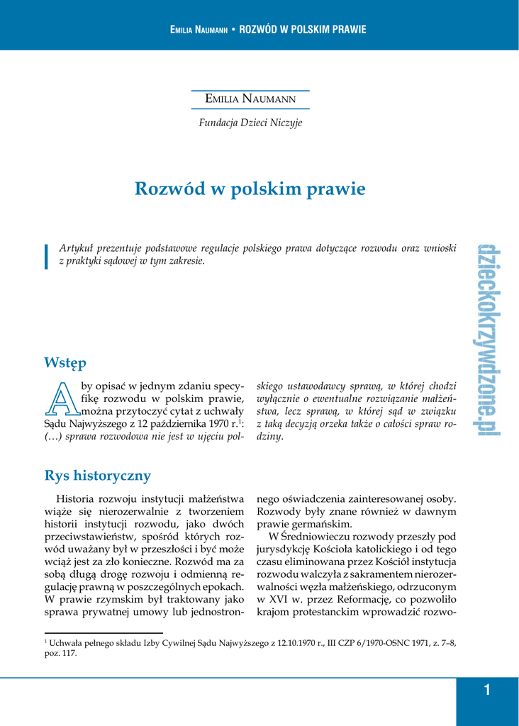 Emilia Naumann • Rozwód w polskim prawie Emilia Naumann Fundacja Dzieci Niczyje Rozwód w polskim prawie Artykuł prezentuje podstawowe regulacje polskiego prawa dotyczące rozwodu oraz wnioski z praktyki sądowej w tym zakresie. Wstęp by opisać w jednym zdaniu specyfikę rozwodu w polskim prawie, można przytoczyć cytat z uchwały Sądu Najwyższego z 12 października 1970 r.1: (…) sprawa rozwodowa nie jest w ujęciu pol- skiego ustawodawcy sprawą, w której chodzi wyłącznie o ewentualne rozwiązanie małżeństwa, lecz sprawą, w której sąd w związku z taką decyzją orzeka także o całości spraw rodziny. Rys historyczny Historia rozwoju instytucji małżeństwa wiąże się nierozerwalnie z tworzeniem historii instytucji rozwodu, jako dwóch przeciwstawieństw, spośród których rozwód uważany był w przeszłości i być może wciąż jest za zło konieczne. Rozwód ma za sobą długą drogę rozwoju i odmienną regulację prawną w poszczególnych epokach. W prawie rzymskim był traktowany jako sprawa prywatnej umowy lub jednostron- nego oświadczenia zainteresowanej osoby. Rozwody były znane również w dawnym prawie germańskim. W Średniowieczu rozwody przeszły pod jurysdykcję Kościoła katolickiego i od tego czasu eliminowana przez Kościół instytucja rozwodu walczyła z sakramentem nierozerwalności węzła małżeńskiego, odrzuconym w XVI w. przez Reformację, co pozwoliło krajom protestanckim wprowadzić rozwo- Uchwała pełnego składu Izby Cywilnej Sądu Najwyższego z 12.10.1970 r., III CZP 6/1970-OSNC 1971, z. 7–8, poz. 117. 1 1 Emilia Naumann • Rozwód w polskim prawie dy. W dobie Oświecenia małżeństwo poczytywano za contractus civilis (umowę prywatną), wskutek czego instytucja rozwodu stała się elementem państwowego porządku prawnego, oderwanego od jurysdykcji kościelnej. Instytucję rozwodu przyjęło prawo francuskie z 1792 r.; przewidywał ją również kodeks Napoleona (Piasecki red. 2001, s. 287–288). Koncepcja dozgonnej nierozerwalności związku małżeńskiego w żadnym okresie rozwoju cywilizacji nie wytrzymała w pełni próby życia. Ustawodawstwo nie akceptujące rozwodu starało się szukać rozwiązania przez rozbudowę przyczyn umożliwiających unieważnienie małżeństwa (Winiarz 1994, s. 129). Istnieje wiele modeli prawnych i sposobów dokonania rozwodu: – umowa pomiędzy małżonkami (tzw. rozwód prywatny), – odrzucenie małżonka wskutek złożenia przez drugiego oświadczenia skierowanego do drugiej strony (list rozwodowy znany w prawie mojżeszowym i prawie muzułmańskim), – poddanie żądania rozwodu pod rozstrzygnięcie sądu, – dokonanie – w niektórych sytuacjach – rozwodu przed organem administracyjnym (np. w Danii, w Rosji). Prawo polskie stoi na stanowisku trwałości małżeństwa w imię ochrony interesów małżonków, założonej przez nich rodziny, a zwłaszcza w imię dobra małoletnich dzieci. To założenie znajduje się u podstaw przepisów Kodeksu rodzinnego i opiekuńczego2, obowiązującego od 1 stycznia 1965 r. Rozwód po polsku Prawo polskie przyjmuje rozwiązanie, w myśl którego uzyskanie rozwodu jest możliwe w przypadku zupełnego i trwałego rozkładu pożycia małżeńskiego. Są to podstawowe, tzw. pozytywne przesłanki dopuszczalności rozwodu, które muszą występować łącznie. W każdej więc sprawie o rozwód sąd musi ustalić, czy taki rozkład pożycia występuje. Decyduje w tym przedmiocie stan na chwilę zamknięcia rozprawy (art. 316 § 1 k.p.c.). Wprawdzie przepisy k.r.o. nie wymagają, by zupełny i trwały rozkład pożycia małżeńskiego nastąpił z ważnych powodów, jednakże praktyka sądowa wykazała, że nie da się oddzielić „przyczyn” od „skutków”. Dlatego równie ważne, jak ustalenie przez sąd, że nastąpił zupełny i trwały rozkład pożycia małżeńskiego, jest również ustalenie, jakie powody sprawiły, że ten rozkład nastąpił (Krzemiński 1998, s. 11). Zgodnie z poglądami judykatury zupełny rozkład pożycia następuje wówczas, gdy wszelkie więzy łączące małżonków (duchowe, fizyczne i gospodarcze) uległy zerwaniu. Gdy jednak przy zupełnym braku więzi duchowej i fizycznej pozostały pewne elementy więzi gospodarczej wywołane szczególnymi okolicznościami (np. wspólnym mieszkaniem), rozkład pożycia można mimo to uznać za zupełny3. Rozkład pożycia jest trwały, gdy doświadczenie życiowe pozwala przyjąć, że na tle okoliczności konkretnej sprawy powrót małżonków do pożycia nie nastąpi4. Ustawa z 25 lutego 1964 r. (DzU nr 9, poz. 59, ze zm.). Orzeczenie SN z 9.04.1953 r., „Państwo i Prawo” 1954, nr 1, s. 180. 4 Orzeczenie SN z 13.01.1953 r., „Państwo i Prawo” 1953, nr 10, s. 557. 2 3 2 Emilia Naumann • Rozwód w polskim prawie Negatywne przesłanki rozwodu Polskie prawo jest dość restrykcyjne w sprawach rozwodowych. Nie dopuszcza „automatyzmu” w orzekaniu rozwodu, nawet wówczas, gdy spełnione są podstawowe przesłanki rozwodu, o których mowa powyżej, tj. zupełności i trwałości rozkładu pożycia małżeńskiego. W polskim prawie istnieją trzy zakazy orzeczenia rozwodu, tzw. negatywne przesłanki rozwodu: 1) jeżeli wskutek niego miałoby ucierpieć dobro wspólnych małoletnich dzieci małżonków (art. 56 § 2 k.r.o.), 2) jeżeli rozwodu żąda małżonek wyłącznie winny rozkładu pożycia, a drugi małżonek nie wyraził zgody na rozwód, przy czym jego odmowa nie jest sprzeczna z zasadami współżycia społecznego (art. 56 § 3 k.r.o.), 3) jeżeli orzeczenie rozwodu naruszałoby zasady współżycia społecznego z innych jeszcze powodów, niż kolizja z dobrem wspólnych małoletnich dzieci małżonków (art. 56 § 3 k.r.o.) Istnienie bądź nie istnienie tych przesłanek sąd jest zobowiązany badać w każdej sprawie. Dobro dziecka Bez wątpienia zakaz orzeczenia rozwodu, jeżeli wskutek tego miałoby ucierpieć dobro wspólnych małoletnich dziec