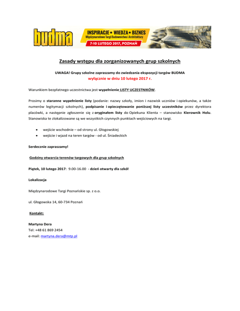 Zasady wstępu dla zorganizowanych grup szkolnych UWAGA! Grupy szkolne zapraszamy do zwiedzania ekspozycji targów BUDMA wyłącznie w dniu 10 lutego 2017 r. Warunkiem bezpłatnego uczestnictwa jest wypełnienie LISTY UCZESTNIKÓW. Prosimy o staranne wypełnienie listy (podanie: nazwy szkoły, imion i nazwisk uczniów i opiekunów, a także numerów legitymacji szkolnych), podpisanie i opieczętowanie poniższej listy uczestników przez dyrektora placówki, a następnie zgłoszenie się z oryginałem listy do Opiekuna Klienta – stanowisko Kierownik Holu. Stanowiska te zlokalizowane są we wszystkich czynnych punktach wejściowych na targi. wejście wschodnie – od strony ul. Głogowskiej wejście i wjazd na teren targów - od ul. Śniadeckich Serdecznie zapraszamy! Godziny otwarcia terenów targowych dla grup szkolnych Piątek, 10 lutego 2017: 9.00-16.00 - dzień otwarty dla szkół Lokalizacja Międzynarodowe Targi Poznańskie sp. z o.o. ul. Głogowska 14, 60-734 Poznań Kontakt: Martyna Dera Tel: +48 61 869 2454 e-mail: [email protected] Pieczęć szkoły: ZGŁOSZENIE Nazwa szkoły: …………………………………………………………………………………………………………… E-mail szkoły: ………………………………………………………………………..…………………..……………... Dyrektor (imię i nazwisko oraz tel. służbowy, w przypadku jeżeli pieczęć nie jest imienna) ……………………………………………………..…………………………………………..………… Zgłaszam grupę uczniów, zainteresowaną zwiedzaniem targów: ………………………………………………………………….………………………...……………… (nazwa targów) Kierunek/Profil kształcenia …..…………………………………..…………………………………..………….…………………… Klasa ………………………………….…………………….………………………………….……………… Data i godzina przyjazdu grupy ……………………...….………………………………………………………...………………..……. Lista uczniów / studentów – w załączeniu Zgodnie z ustawą z dnia 18 lipca 2002 r. (Dz.U. nr 144, poz.1204) o świadczeniu usług drogą elektroniczną: Wyrażam zgodę na otrzymywanie na wyżej wymienione adresy środków komunikacji elektronicznej informacji handlowych Międzynarodowych Targów Poznańskich Sp. z o.o. Wyrażam zgodę na otrzymywanie na wyżej wymienione adresy środków komunikacji elektronicznej informacji handlowych podmiotów współpracujących z Międzynarodowymi Targami Poznańskimi Sp. z o.o. , przesyłanych przez MTP na ich zlecenie. Oświadczam, że zapoznałem/-am się z Regulaminem zwiedzania targów przez zorganizowane grupy i zobowiązuję do jego przestrzegania uczniów / studentów oraz opiekuna/-ów. ……………………………………………… podpis Dyrektora Lista uczniów zwiedzających: Targi Budma 2017 w dniu ……………………………. Lp. Imię i nazwisko ucznia 1 2 3 4 5 6 7 8 9 10 11 12 13 14 15 16 17 18 19 20 21 22 23 24 25 26 27 28 29 30 Lp. 1 2 3 4 Imię i nazwisko opiekuna grupy Nr legitymacji szkolnej