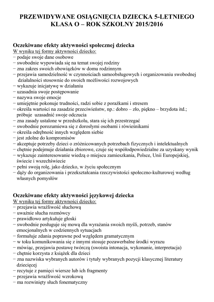 PRZEWIDYWANE OSIĄGNIĘCIA DZIECKA 5-LETNIEGO KLASA O – ROK SZKOLNY 2015/2016 Oczekiwane efekty aktywności społecznej dziecka W wyniku tej formy aktywności dziecko: − podaje swoje dane osobowe − swobodnie wypowiada się na temat swojej rodziny − zna zakres swoich obowiązków w domu rodzinnym − przejawia samodzielność w czynnościach samoobsługowych i organizowaniu swobodnej działalności stosownie do swoich możliwości rozwojowych − wykazuje inicjatywę w działaniu − uzasadnia swoje postępowanie − nazywa swoje emocje − umiejętnie pokonuje trudności, radzi sobie z porażkami i stresem − określa wartości na zasadzie przeciwieństw, np.: dobro – zło, piękno – brzydota itd.; próbuje uzasadnić swoje odczucia − zna zasady ustalone w przedszkolu, stara się ich przestrzegać − swobodnie porozumiewa się z dorosłymi osobami i rówieśnikami − określa odrębność innych względem siebie − jest zdolne do kompromisów − akceptuje potrzeby dzieci o zróżnicowanych potrzebach fizycznych i intelektualnych − chętnie podejmuje działania zbiorowe, czuje się współodpowiedzialne za uzyskany wynik − wykazuje zainteresowanie wiedzą o miejscu zamieszkania, Polsce, Unii Europejskiej, świecie i wszechświecie − pełni swoją rolę, jako dziecko, w życiu społecznym − dąży do organizowania i przekształcania rzeczywistości społeczno-kulturowej według własnych pomysłów Oczekiwane efekty aktywności językowej dziecka W wyniku tej formy aktywności dziecko: − przejawia wrażliwość słuchową − uważnie słucha rozmówcy − prawidłowo artykułuje głoski − swobodnie posługuje się mową dla wyrażania swoich myśli, potrzeb, stanów emocjonalnych w codziennych sytuacjach − formułuje zdania poprawne pod względem gramatycznym − w toku komunikowania się z innymi stosuje pozawerbalne środki wyrazu − mówiąc, przejawia postawę twórczą (swoista intonacja, wykonanie, interpretacja) − chętnie korzysta z książek dla dzieci − zna nazwiska wybranych autorów i tytuły wybranych pozycji klasycznej literatury dziecięcej − recytuje z pamięci wiersze lub ich fragmenty − przejawia wrażliwość wzrokową − ma rozwinięty słuch fonematyczny − rozumie znaczenie znaków i symboli graficznych − jest zainteresowane pisaniem − dysponuje sprawnościami niezbędnymi do nauki pisania − rozumie istotę czytania i pisania jako nośnika informacji (międzyludzkiej komunikacji językowej). Oczekiwane efekty aktywności poznawczej dziecka W wyniku tej formy aktywności dziecko: − samodzielnie inicjuje zabawy zgodnie z własnymi pomysłami − twórczo podchodzi do problemów pojawiających się w zabawach − chętnie mówi o swoich zainteresowaniach − poznaje upodobania innych osób − korzysta w zabawach z pomysłów dzieci uzdolnionych − rozumie znaczenie poszczególnych zmysłów w poznawaniu otaczającej rzeczywistości − zna proste rymowanki, wiersze i piosenki z repertuaru dziecięcego, potrafi odtworzyć je z pamięci − jest skoncentrowane w toku zorganizowanych działań edukacyjnych − dokonuje analizy, syntezy, porównania i klasyfikacji spostrzeganych przedmiotów − poszukuje odpowiedzi na nurtujące je pytania, problemy − z łatwością rozwiązuje proste zagadki logiczne − dostrzega zależność między skutkiem a przyczyną − zna części ciała, poprawnie je nazywa − posługuje się określeniami dotyczącymi położenia przedmiotów w przestrzeni − rozumie podstawowe określenia czasu − prawidłowo posługuje się liczebnikami − wykorzystuje w zabawach figury geometryczne − dokonuje porównań miary i masy przedmiotów oraz objętości cieczy − dostrzega zmiany dokonujące się w przyrodzie, słownie je określa − rozpoznaje i poprawnie nazywa często spotykane zwierzęta i rośliny − rozpoznaje zwierzęta niedostępne bezpośredniej obserwacji − nazywa podstawowe zjawiska z zakresu przyrody ożywionej i nieożywionej − zna główne zagrożenia dla środowiska przyrodniczego, rozumie konieczność jego ochrony Oczekiwane efekty aktywności artystycznej dziecka W wyniku tej formy aktywności dziecko: − chętnie słucha muzyki, śpiewa znane mu piosenki − z radością uczestniczy w zabawach muzyczno-ruchowych − wyraża swoje potrzeby, emocje, uzdolnienia podczas śpiewu, tańca, gry na instrumentach − jest wrażliwe na piękno otaczającej je rzeczywistości − chętnie podejmuje działalność plastyczno-konstrukcyjną, w której przejawia swoje upodobania − podejmuje działania niestandardowe dla osiągnięcia zamierzonych celów w działalności plastyczno-konstrukcyjnej − rozumie znaczenie literatury w życiu człowieka − wyraża własne refleksje na temat obejrzanych przedstawień teatralnych i filmów − chętnie bierze udział w organizowaniu przedstawień teatralnych, podczas których wyraża siebie w roli aktora − przejawia zachowania niekonwencjonalne w czasie wykonywania zadań o charakterze otwartym, wymagających postawy twórczej − chętnie uczestniczy w zabawach konstrukcyjno-technicznych − zna podstawowe zasady korzystania z wybranych urządzeń technicznych − rozumie znaczenie techniki dla rozwoju człowieka − posługuje się podstawowymi terminami z dziedziny sztuki − wypowiada się na temat własnych upodobań artystycznych − dba o rozwój własnych zainteresowań z wybranej dziedziny sztuki Oczekiwane efekty aktywności ruchowej i zdrowotnej dziecka W wyniku tej formy aktywności dziecko: − chętnie uczestniczy w zabawach, grach i zajęciach ruchowych − zna nazwy części ciała (także niektórych organów wewnętrznych), stosuje je − wymienia różnice w wyglądzie człowieka, zmieniającym się pod wpływem wieku − rozumie potrzebę ruchu dla prawidłowego funkcjonowania organizmu − przestrzega zasad obowiązujących w zabawach i grach ruchowych − jest sprawne ruchowo − przejawia twórczą inicjat
