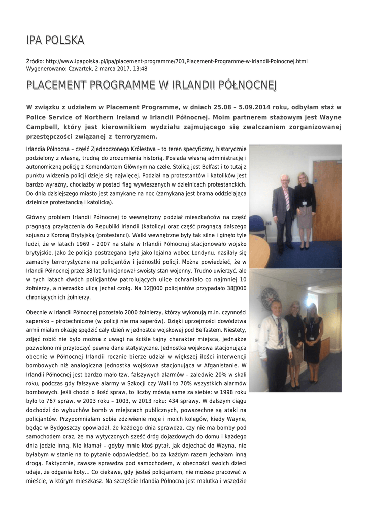 IPA POLSKA Źródło: http://www.ipapolska.pl/ipa/placement-programme/701,Placement-Programme-w-Irlandii-Polnocnej.html Wygenerowano: Czwartek, 2 marca 2017, 13:48 PLACEMENT PROGRAMME W IRLANDII PÓŁNOCNEJ W związku z udziałem w Placement Programme, w dniach 25.08 – 5.09.2014 roku, odbyłam staż w Police Service of Northern Ireland w Irlandii Północnej. Moim partnerem stażowym jest Wayne Campbell, który jest kierownikiem wydziału zajmującego się zwalczaniem zorganizowanej przestępczości związanej z terroryzmem. Irlandia Północna – część Zjednoczonego Królestwa – to teren specyficzny, historycznie podzielony z własną, trudną do zrozumienia historią. Posiada własną administrację i autonomiczną policję z Komendantem Głównym na czele. Stolicą jest Belfast i to tutaj z punktu widzenia policji dzieje się najwięcej. Podział na protestantów i katolików jest bardzo wyraźny, chociażby w postaci flag wywieszanych w dzielnicach protestanckich. Do dnia dzisiejszego miasto jest zamykane na noc (zamykana jest brama oddzielająca dzielnice protestancką i katolicką). Główny problem Irlandii Północnej to wewnętrzny podział mieszkańców na część pragnącą przyłączenia do Republiki Irlandii (katolicy) oraz część pragnącą dalszego sojuszu z Koroną Brytyjską (protestanci). Walki wewnętrzne były tak silne i ginęło tyle ludzi, że w latach 1969 – 2007 na stałe w Irlandii Północnej stacjonowało wojsko brytyjskie. Jako że policja postrzegana była jako lojalna wobec Londynu, nasilały się zamachy terrorystyczne na policjantów i jednostki policji. Można powiedzieć, że w Irlandii Północnej przez 38 lat funkcjonował swoisty stan wojenny. Trudno uwierzyć, ale w tych latach dwóch policjantów patrolujących ulice ochraniało co najmniej 10 żołnierzy, a nierzadko ulicą jechał czołg. Na 12 000 policjantów przypadało 38 000 chroniących ich żołnierzy. Obecnie w Irlandii Północnej pozostało 2000 żołnierzy, którzy wykonują m.in. czynności sapersko – pirotechniczne (w policji nie ma saperów). Dzięki uprzejmości dowództwa armii miałam okazję spędzić cały dzień w jednostce wojskowej pod Belfastem. Niestety, zdjęć robić nie było można z uwagi na ściśle tajny charakter miejsca, jednakże pozwolono mi przytoczyć pewne dane statystyczne. Jednostka wojskowa stacjonująca obecnie w Północnej Irlandii rocznie bierze udział w większej ilości interwencji bombowych niż analogiczna jednostka wojskowa stacjonująca w Afganistanie. W Irlandii Północnej jest bardzo mało tzw. fałszywych alarmów – zaledwie 20% w skali roku, podczas gdy fałszywe alarmy w Szkocji czy Walii to 70% wszystkich alarmów bombowych. Jeśli chodzi o ilość spraw, to liczby mówią same za siebie: w 1998 roku było to 767 spraw, w 2003 roku – 1003, w 2013 roku: 434 sprawy. W dalszym ciągu dochodzi do wybuchów bomb w miejscach publicznych, powszechne są ataki na policjantów. Przypomniałam sobie zdziwienie moje i moich kolegów, kiedy Wayne, będąc w Bydgoszczy opowiadał, że każdego dnia sprawdza, czy nie ma bomby pod samochodem oraz, że ma wytyczonych sześć dróg dojazdowych do domu i każdego dnia jedzie inną. Nie kłamał – gdyby mnie ktoś pytał, jak dojechać do Wayna, nie byłabym w stanie na to pytanie odpowiedzieć, bo za każdym razem jechałam inną drogą. Faktycznie, zawsze sprawdza pod samochodem, w obecności swoich dzieci udaje, że odgania koty… Co ciekawe, gdy jesteś policjantem, nie możesz pracować w mieście, w którym mieszkasz. Na szczęście Irlandia Północna jest malutka i wszędzie można dojechać w ciągu dwóch godzin. Spotkałam się ze stwierdzeniem, że Polak potrafi ze wszystkiego zrobić nalewkę – no może coś w tym jest. Za to ja – po wizycie w jednostce wojskowej powiedziałam, że irlandzki terrorysta jest w stanie zrobić bombę ze wszystkiego. Wayne i jego koledzy przyznali mi rację. Widziałam szereg bomb – dowodów rzeczowych zabezpieczonych podczas przeszukań – bomby z rur hydraulicznych, bomby, których elementem składowym są herbatniki „digestive” (bo „tylko one dobrze się kruszą przy odrzucie”), bomby magnetyczne montowane pod samochodami, bomby w kopertach bąbelkowych, pustakach, cegłach, a nawet bomba w … pojemniku na psie odchody w jednym z większych parków Belfastu. Jak powiedział jeden z generałów prowadzący prezentację: „Dobrze, że ten pojemnik był świeżo opróżniony, bo pół Belfastu byśmy mieli w kupie….”. Jeśli chodzi o prowadzenie postępowań karnych, to proces wykrywczy jest żmudny i nie zawsze kończy się sukcesem. Terroryści są dobrze zorganizowani, a grupy są hermetyczne. Na ogół rzadko udaje się ustalić tego, który robi bombę. Często na przestrzeni lat w różnych zamachach na terenie całej Irlandii policjanci znajdują bomby wykonane przez tą samą osobą. Jak sami mówią – „nasi terroryści do najmądrzejszych nie należą” – mają na myśli tych, którzy podkładają bombę. Często na bombie pismem ręcznym jest napisane: „włącz” i „wyłącz”, albo cyferki. Analiza pisma ręcznego, także monitoringu, pozwala na dotarcie do tej osoby, jednakże rzadko zdarza się „popchnąć” śledztwo dalej, gdyż faktycznie ta osoba z nikim ważnym, a zwłaszcza producentem bomby, kontaktu nie miała. Każda jednostka policji to twierdza – ogrodzona grubym i wysokim murem, czasami z drutem kolczastym, ze skomplikowanym systemem zabezpieczeń. Na moje pytanie, dlaczego ten mur taki wysoki usłyszałam: „Żeby nam przez mur bomby nie przerzucili”. Ogromne wrażenie zrobiła na mnie wizyta w Muzeum Policji oraz Ogrodzie Pamięci poległych policjantów. Patronat nad Ogrodem sprawuje Książę Karol. Każdy może tam wejść (najpierw trzeba się umówić), tylko że miejsce to – wyglądające jak piękny, zadbany ogród, z symbolicznym pomnikiem oraz tablicami z nazwiskam