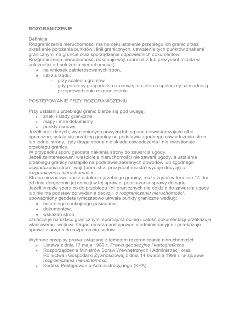 ROZGRANICZENIE Definicja: Rozgraniczenie nieruchomości ma na celu ustalenie przebiegu ich granic przez określenie położenia punktów i linii granicznych, utrwalenie tych punktów znakami granicznymi na gruncie oraz sporządzenie odpowiednich dokumentów. Rozgraniczenia nieruchomości dokonuje wójt (burmistrz lub prezydent miasta w zależności od położenia nieruchomości): na wniosek zainteresowanych stron, lub z urzędu: ▪ przy scaleniu gruntów ▪ gdy potrzeby gospodarki narodowej lub interes społeczny uzasadniają przeprowadzenie rozgraniczenia. POSTĘPOWANIE PRZY ROZGRANICZENIU Przy ustalaniu przebiegu granic bierze się pod uwagę: znaki i ślady graniczne mapy i inne dokumenty punkty osnowy Jeżeli brak danych, wymienionych powyżej lub są one niewystarczające albo sprzeczne, ustala się przebieg granicy na podstawie zgodnego oświadczenia stron lub jednej strony, gdy druga strona nie składa oświadczenia i nie kwestionuje przebiegu granicy. W przypadku sporu geodeta nakłania strony do zawarcia ugody. Jeżeli zainteresowani właściciele nieruchomości nie zawarli ugody, a ustalenie przebiegu granicy nastąpiło na podstawie zebranych dowodów lub zgodnego oświadczenia stron , wójt (burmistrz, prezydent miasta) wydaje decyzję o rozgraniczeniu nieruchomości. Strona niezadowolona z ustalenia przebiegu granicy, może żądać w terminie 14 dni od dnia doręczenia jej decyzji w tej sprawie, przekazania sprawy do sądu. Jeżeli w razie sporu co do przebiegu linii granicznych nie dojdzie do zawarcia ugody lub nie ma podstaw do wydania decyzji o rozgraniczeniu nieruchomości, upoważniony geodeta tymczasowo utrwala punkty graniczne według: ostatniego spokojnego posiadania, dokumentów, wskazań stron, oznacza je na szkicu granicznym, sporządza opinię i całość dokumentacji przekazuje właściwemu wójtowi. Organ umarza postępowanie administracyjne i przekazuje sprawę z urzędu do rozpatrzenia sądowi. Wybrane przepisy prawa związane z tematem rozgraniczania nieruchomości: Ustawa z dnia 17 maja 1989 r. Prawo geodezyjne i kartograficzne. Rozporządzenie Ministrów Spraw Wewnętrznych i Administracji oraz Rolnictwa i Gospodarki Żywnościowej z dnia 14 kwietnia 1999 r. w sprawie rozgraniczania nieruchomości. Kodeks Postępowania Administracyjnego (KPA)
