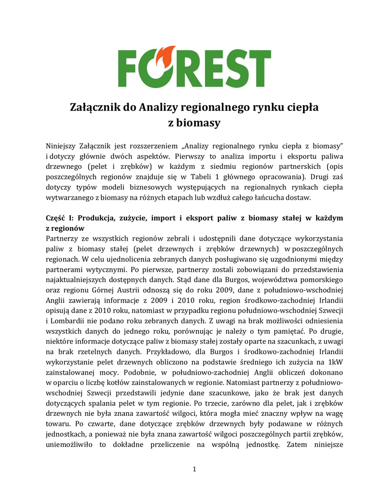 Załącznik do Analizy regionalnego rynku ciepła z biomasy Niniejszy Załącznik jest rozszerzeniem „Analizy regionalnego rynku ciepła z biomasy” i dotyczy głównie dwóch aspektów. Pierwszy to analiza importu i eksportu paliwa drzewnego (pelet i zrębków) w każdym z siedmiu regionów partnerskich (opis poszczególnych regionów znajduje się w Tabeli 1 głównego opracowania). Drugi zaś dotyczy typów modeli biznesowych występujących na regionalnych rynkach ciepła wytwarzanego z biomasy na różnych etapach lub wzdłuż całego łańcucha dostaw. Część I: Produkcja, zużycie, import i eksport paliw z biomasy stałej w każdym z regionów Partnerzy ze wszystkich regionów zebrali i udostępnili dane dotyczące wykorzystania paliw z biomasy stałej (pelet drzewnych i zrębków drzewnych) w poszczególnych regionach. W celu ujednolicenia zebranych danych posługiwano się uzgodnionymi między partnerami wytycznymi. Po pierwsze, partnerzy zostali zobowiązani do przedstawienia najaktualniejszych dostępnych danych. Stąd dane dla Burgos, województwa pomorskiego oraz regionu Górnej Austrii odnoszą się do roku 2009, dane z południowo-wschodniej Anglii zawierają informacje z 2009 i 2010 roku, region środkowo-zachodniej Irlandii opisują dane z 2010 roku, natomiast w przypadku regionu południowo-wschodniej Szwecji i Lombardii nie podano roku zebranych danych. Z uwagi na brak możliwości odniesienia wszystkich danych do jednego roku, porównując je należy o tym pamiętać. Po drugie, niektóre informacje dotyczące paliw z biomasy stałej zostały oparte na szacunkach, z uwagi na brak rzetelnych danych. Przykładowo, dla Burgos i środkowo-zachodniej Irlandii wykorzystanie pelet drzewnych obliczono na podstawie średniego ich zużycia na 1kW zainstalowanej mocy. Podobnie, w południowo-zachodniej Anglii obliczeń dokonano w oparciu o liczbę kotłów zainstalowanych w regionie. Natomiast partnerzy z południowowschodniej Szwecji przedstawili jedynie dane szacunkowe, jako że brak jest danych dotyczących spalania pelet w tym regionie. Po trzecie, zarówno dla pelet, jak i zrębków drzewnych nie była znana zawartość wilgoci, która mogła mieć znaczny wpływ na wagę towaru. Po czwarte, dane dotyczące zrębków drzewnych były podawane w różnych jednostkach, a ponieważ nie była znana zawartość wilgoci poszczególnych partii zrębków, uniemożliwiło to dokładne przeliczenie na wspólną jednostkę. Zatem niniejsze 1 opracowanie zawiera analizę produkcji, zużycia, importu i eksportu pelet i zrębków drzewnych, przy jednoczesnym uwzględnieniu opisanych powyżej zastrzeżeń. Pelety drzewne Roczne zużycie pelet drzewnych w siedmiu regionach biorących udział w projekcie wynosiło 430 000 ton (patrz Tabela A1). Niemniej jednak pomiędzy poszczególnymi regionami można zauważyć spore różnice. Prawie połowa wszystkich pelet, tj. 200 000 ton, została wykorzystana w Lombardii, a kolejne 100 000 ton w południowo-wschodniej Szwecji. Podczas gdy te dwa regiony ilustrują silne rynki paliwa drzewnego, trzy spośród siedmiu regionów partnerskich (Burgos, środkowo-zachodnia Irlandia i południowozachodnia Anglia) charakteryzują się wykorzystaniem pelet drzewnych w wysokości zaledwie 2% w całkowitym zużyciu pelet w siedmiu regionach partnerskich. W większości regionów, za wyjątkiem południowo-wschodniej Szwecji, zużycie pelet zostało pokryte z importu, nie zaś z produkcji w regionie. Jednak podawanie jedynie wartości bezwzględnych zużycia pelet może prowadzić do błędnych wniosków. Jeśli bowiem weźmiemy pod uwagę liczbę mieszkańców danego regionu otrzymamy inny obraz sytuacji. Z przeliczenia zużycia pelet drzewnych na jednego mieszkańca regionu wynika, że w Lombardii zużycie to wynosi ok. 22 kg, w regionie południowo-wschodniej Szwecji (z uwagi na stosunkowo niższą liczbę ludności) – 277 kg, a województwie pomorskim – ok. 83 kg (co wskazuje na wyższe niż np. w Lombardii względne zużycie pelet drzewnych w tym regionie). W przypadku większości regionów własna produkcja pelet drzewnych zaspokaja ok. 1030% zapotrzebowania na ten produkt. Wyjątek stanowi południowo-wschodnia Szwecja, gdzie regionalna produkcja w pełni zaspokaja potrzeby regionu na pelety. W swoim sprawozdaniu rejon Burgos nie dostarczył danych na temat poziomu importu i eksportu pelet drzewnych niezbędnych do zrównoważenia swoich potrzeb konsumpcyjnych. Niemniej jednak, wg danych z raportu "Dobre Praktyki w tworzeniu i rozwoju przedsiębiorstw związanych z biomasą („Best Practices in Biomass Related Enterprises Creation and Development” - Intelligent Europe 2009) w regionie Burgos powstanie fabryka pelet drzewnych o wydajności produkcyjnej w wysokości 60 000 ton rocznie, z czego 80% będzie eksportowana. Z raportu nie wynika, w jakim stopniu nowa fabryka przyczyni się do zwiększenia podaży pelet na regionalnym rynku, jednak biorąc pod uwagę niskie zużycie pelet w tym regionie (1 215 ton) należy przypuszczać, że wpływ nowej produkcji będzie znaczny. Z uwagi na dość niską produkcję pelet drzewnych w omawianych regionach, większość zapotrzebowania pokrywana jest z importu – niestety z badań nie wynika jasno skąd importowane są pelety. Dane zebrane z regionów zawierały również informacje na temat wielkości eksportu pelet do innych regionów przy założeniu, że eksportowane pelety 2 zostały wyprodukowane w danym regionie. Dane dotyczące importu i eksportu dostarczyło pięć regionów, spośród których dwa (środkowo-zachodnia Irlandia oraz południowozachodnia Anglia) nie eksportowały pelet drzewnych, województwo pomorskie wyeksportowało 15 000 ton, a regiony południowo-wschodniej Szwecji i Górnej Austrii po 20 000 ton. W hiszpańskim regionie Burgos zakładano eksport ok. 48 000 ton rocznie z nowo powstałych instalacji (Expobioenergía 2009). Na podstawie dostarczonych danych eksportowych pele