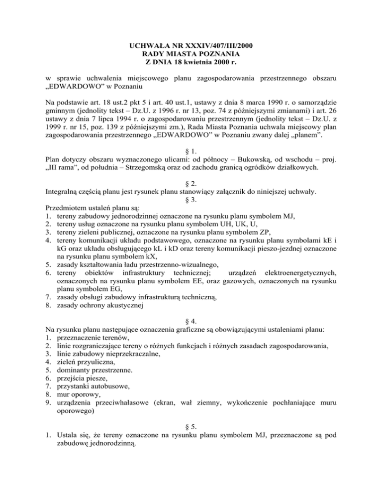 UCHWAŁA NR XXXIV/407/III/2000 RADY MIASTA POZNANIA Z DNIA 18 kwietnia 2000 r. w sprawie uchwalenia miejscowego planu zagospodarowania przestrzennego obszaru „EDWARDOWO” w Poznaniu Na podstawie art. 18 ust.2 pkt 5 i art. 40 ust.1, ustawy z dnia 8 marca 1990 r. o samorządzie gminnym (jednolity tekst – Dz.U. z 1996 r. nr 13, poz. 74 z późniejszymi zmianami) i art. 26 ustawy z dnia 7 lipca 1994 r. o zagospodarowaniu przestrzennym (jednolity tekst – Dz.U. z 1999 r. nr 15, poz. 139 z późniejszymi zm.), Rada Miasta Poznania uchwala miejscowy plan zagospodarowania przestrzennego „EDWARDOWO” w Poznaniu zwany dalej „planem”. § 1. Plan dotyczy obszaru wyznaczonego ulicami: od północy – Bukowską, od wschodu – proj. „III rama”, od południa – Strzegomską oraz od zachodu granicą ogródków działkowych. § 2. Integralną częścią planu jest rysunek planu stanowiący załącznik do niniejszej uchwały. § 3. Przedmiotem ustaleń planu są: 1. tereny zabudowy jednorodzinnej oznaczone na rysunku planu symbolem MJ, 2. tereny usług oznaczone na rysunku planu symbolem UH, UK, U, 3. tereny zieleni publicznej, oznaczone na rysunku planu symbolem ZP, 4. tereny komunikacji układu podstawowego, oznaczone na rysunku planu symbolami kE i kG oraz układu obsługującego kL i kD oraz tereny komunikacji pieszo-jezdnej oznaczone na rysunku planu symbolem kX, 5. zasady kształtowania ładu przestrzenno-wizualnego, 6. tereny obiektów infrastruktury technicznej; urządzeń elektroenergetycznych, oznaczonych na rysunku planu symbolem EE, oraz gazowych, oznaczonych na rysunku planu symbolem EG, 7. zasady obsługi zabudowy infrastrukturą techniczną, 8. zasady ochrony akustycznej § 4. Na rysunku planu następujące oznaczenia graficzne są obowiązującymi ustaleniami planu: 1. przeznaczenie terenów, 2. linie rozgraniczające tereny o różnych funkcjach i różnych zasadach zagospodarowania, 3. linie zabudowy nieprzekraczalne, 4. zieleń przyuliczna, 5. dominanty przestrzenne. 6. przejścia piesze, 7. przystanki autobusowe, 8. mur oporowy, 9. urządzenia przeciwhałasowe (ekran, wał ziemny, wykończenie pochłaniające muru oporowego) § 5. 1. Ustala się, że tereny oznaczone na rysunku planu symbolem MJ, przeznaczone są pod zabudowę jednorodzinną. Zabudowę kształtuje się w oparciu o dotychczasowy układ przestrzenny i podziały własnościowe z uwzględnieniem możliwości przyłączenia tzw. „masek budowlanych” (to jest terenów, które nie mogą być traktowane jako odrębne działki budowlanej) do poszczególnych posesji. 2. Na terenach MJ ustala się następujące zasady zagospodarowania: 1) utrzymuje się istniejącą zabudowę mieszkaniową, 2) na wolnych działkach mogą być realizowane budynki jednorodzinne szeregowe oraz bliźniacze, 3) na wolnych działkach obowiązuje nieprzekraczalna linia zabudowy, zapisana jako ustalenie symbolem graficznym, 4) maksymalna wysokość zabudowy 3 kondygnacje nadziemne, trzecia kondygnacja wyłącznie pod dachem stromym przy maksymalnej wysokości gzymsu 7,5 m. i maksymalnej wysokości kalenicy 12,5 m., 5) maksymalna powierzchnia zabudowy *dla działek szeregowych – 50 % powierzchni działki, *dla działek bliźniaczych dopuszcza się zabudowę 20-25 % jej powierzchni, 6) dopuszcza się wszelkie formy rozwiązań dachów z preferencją dachów stromych, 7) zakazuje się wprowadzania usług na terenach MF, 8) nakazuje się likwidację istniejących zakładów usługowych w terminie do 2 lat od wejścia w życie powyższej uchwały. 9) zakazuje się budowy budynków gospodarczych, 10) dopuszcza się lokalizację garaży wolnostojących i wewnątrz budynku mieszkalnego, 11) ustala się maksymalną powierzchnię użytkową garaży dla jednej działki 30 m2 ., 12) ustala się dla całego obszaru Edwardowa ogrodzenia ażurowe, uzupełnione zielenią o wysokości do 1,5 m. (wzdłuż ul. Strzegomskiej – dla kwartałów 13 MJ, 23 MJ i 25 MJ – dopuszcza się ogrodzenia pełne do wysokości 2,0 m.), 13) poza wymogami podanymi wyżej, nowo lokalizowane budynki mieszkalne muszą uwzględniać indywidualne warunki wynikające z sytuacji w terenie, dotyczy to szczególnie konieczności dobudowy brakujących segmentów mieszkalnych na działkach graniczących z istniejącymi już segmentami typu szeregowego i bliźniaczego, w celu zakończenia inwestycji. § 6. 1. Ustala się przeznaczenie terenów usług oznaczonych na rysunku planu symbolami: 5. UH – na adaptowany obiekt handlowy, 6.UK – na lokalizację projektowanego obiektu sakralnego, 12 U – rezerwacja terenu pod usługi podstawowe z wyłączeniem handlu i gastronomii, 26 UH – na projektowany obiekt handlowy. 2. Na terenie 5 UH ustala się: 1) utrzymanie istniejącego obiektu handlowego z dopuszczeniem modernizacji, remontu i ewentualnej rozbudowy, pod warunkiem zachowania następujących parametrów, a) wysokość budynku maksymalna 2 kondygnacje nadziemne, druga kondygnacja wyłącznie pod dachem stromym, przy maksymalnej wysokości gzymsu 5,5 m. i maksymalnej wysokości kolenicy 10,5 m. b) linia zabudowy istniejącej od ul. Leśmiana jest linią nieprzekraczalną, c) powierzchnia zabudowy stanowić może maksymalne 30 % terenu UH, 2) utrzymanie i wprowadzenie zieleni towarzyszącej, zwłaszcza na granicy działki i wzdłuż ogrodzenia. 3. Na terenie 6 UK ustala się: lokalizację projektowanego obiektu sakralnego wg programu Kurii Arcybiskupiej, z zachowaniem wysokich walorów architektonicznych. 1) Na terenie 6 UK obowiązują następujące zasady zagospodarowania: a) nieprzekraczalna linia zabudowy w odległości minimum 10,0 m. od linii rozgraniczającej ul. Leśmiana, b) bryła obiektu sakralnego stanowić powinna dominantę architektoniczną w przestrzeni wzbogacającą układ zieleni na terenach 2 ZP i 7 ZP c) zagospodarowanie zielenią niską, średnią i wysoką, stanowiącą minimum 25 % powierzchni terenu 6 UK w oparciu o specjalistyczną koncepcję kszta