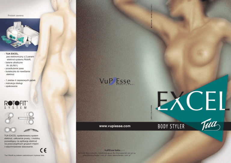 Produkt zawiera: - TUA EXCEL, pas elektroniczny z 2 parami elektrod systemu Rotofit, - baterie alkaliczne 9V (6LR61) - przedłużenie pasa - buteleczka do nawilżania elektrod - 1 zestaw 4 zapasowych gąbek - instrukcja obsługi - opakowanie TUA EXCEL opatentowany system elektrod, całkowicie prosty, i mobilny pozwalający na aplikację elektrod na poszczególnych grupach mięśni i natychmiastowe stasowanie. Tua i Rotofit są znakami zastrzeżonymi Vupiesse Italia VuPiEsse Italia s. r. l. Sprzedaż: Beautyfanatic, Hołubcowa 49, 02-821 Warszawa tel: 501 377 24 sklep@beautyfanatic. com. pl - www. beautyfanatic. com. pl TUA EXCEL to elektroniczne urządzenie do biernej gimnastyki przeznaczone do ujędrniania i tonacji mięśni ciała, odchudzania obszarów tłuszczowych, dwóch szczególnie trudnych problemów estetycznych. TUA EXCEL działa na zasadzie elektrostymulacji, czyli impulsy elektryczne przekazywane za pomocą elektrod na skórę, mięśnie, które kurczą się rytmicznie i wykonują prawdziwy wysiłek fizyczny. Muskularne ćwiczenia wywołane elektrostymulacją są szczególnie skuteczne, ponieważ mogą być intensywne i selektywnie ukierunkowane na grupy pojedynczych mięśni (coś co jest trudne do osiągnięcia poprzez aktywny wysiłek fizyczny). TRAPEZ Rozluźnienie obszaru szyjnego, górnego trapezu i mięśni przylegających wzdłuż kręgosłupa. PIERSI Tonacja, ujędrnianie i podnoszenie biustu. TUA EXCEL dysponuje dwoma specyficznymi programami ćwiczeń: T O N E TONE - program tonujący i ujędrniający ciało. Program TONE zapewnia skuteczne rzeźbienie ciała a wykorzystanie motorycznego działania programu optymalizuje odżywianie i napięcie mięśni oraz kanalizację płynów w tkankach. TONE to długotrwałe skurcze a następnie krótkie relaksujące przerwy, które powodują wymagającą pracę mięśni porównywalną do treningu na siłowni z ciężarami (kulturystyka) a w konsekwencji intensywne unaczynienie, które umożliwia szybkie odzyskanie tonu i masy mięśniowej. SLIM - program do zmniejszania miejscowej otyłości. Motoryczne działanie programy SLIM tj; szybkie wykonywanie ćwiczeń (krótkie skurcze a następnie równie krótkie przerwy), porównywalne do treningów aerobowych, zwiększają aktywność mięśni, która powoduje znaczny miejscowy wzrost krążenia krwi a w konsekwencji wzrost temperatury. Tak to działa!!! Zwiększone zużycie energii, bez żadnego wysiłku. Ta forma "gimnastyki" ma również tę zaletę, że może być wykonywana przez wszystkich, bez przyspieszonego oddechu i bicia serca. BRZUCH Tonacja, odchudzanie i formowanie brzucha. Poprzez umieszczenie elektrod na różnych mięśniach wykonasz ćwiczenia całego brzucha. UDA ------------------------------Tonacja wewnętrznych i zewnętrznych Rozluźnienie mięśni pleców, wzmocnienie mięśni kręgosłupa. Poprzez przesuwanie elektrod Rotofit, wykonasz ćwiczenia wszystkich mięśni pleców. BIODRA Odchudzanie bioder POŚLADKI Ujędrnianie, wyszczuplanie, podnoszenie i odchudzanie pośladków ud. Miejscowe leczenie cellulitu. Cellulit i złe mikrokrążenie prowadzą do zmian w tkance tłuszczowej i włóknach łącznej. Poprzez połączenie programów SLIM (zmniejszenie miejscowej otyłości) i TONE (przywrócenie napięcia skóry i mięśni) urządzenie staje się doskonałym narzędziem do walki z cellulitem. Systematyczne korzystanie i połączenie nisko kalorycznej diety dostarczy znakomitych wyników. UDA Odchudzanie i tonacja tylnej części ud. UA EXCEL jest bardzo praktyczny w użyciu i składa się z oryginalnego i praktycznego pasa z miękkiego materiału syntetycznego; brak zewnętrznych urządzeń, kabli i podłączanych elektrod, żeli przewodzący, umożliwi łatwe i natychmiastowe korzystanie z urządzenia; wystarczy zmoczyć elektrody wodą i założyć pas na ciało, na części ciała, które chcemy poddać leczeniu. TUA EXCEL umożliwia wybór programu i regulację intensywności podczas emisji impulsu oznaczonego zieloną diodą LED. TUA EXCEL wykorzystuje opatentowany system elektrod ROTOFIT, umożliwiający natychmiastowe umieszczenie elektrod na różnych częściach ciała. TUA EXCEL zasilany jest baterią alkaliczną 9V umieszczoną w przedniej kieszeni pasa; akumulatorki wystarczają na około 40 godzin pracy. TUA Excel został zaprojektowany i wyprodukowany przez Vupiesse Italia Srl, zgodnie z najbardziej rygorystycznymi przepisami międzynarodowymi i jakościowymi (CE). Vupiesse Italia posiada certyfikat Systemu Jakości zgodny z normami UNI EN ISO 9001 e UNI CEI EN 46001.
