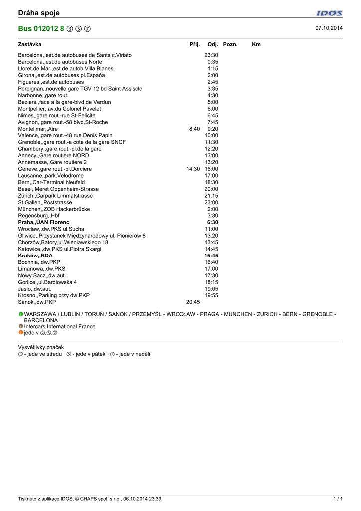 Dráha spoje Bus 012012 8 3 5 7 Zastávka Barcelona,,est.de autobuses de Sants c.Viriato Barcelona,,est.de autobuses Norte Lloret de Mar,,est.de autob.Villa Blanes Girona,,est.de autobuses pl.Espaňa Figueres,,est.de autobuses Perpignan,,nouvelle gare TGV 12 bd Saint Assiscle Narbonne,,gare rout. Beziers,,face a la gare-blvd.de Verdun Montpellier,,av.du Colonel Pavelet Nimes,,gare rout.-rue St-Felicite Avignon,,gare rout.-58 blvd.St-Roche Montelimar,,Aire Valence,,gare rout.-48 rue Denis Papin Grenoble,,gare rout.-a cote de la gare SNCF Chambery,,gare rout.-pl.de la gare Annecy,,Gare routiere NORD Annemasse,,Gare routiere 2 Geneve,,gare rout.-pl.Dorciere Lausanne,,park.Velodrome Bern,,Car-Terminal Neufeld Basel,,Meret Oppenheim-Strasse Zürich,,Carpark Limmatstrasse St.Gallen,,Poststrasse München,,ZOB Hackerbrücke Regensburg,,Hbf Praha,,ÚAN Florenc Wroclaw,,dw.PKS ul.Sucha Gliwice,,Przystanek Międzynarodowy ul. Pionierów 8 Chorzów,Batory,ul.Wieniawskiego 18 Katowice,,dw.PKS ul.Piotra Skargi Kraków,,RDA Bochnia,,dw.PKP Limanowa,,dw.PKS Nowy Sacz,,dw.aut. Gorlice,,ul.Bardiowska 4 Jaslo,,dw.aut. Krosno,,Parking przy dw.PKP Sanok,,dw.PKP 07.10.2014 Příj. Odj. Pozn. Km 23:30 0:35 1:15 2:00 2:45 3:35 4:30 5:00 6:00 6:45 7:45 8:40 9:20 10:00 11:30 12:20 13:00 13:20 14:30 16:00 17:00 18:30 20:00 21:15 23:00 2:00 3:30 6:30 11:00 13:20 13:45 14:45 15:45 16:40 17:00 17:30 18:15 19:05 19:55 20:45 « WARSZAWA / LUBLIN / TORUŃ / SANOK / PRZEMYŚL - WROCŁAW - PRAGA - MUNCHEN - ZURICH - BERN - GRENOBLE BARCELONA « Intercars International France « jede v 2,5,7 Vysvětlivky značek 3 - jede ve středu 5 - jede v pátek 7 - jede v neděli Tisknuto z aplikace IDOS, © CHAPS spol. s r.o., 06.10.2014 23:39 1/1