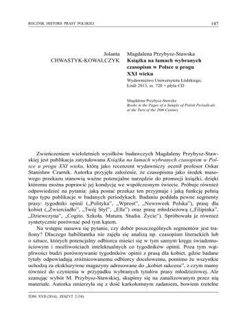 147 ROCZNIK HISTORII PRASY POLSKIEJ Jolanta CHWASTYK-KOWALCZYK Magdalena Przybysz-Stawska Książka na łamach wybranych czasopism w Polsce u progu XXI wieku Wydawnictwo Uniwersytetu Łódzkiego, Łódź 2013, ss. 720 + płyta CD Magdalena Przybysz-Stawska Books in the Pages of a Sample of Polish Periodicals at the Turn of the 20th Century Zwieńczeniem wieloletnich wysiłków badawczych Magdaleny Przybysz-Stawskiej jest publikacja zatytułowana Książka na łamach wybranych czasopism w Polsce u progu XXI wieku, którą jako recenzent wydawniczy ocenił profesor Oskar Stanisław Czarnik. Autorka przyjęła założenie, że czasopisma jako środek masowego przekazu stanowią ważne potencjalne narzędzie do promocji książki, dzięki któremu można poprawić jej kondycję we współczesnym świecie. Próbuje również odpowiedzieć na pytania: jaką postać przekaz ten przyjmuje i jaką funkcję pełnią tego typu publikacje w badanych periodykach. Badaniu poddała pewne segmenty prasy: tygodniki opinii („Polityka”, „Wprost”, „Newsweek Polska”), prasę dla kobiet („Zwierciadło”, „Twój Styl”, „Elle”) oraz prasę młodzieżową („Filipinka”, „Dziewczyna”, „Cogito. Szkoła. Matura. Studia. Życie”). Spróbowała je również syntetycznie porównać pod tym kątem. Na wstępie nasuwa się pytanie, czy dobór poszczególnych segmentów jest trafiony? Dlaczego habilitantka nie zajęła się analizą np. czasopism literackich lub o sztuce, których potencjalny odbiorca mieści się w tym samym kręgu świadomościowym i możliwościach intelektualnych co tygodników opinii. Poza tym wątpliwości budzi porównywanie tygodników opinii z prasą dla kobiet, gdzie badane tytuły odpowiadają zróżnicowanemu odbiorcy docelowemu, pomimo że wszystkie uchodzą za ekskluzywne magazyny adresowane do „kobiet sukcesu”, z czym mamy również do czynienia w przypadku wybranych tytułów prasy młodzieżowej. Ale szanując wybór M. Przybysz-Stawskiej, skupimy się na zanalizowanym przez nią materiale. Autorka zmierzyła się z dość karkołomnym zadaniem, bowiem rzetelne TOM XVII (2014), ZESZYT 2 (34) 148 PRZEGLĄDY I RECENZJE prasoznawcze opracowanie już jednego segmentu z zaproponowanych czasopism mogłoby wystarczyć na wartościową publikację. Rozprawa składa się z pięciu rozdziałów, poprzedzonych Wstępem napisanym zgodnie z obowiązującymi regułami naukowymi, gdzie czytelnik zostaje zapoznany z metodami badawczymi (metoda historyczna, analiza zawartości jakościowa i ilościowa), stanem badań i wykorzystaną literaturą. W rozdziale pierwszym autorka scharakteryzowała transformację rynku wydawniczo-księgarskiego i prasowego w Polsce w latach 1989–2005, ukazując ich główne tendencje rozwojowe. Stanowi to punkt odniesienia do dalszych rozważań. Rozdziały drugi, trzeci i czwarty stanowią zasadniczy trzon badawczy omawianej publikacji. Rozdział drugi analizuje tygodniki opinii — „Politykę”, „Wprost”, „Newsweek Polskę”, według przejrzystego klucza: po charakterystyce segmentu tych periodyków następuje historia powstania danego tytułu, omówienie jego zawartości, layoutu, występowania zagadnień związanych z książką na jego łamach, wyszczególnienie form obecności (recenzje — ich zakres i charakter, wywiady, reklamy książek, inne formy informacji o książce, publikacje odnoszące się ogólnie do literatury, sylwetki literatów i dziennikarzy, portrety, anonse wydawniczo-księgarskie, konkursy i akcje czytelnicze, gadżety, listy bestsellerów, ekranizacje, adaptacje, inscenizacje, inne — krótkie wzmianki zapowiadające ukazanie się nowej książki na rynku, odnoszące się do epizodu z życia pisarza, informacje o internetowej wypożyczalni książek, o stronach poświęconych Małemu Księciu, o poetyckich czatach, blogi w USA i w Polsce poświęcone bestsellerom; teksty, w których książka pojawia się „przy okazji”). Rozdział wieńczą wnioski porównawcze, zobrazowane w tabeli i omówione. Autorka w rozdziale drugim największe różnice pomiędzy tytułami dostrzegła w formie przekazu treści. Dane statystyczne zebrane w tabeli 36 (s. 293), gdzie porównała liczbę informacji o książce na łamach omawianych tygodników poprzez wymienione wyżej kategorie — doprowadziły Autorkę do wniosku, że wyraźna przewaga materiałów o książce zauważalna jest w „Polityce”. „Wprost” najczęściej zadowalał czytelników listami bestsellerów, a najmniej zagadnieniami związanymi z książką zainteresowany był „Newsweek Polska”. Interesująca jest konstatacja Autorki, która obliczyła, że recenzenci „Polityki” często sięgali po tytuły wydane dawniej, „Newsweeka Polska” — omawiali najczęściej zapowiedzi wydawnicze, a „Wprost” — bieżące wydania, nowości. Rozdział trzeci skonstruowany jest według tego samego schematu — analizuje „Zwierciadło”, „Twój Styl” oraz „Elle”. Przekonują mnie wnioski M. Przybysz-Stawskiej poparte solidną statystyką jej badań własnych, zobrazowanych w licznych tabelach obejmujących lata 2001–2005, takich jak: formy obecności książki i informacji o niej na łamach danego tytułu, recenzje, omówienia i adnotacje zamieszczane na łamach danego tytułu, wydawcy książek najczęściej recenzowanych na łamach danego tytułu, ogłoszenia wydawnicze zamieszczane na łamach danego tytułu, wywiady z osobami związanymi ze światem literatury zamieszczone ROCZNIK HISTORII PRASY POLSKIEJ Jolanta Chwastyk-Kowalczyk MAGDALENA PRZYBYSZ-STAWSKA, KSIĄŻKA NA ŁAMACH… 149 na łamach danego tytułu, reklamy wydawnicze zamieszczone na łamach danego tytułu, autorzy książek reklamowanych przez wydawców — więcej niż 1 tytuł — na łamach danego tytułu, najczęściej powtarzające się tytuły w reklamach wydawniczych, pisarze zamieszczający felietony na łamach danego tytułu. Wynika z nich np., że lic