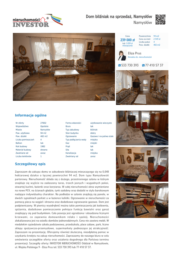 Dom bliźniak na sprzedaż, Namysłów Namysłów Cena 239 000 zł lub 1 039 zł miesięcznie Powierzchnia Cena za metr Liczba pokoi Pow. działki 94 m2 2 543 zł 4 482 m2 Eliza Prus Doradca ds. nieruchomości 533 730 393 Informacje ogólne Nr oferty 27602 Forma własności użytkowanie wieczyste Województwo Opolskie Biuro tak Miasto Namysłów Typ zabudowy bliźniak Pow. użytkowa 94 m2 Stan budynku dobry Pow. działki 482 m2 Ogrzewanie Gazowe i na paliwa stałe Liczba pomieszczeń 4 Typ podłączenia wody miejska Balkon tak Gaz miejski Rok budowy 1982 Prąd tak Materiał budowy drewno Siła tak Zwalniane od zaraz Kanalizacja miejska Liczba telefonów 1 Zwalniany od zaraz Szczegółowy opis Zapraszam do zakupu domu w zabudowie bliźniaczej mieszczącego się na 0,048 hektarowej działce o łącznej powierzchni 94 m2. Dom typu Namysłowski parterowy. Nieruchomość składa się z dużego, przestronnego salonu w którym znajduje się wyjście na zadaszony taras, trzech jasnych i wygodnych pokoi, otwartej kuchni, łazienki oraz korytarza. W całej nieruchomości okna wymienione na nowe PCV, na ścianach gładzie, tynk ozdobny oraz dodatki w stylu barokowym nadające indywidualny charakter. Na podłodze w salonie znajdują się panele, w dwóch sypialniach parkiet a w łazience kafelki. Ogrzewanie w nieruchomości za pomocą pieca na węgiel i drewno oraz dodatkowe ogrzewanie gazowe. Dom jest podpiwniczony. W piwnicy wyodrębnić można takie pomieszczenia jak kotłownia, spiżarnia, dodatkowe pomieszczenie pełniące funkcję bawialni oraz garaż znajdujący się pod budynkiem. Cała posesja jest ogrodzona i obsadzona licznymi krzewami, co zapewnia domownikom relaks i spokój. Nieruchomości zlokalizowana jest na osiedlu domków jednorodzinnych. Cena nie zawiera mebli. W niedalekim sąsiedztwie szkoła podstawowa, przedszkola, place zabaw, park, liczne sklepy spożywczo-przemysłowe, supermarkety podnoszące jej atrakcyjność. Zapraszam na prezentację. Oferujemy również skuteczną, nieodpłatną pomoc w uzyskaniu kredytu na zakup nieruchomości. Zapraszamy do naszego biura w celu omówienia szczegółów oferty oraz ustalenia dogodnego dla Państwa terminu prezentacji. Szczegóły oferty: INVESTOR NIERUCHOMOŚCI Oddział w Namysłowie, ul. Wojska Polskiego 9 - Eliza Prus tel. 533 730 393 lub 77 410 57 37. 77 410 57 37 Nota prawna: Informacje dotyczące opisu nieruchomości podane są przez właściciela, mają charakter wyłącznie informacyjny i mogą podlegać aktualizacji. Oferta dotycząca nieruchomości stanowi zaproszenie do rokowań zgodnie z art. 71 Kodeksu Cywilnego i nie stanowi oferty określonej w art. 66 i następnych KC. Oddział Namysłów, ul. Wojska Polskiego 9 , 46-100 Namysłów 77 400 01 76 • [email protected] • www.investor.net.pl 2017-03-02 12:57:48 Strona 1 z 1