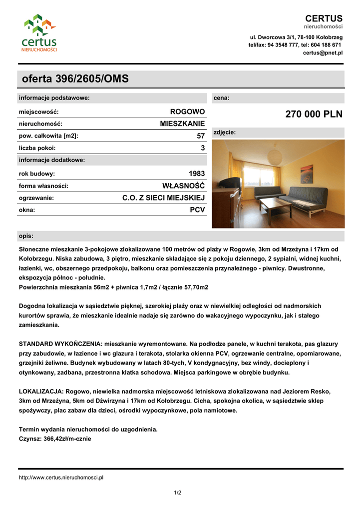 CERTUS nieruchomości ul. Dworcowa 3/1, 78-100 Kołobrzeg tel/fax: 94 3548 777, tel: 604 188 671 [email protected] oferta 396/2605/OMS informacje podstawowe: cena: ROGOWO miejscowość: 270 000 PLN MIESZKANIE nieruchomość: 57 pow. całkowita [m2]: zdjęcie: 3 liczba pokoi: informacje dodatkowe: 1983 rok budowy: WŁASNOŚĆ forma własności: ogrzewanie: C.O. Z SIECI MIEJSKIEJ PCV okna: opis: Słoneczne mieszkanie 3-pokojowe zlokalizowane 100 metrów od plaży w Rogowie, 3km od Mrzeżyna i 17km od Kołobrzegu. Niska zabudowa, 3 piętro, mieszkanie składające się z pokoju dziennego, 2 sypialni, widnej kuchni, łazienki, wc, obszernego przedpokoju, balkonu oraz pomieszczenia przynależnego - piwnicy. Dwustronne, ekspozycja północ - południe. Powierzchnia mieszkania 56m2 + piwnica 1,7m2 / łącznie 57,70m2 Dogodna lokalizacja w sąsiedztwie pięknej, szerokiej plaży oraz w niewielkiej odległości od nadmorskich kurortów sprawia, że mieszkanie idealnie nadaje się zarówno do wakacyjnego wypoczynku, jak i stałego zamieszkania. STANDARD WYKOŃCZENIA: mieszkanie wyremontowane. Na podłodze panele, w kuchni terakota, pas glazury przy zabudowie, w łazience i wc glazura i terakota, stolarka okienna PCV, ogrzewanie centralne, opomiarowane, grzejniki żeliwne. Budynek wybudowany w latach 80-tych, V kondygnacyjny, bez windy, docieplony i otynkowany, zadbana, przestronna klatka schodowa. Miejsca parkingowe w obrębie budynku. LOKALIZACJA: Rogowo, niewielka nadmorska miejscowość letniskowa zlokalizowana nad Jeziorem Resko, 3km od Mrzeżyna, 5km od Dźwirzyna i 17km od Kołobrzegu. Cicha, spokojna okolica, w sąsiedztwie sklep spożywczy, plac zabaw dla dzieci, ośrodki wypoczynkowe, pola namiotowe. Termin wydania nieruchomości do uzgodnienia. Czynsz: 366,42zł/m-cznie http://www.certus.nieruchomosci.pl 1/2 CERTUS nieruchomości ul. Dworcowa 3/1, 78-100 Kołobrzeg tel/fax: 94 3548 777, tel: 604 188 671 [email protected] ISTNIEJE MOŻLIWOŚĆ WYNAJĘCIA NA DŁUŻSZY OKRES CZASU - minimum rok Czynsz najmu 1.000zł/miesięcznie + opłaty, 1 miesięczna kaucja. W celu uzyskania szczegółowych informacji o ofercie prosimy o kontakt telefoniczny, bądź mailowy http://www.certus.nieruchomosci.pl 2/2