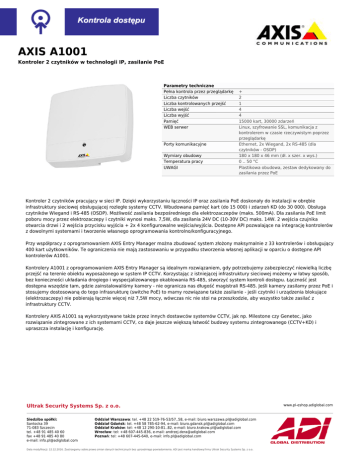 AXIS A1001 Kontroler 2 czytników w technologii IP, zasilanie PoE Parametry techniczne Pełna kontrola przez przeglądarkę Liczba czytników Liczba kontrolowanych przejść Liczba wejść Liczba wyjść Pamięć WEB serwer Porty komunikacyjne Wymiary obudowy Temperatura pracy UWAGI + 2 1 4 4 15000 kart, 30000 zdarzeń Linux, szyfrowanie SSL, komunikacja z kontrolerem w czasie rzeczywistym poprzez przeglądarkę Ethernet, 2x Wiegand, 2x RS-485 (dla czytników - OSDP) 180 x 180 x 46 mm (dł. x szer. x wys.) 0 .. 50 °C Plastikowa obudowa, zestaw dedykowany do zasilania przez PoE Kontroler 2 czytników pracujący w sieci IP. Dzięki wykorzystaniu łączności IP oraz zasilania PoE doskonały do instalacji w obrębie infrastruktury sieciowej obsługującej rozległe systemy CCTV. Wbudowana pamięć kart (do 15 000) i zdarzeń KD (do 30 000). Obsługa czytników Wiegand i RS-485 (OSDP). Możliwość zasilania bezpośredniego dla elektrozaczepów (maks. 500mA). Dla zasilania PoE limit poboru mocy przez elektrozaczepy i czytniki wynosi maks. 7,5W, dla zasilania 24V DC (10-30V DC) maks. 14W. 2 wejścia czujnika otwarcia drzwi i 2 wejścia przycisku wyjścia + 2x 4 konfigurowalne wejścia/wyjścia. Dostępne API pozwalające na integrację kontrolerów z dowolnymi systemami i tworzenie własnego oprogramowania kontrolno/konfiguracyjnego. Przy współpracy z oprogramowaniem AXIS Entry Manager można zbudować system złożony maksymalnie z 33 kontrolerów i obsługujący 400 kart użytkowników. Te ograniczenia nie mają zastosowaniu w przypadku stworzenia własnej aplikacji w oparciu o dostępne API kontrolerów A1001. Kontrolery A1001 z oprogramowaniem AXIS Entry Manager są idealnym rozwiązaniem, gdy potrzebujemy zabezpieczyć niewielką liczbę przejść na terenie obiektu wyposażonego w system IP CCTV. Korzystając z istniejącej infrastruktury sieciowej możemy w łatwy sposób, bez konieczności układania drogiego i wyspecjalizowanego okablowania RS-485, stworzyć system kontroli dostępu. Łączność jest dostępna wszędzie tam, gdzie zainstalowaliśmy kamery - nie ogranicza nas długość magistrali RS-485. Jeśli kamery zasilamy przez PoE i stosujemy dostosowaną do tego infrasrukturę (switche PoE) to mamy rozwiązane także zasilanie - jeśli czytniki i urządzenia blokujące (elektrozaczepy) nie pobierają łącznie więcej niż 7,5W mocy, wówczas nic nie stoi na przeszkodzie, aby wszystko także zasilać z infrastruktury CCTV. Kontrolery AXIS A1001 są wykorzystywane także przez innych dostawców systemów CCTV, jak np. Milestone czy Genetec, jako rozwiązanie zintegrowane z ich systemami CCTV, co daje jeszcze większą łatwość budowy systemu zintegrowanego (CCTV+KD) i upraszcza instalację i konfigurację. Ultrak Security Systems Sp. z o.o. Siedziba spółki: Santocka 39 71-083 Szczecin tel. +48 91 485 40 60 fax +48 91 485 40 80 e-mail: [email protected] Oddział Warszawa: tel. +48 22 519-76-53/57..58, e-mail: [email protected] Oddział Gdańsk: tel. +48 58 785-62-94, e-mail: [email protected] Oddział Kraków: tel: +48 12 290-10-81..82, e-mail: [email protected] Wrocław: tel: +48 607-445-836, e-mail: [email protected] Poznań: tel: +48 607-445-640, e-mail: [email protected] Data modyfikacji: 12.12.2016. Zastrzegamy sobie prawo zmian danych technicznych bez uprzedniego powiadomienia. ADI jest marką handlową firmy Ultrak Security Systems Sp. z o.o. www.pl-eshop.adiglobal.com