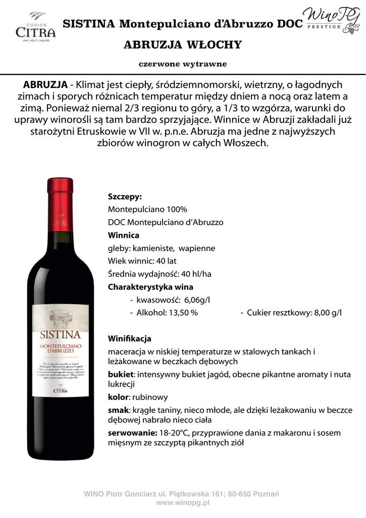 SISTINA Montepulciano d’Abruzzo DOC ABRUZJA WŁOCHY czerwone wytrawne ABRUZJA - Klimat jest ciepły, śródziemnomorski, wietrzny, o łagodnych zimach i sporych różnicach temperatur między dniem a nocą oraz latem a zimą. Ponieważ niemal 2/3 regionu to góry, a 1/3 to wzgórza, warunki do uprawy winorośli są tam bardzo sprzyjające. Winnice w Abruzji zakładali już starożytni Etruskowie w VII w. p.n.e. Abruzja ma jedne z najwyższych zbiorów winogron w całych Włoszech. Szczepy: Montepulciano 100% DOC Montepulciano d’Abruzzo Winnica gleby: kamieniste, wapienne Wiek winnic: 40 lat Średnia wydajność: 40 hl/ha Charakterystyka wina - kwasowość: 6,06g/l - Alkohol: 13,50 % - Cukier resztkowy: 8,00 g/l Wini!kacja maceracja w niskiej temperaturze w stalowych tankach i leżakowane w beczkach dębowych bukiet: intensywny bukiet jagód, obecne pikantne aromaty i nuta lukrecji kolor: rubinowy smak: krągłe taniny, nieco młode, ale dzięki leżakowaniu w beczce dębowej nabrało nieco ciała serwowanie: 18-20°C, przyprawione dania z makaronu i sosem mięsnym ze szczyptą pikantnych ziół WINO Piotr Gonciarz ul. Piątkowska 161; 60-650 Poznań# www.winopg.pl SISTINA PECORINO IGT ABRUZJA WŁOCHY białe wytrawne ABRUZJA - Klimat jest ciepły, śródziemnomorski, wietrzny, o łagodnych zimach i sporych różnicach temperatur między dniem a nocą oraz latem a zimą. Ponieważ niemal 2/3 regionu to góry, a 1/3 to wzgórza, warunki do uprawy winorośli są tam bardzo sprzyjające. Winnice w Abruzji zakładali już starożytni Etruskowie w VII w. p.n.e. Abruzja ma jedne z najwyższych zbiorów winogron w całych Włoszech. Szczepy: Pecorino 100% DOC Trebbiano d’Abruzzo Winnica gleby: kamieniste, wapienne Wiek winnic: 30 lat Średnia wydajność: 80 hl/ha Charakterystyka wina - kwasowość: 5,85g/l - Alkohol: 13,00 % - Cukier resztkowy: 5,60 g/l Wini!kacja maceracja w niskiej temperaturze w stalowych tankach bukiet: świeże i wyraziste, wyczuwalne egzotyczne owoce kolor: jasna - słomkowa smak:stonowana kwasowość, elegancki mineralny charakter serwowanie: 6-8°C, doskonałe do owoców morza z oliwą i skropionych cytryną WINO Piotr Gonciarz ul. Piątkowska 161; 60-650 Poznań# www.winopg.pl CITRA VINI - Montepulciano Abruzja WŁOCHY czerwone wytrawne ABRUZJA - Klimat jest ciepły, śródziemnomorski, wietrzny, o łagodnych zimach i sporych różnicach temperatur między dniem a nocą oraz latem a zimą. Ponieważ niemal 2/3 regionu to góry, a 1/3 to wzgórza, warunki do uprawy winorośli są tam bardzo sprzyjające. Winnice w Abruzji zakładali już starożytni Etruskowie w VII w. p.n.e. Abruzja ma jedne z najwyższych zbiorów winogron w całych Włoszech. Szczepy: Montepulciano 100% DOC Montepulciano d’Abruzzo Winnica gleby: kamieniste, wapienne Wiek winnic: 35 lat Średnia wydajność: 80 hl/ha Charakterystyka wina - kwasowość: 5,97g/l - Alkohol: 12,50 % - Cukier resztkowy: 6,56 g/l Wini!kacja maceracja długa w niskiej temperaturze bukiet: intensywny, ziemisty bukiet z nutą jeżyn i suszonych śliwek kolor: ciemny, rubinowy, mocny kolor smak: wino o mineralnym charakterze i doskonałej strukturze, z miękkimi taninami i długim )niszu - pozbawione agresywności serwowanie: 18-20°C, polecamy do potraw z grilla, dziczyzny, salami oraz do pikantnych serów WINO Piotr Gonciarz ul. Piątkowska 161; 60-650 Poznań# www.winopg.pl CITRA VINI - Merlot Abruzja WŁOCHY czerwone wytrawne ABRUZJA - Klimat jest ciepły, śródziemnomorski, wietrzny, o łagodnych zimach i sporych różnicach temperatur między dniem a nocą oraz latem a zimą. Ponieważ niemal 2/3 regionu to góry, a 1/3 to wzgórza, warunki do uprawy winorośli są tam bardzo sprzyjające. Winnice w Abruzji zakładali już starożytni Etruskowie w VII w. p.n.e. Abruzja ma jedne z najwyższych zbiorów winogron w całych Włoszech. Szczepy: Merlot 100% IGT Abruzja Winnica gleby: kamieniste, wapienne Wiek winnic: 35 lat Średnia wydajność: 80 hl/ha Charakterystyka wina - kwasowość: 5,87g/l - Alkohol: 13,00 % - Cukier resztkowy: 5,73 g/l Wini!kacja maceracja długa w niskiej temperaturze bukiet: dominują aromaty wiśni z pikantnymi armatami lukrecji i migdałów smak: na podniebieniu delikatne, aksamitne i miękkie serwowanie: 16-18°C, podawać do czerwonych mięs, oraz do średniowyrazistych serów WINO Piotr Gonciarz ul. Piątkowska 161; 60-650 Poznań# www.winopg.pl CITRA VINI - Trebbiano Abruzja WŁOCHY białe wytrawne ABRUZJA - Klimat jest ciepły, śródziemnomorski, wietrzny, o łagodnych zimach i sporych różnicach temperatur między dniem a nocą oraz latem a zimą. Ponieważ niemal 2/3 regionu to góry, a 1/3 to wzgórza, warunki do uprawy winorośli są tam bardzo sprzyjające. Winnice w Abruzji zakładali już starożytni Etruskowie w VII w. p.n.e. Abruzja ma jedne z najwyższych zbiorów winogron w całych Włoszech. Szczepy: Trebbiano 100% DOC Trebbiano d’Abruzzo Winnica gleby: kamieniste, wapienne Wiek winnic: 25 lat Średnia wydajność: 80 hl/ha Charakterystyka wina - kwasowość: 5,89g/l - Alkohol: 12,50 % - Cukier resztkowy: 5,13 g/l Wini!kacja maceracja krótka w niskiej temperaturze bukiet: delikatny, przyjemny, wyczuwalna nuta agrestu z elementami dojrzałych białych słodkich owoców kolor: jasna, słoneczne z zielonymi re)eksami smak: jedwabiste w ustach, delikatne ziemiste nuty, świeże przyprawy i nuta dojrzałej gruszki serwowanie: 6-8°C, polecamy do świeżych sałatek, lekkich dań rybnych oraz jako aperitif WINO Piotr Gonciarz ul. Piątkowska 161; 60-650 Poznań# www.winopg.pl