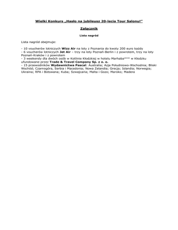 Wielki Konkurs „Hasło na jubileusz 20-lecia Tour Salonu!” Załącznik Lista nagród Lista nagród obejmuje: - 10 voucherów lotniczych Wizz Air na loty z Poznania do kwoty 200 euro kaŜdy - 6 voucherów lotniczych Jet Air – trzy na loty Poznań-Berlin i z powrotem, trzy na loty Poznań-Kraków i z powrotem - 3 weekendy dla dwóch osób w Kotlinie Kłodzkiej w hotelu Marhaba*** w Kłodzku ufundowane przez Trade & Travel Company Sp. z o. o. - 15 przewodników Wydawnictwa Pascal: Australia; Azja Południowo-Wschodnia; Bliski Wschód; Czarnogóra, Serbia i Macedonia; Nowa Zelandia; Grecja; Islandia; Norwegia; Ukraina; RPA i Botswana; Kuba; Szwajcaria; Malta i Gozo; Maroko; Madera