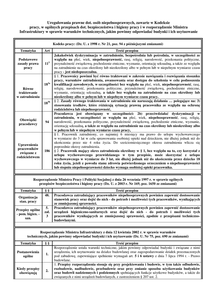 Uregulowania prawne dot. osób niepełnosprawnych, zawarte w Kodeksie pracy, w ogólnych przepisach dot. bezpieczeństwa i higieny pracy i w rozporządzenie Ministra Infrastruktury w sprawie warunków technicznych, jakim powinny odpowiadać budynki i ich usytuowanie Kodeks pracy: (Dz. U. z 1998 r. Nr 21, poz. 94 z późniejszymi zmianami) Tematyka Art Podstawowe zasady prawa pracy 113 183a Równe traktowanie w zatrudnieniu 183b Obowiązki pracodawcy 94 Uprawnienia pracowników związane z rodzicielstwem 186 Treść przepisu Jakakolwiek dyskryminacja w zatrudnieniu, bezpośrednia lub pośrednia, w szczególności ze względu na płeć, wiek, niepełnosprawność, rasę, religię, narodowość, przekonania polityczne, przynależność związkową, pochodzenie etniczne, wyznanie, orientację seksualną, a także ze względu na zatrudnienie na czas określony lub nieokreślony albo w pełnym lub w niepełnym wymiarze czasu pracy - jest niedopuszczalna. § 1. Pracownicy powinni być równo traktowani w zakresie nawiązania i rozwiązania stosunku pracy, warunków zatrudnienia, awansowania oraz dostępu do szkolenia w celu podnoszenia kwalifikacji zawodowych, w szczególności bez względu na płeć, wiek, niepełnosprawność, rasę, religię, narodowość, przekonania polityczne, przynależność związkową, pochodzenie etniczne, wyznanie, orientację seksualną, a także bez względu na zatrudnienie na czas określony lub nieokreślony albo w pełnym lub w niepełnym wymiarze czasu pracy. § 2. Zasady równego traktowania w zatrudnieniu nie naruszają działania … polegające na: 3) stosowaniu środków, które różnicują sytuację prawną pracownika ze względu na ochronę rodzicielstwa lub niepełnosprawność, Pracodawca jest obowiązany w szczególności: 2b) przeciwdziałać dyskryminacji w zatrudnieniu, w szczególności ze względu na płeć, wiek, niepełnosprawność, rasę, religię, narodowość, przekonania polityczne, przynależność związkową, pochodzenie etniczne, wyznanie, orientację seksualną, a także ze względu na zatrudnienie na czas określony lub nieokreślony albo w pełnym lub w niepełnym wymiarze czasu pracy, § 1. Pracownik zatrudniony, co najmniej 6 miesięcy ma prawo do urlopu wychowawczego w wymiarze do 3 lat w celu sprawowania osobistej opieki nad dzieckiem, nie dłużej jednak niż do ukończenia przez nie 4 roku życia. Do sześciomiesięcznego okresu zatrudnienia wlicza się poprzednie okresy zatrudnienia. § 2. Pracownik mający okres zatrudnienia określony w § 1, bez względu na to, czy korzystał z urlopu wychowawczego przewidzianego w tym przepisie, może skorzystać z urlopu wychowawczego w wymiarze do 3 lat, nie dłużej jednak niż do ukończenia przez dziecko 18 roku życia, jeżeli z powodu stanu zdrowia potwierdzonego orzeczeniem o niepełnosprawności lub stopniu niepełnosprawności dziecko wymaga osobistej opieki pracownika. Rozporządzenie Ministra Pracy i Polityki Socjalnej z dnia 26 września 1997 r. w sprawie ogólnych przepisów bezpieczeństwa i higieny pracy (Dz. U. z 2003 r. Nr 169, poz. 1650 ze zmianami) Tematyka Organizacja stan. pracy Przepisy ogólne - pom. higien. san. §§ 48. 5. zał. 3 Treść przepisu Pracodawca zatrudniający pracowników niepełnosprawnych powinien zapewnić dostosowanie stanowisk pracy oraz dojść do nich - do potrzeb i możliwości tych pracowników, wynikających ze zmniejszonej sprawności. Pracodawca zatrudniający pracowników niepełnosprawnych powinien zapewnić dostosowanie urządzeń higieniczno-sanitarnych oraz dojść do nich - do potrzeb i możliwości tych pracowników wynikających ze zmniejszonej sprawności, zgodnie z przepisami technicznobudowlanymi. Rozporządzenie Ministra Infrastruktury z dnia 12 kwietnia 2002 r. w sprawie warunków technicznych, jakim powinny odpowiadać budynki i ich usytuowanie (Dz. U. Nr 75, poz. 690 ze zmianami) Tematyka §§ Postanowienia ogólne 1. Kiedy przepisy obowiązują 2. Treść przepisu Rozporządzenie ustala warunki techniczne, jakim powinny odpowiadać budynki i związane z nimi urządzenia, ich usytuowanie na działce budowlanej oraz zagospodarowanie działek przeznaczonych pod zabudowę, zapewniające spełnienie wymagań art. 5 i 6 ustawy z dnia 7 lipca 1994 r. - Prawo budowlane. 1. Przepisy rozporządzenia stosuje się przy projektowaniu i budowie, w tym także odbudowie, rozbudowie, nadbudowie, przebudowie oraz przy zmianie sposobu użytkowania budynków oraz budowli nadziemnych i podziemnych spełniających funkcje użytkowe budynków, a także do związanych z nimi urządzeń budowlanych, z zastrzeżeniem § 207 ust. 2. Dojścia i dojazdy 16. 18. Miejsca postojowe dla samochodów 20. 21. 22. Zieleń i urządzenia rekreacyjne 40. 42. Ogrodzenia 43. Budynki i pomieszczenia – wymagania ogólne 54. 55. 1. Do wejść do budynku mieszkalnego wielorodzinnego, zamieszkania zbiorowego i użyteczności publicznej powinny być doprowadzone od dojść i dojazdów, o których mowa w § 14 ust. 1 i 3, utwardzone dojścia o szerokości minimalnej 1,5 m, przy czym co najmniej jedno dojście powinno zapewniać osobom niepełnosprawnym dostęp do całego budynku lub tych jego części, z których osoby te mogą korzystać. 2. Wymaganie dostępności osób niepełnosprawnych, o którym mowa w ust. 1, nie dotyczy budynków na terenach zamkniętych, a także budynków w zakładach karnych, aresztach śledczych, zakładach poprawczych i schroniskach dla nieletnich oraz budynków w zakładach pracy, niebędących zakładami pracy chronionej, z wyjątkiem budynków, o których mowa w § 3 pkt 6, tj. budynku użyteczności publicznej - należy przez to rozumieć budynek przeznaczony na potrzeby administracji publicznej, wymiaru sprawiedliwości, kultury, kultu religijnego, oświaty, szkolnictwa wyższego, nauki, opieki zdrowotnej, opieki społecznej i socjalnej, obsługi bankowej, handlu, gastronomii, usług, turystyki, sportu, obsługi pasażerów w trans