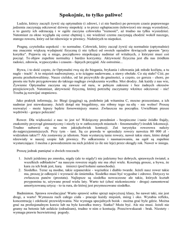 Spokojnie, to tylko paliwo! Ludzie, którzy zaczęli żywić się optymalnie (i zdrowi, i ci nie bardzo) po pewnym czasie poprawnego jedzenia zaczynają odczuwać dziwny niepokój: a to przez ogłupiaczem (telewizor) nie mogą wysiedzieć, a to gazety ich odrzucają i w ogóle zaczyna człowieka "roznosić", aż trudno na tyłku wysiedzieć. Natomiast za okno wygląda się coraz chętniej i, nie wiedzieć czemu zaczynają chodzić wokół naszego, starego roweru, który od lat rdzewieje w piwnicy. Niektórych to niepokoi. Pragnę, czytelnika uspokoić - to normalne. Człowiek, który zaczął żywić się normalnie (optymalnie) ma znacznie większą wydajność fizyczną (i nie tylko) od swoich sąsiadów tkwiących uporem "przy korytku". Pojawia się u niego, początkowo niepokojący nadmiar sił witalnych, z którymi musi coś począć. To objaw zupełnie normalny i bardzo korzystny. Aktywność fizyczna jest dla nas źródłem radości, zdrowia, wypoczynku i czasem - fajnych przygód. Ale ostrożnie... Bywa, i to dość często, że Optymalni rwą się do biegania, brykania i siłowania jak młode koźlęta, a tu nagle - trach! A to mięsień nadwerężony, a to ścięgno naderwane, a stawy obolałe. Co się stało? Cóż, po prostu przeholowaliśmy. Nasze cielsko, od lat przywykłe do gnuśności, a często, co gorsza - chore, po prostu nie było przygotowane do takiego nagłego zwiększenia wysiłku. Moi drodzy. Jak każdy z nas wie, Żywienie Optymalne zaczyna się zawsze od razu, w pełnym zakresie i bez żadnych okresów przejściowych. Natomiast, aktywność fizyczną, której potrzebę zaczynamy wkrótce odczuwać - nie! Trzeba ją rozwijać stopniowo. Jako praktyk informuję, że: Biegi (jogging) są, podobnie jak witamina C, mocno przeceniane, a ich nadmiar jest niewskazany. Jeżeli dotąd nie biegaliśmy, nie róbmy tego na siłę - nie wolno! Proszę rozważyć - może lepszy będzie forsowniejszy marsz. Zwłaszcza na początku. Uwielbiam piesze wędrówki - gorąco polecam! Rower. Dla większości z nas: to jest to! Wdzięczny przedmiot - bezpieczne i tanie źródło frajdy, znakomity przyrząd gimnastyczny i niezły (a w zatłoczonych miastach - fenomenalny!) środek lokomocji. Trudno nabawić się na nim jakiejkolwiek kontuzji. Zaś turystyka rowerowa należy do najprzyjemniejszych. Przy tym - tani. Są co prawda w sprzedaży rowery nawetza 80 000 zł widziałem takie!!! Ale zostawmy je idiotom. Nam wystarczą tanie rowery, nawet takie stare, które dotąd rdzewiały w naszej szopie lub piwnicy. Po odkurzeniu i nasmarowaniu, na ogół są zupełnie wystarczające. I można z powodzeniem na nich jeździć (o ile nie leje) przez okrągły rok. Nawet w śniegu. Proszę jednak pamiętać o dwóch rzeczach: 1. Jeżeli jeździmy po zmroku, nigdy (ale to nigdy!) nie jedziemy bez dobrych, sprawnych świateł, a wszelkich odblasków" na naszym rowerze nigdy nie ma zbyt wiele. Kosztują grosze, a bywa, że kara za ich brak jest, karą śmierci (pod kołami samochodu). 2. Siodełko. Teraz są modne, takie szpanerskie - wąziutkie i diablo twarde. Jeżeli nasz rower takie ma, proszę je odkręcić i wyrzucić do śmietnika. Siodełko musi być wygodne i zdrowe. Dotyczy to zwłaszcza panów (prostata). Najlepsze są siodełka nowoczesne ale takie, których kształt przypomina te, używane przed wielu laty. Warto też (choć niekoniecznie - droga) zamontować amortyzowaną sztycę - to ta rura, do której jest przymocowane siodełko. Badminton. Sprawa rewelacyjna! Warto sprawić sobie sprzęt najwyższej klasy, bo nawet taki, nie jest drogi, a warto! Wymusza ruch całego ciała - pracuje każdy mięsień, mózg i oko. Wyrabia refleks, koncentrację i zdolność przewidywania. Nie wymaga specjalnych boisk - można grać byle gdzie. Można grać na profesjonalnym korcie lub na byle kawałku trawy. Siatka? Może być. Ale nie musi. Jeżeli nie gramy na betonie lub asfalcie (odradzam), trudno w nim o kontuzję. Przeciwwskazań - brak. Niestety wymaga prawie bezwietrznej pogody. Siłownia. Cóż. Jest tam mnóstwo wyrafinowanych maszyn skutecznie wyrabiających dowolny mięsień lub całe ich grupy. Ale! Ale na ogół, na siłowni nie jesteśmy sami, co dla niektórych jest krępujące, zaś u innych (to gorsze) wymusza, dla okazania "siły i kondycji", wysiłek ponad miarę. I z tych przyczyn dobrą gimnastykę, jaką jest siłownia, początkującym zdecydowanie odradzam. I jeszcze dwie rady: 1. Kiedy zaczynamy uprawiać dowolną formę sportu, rekreacji lub turystyki natychmiast zaatakują nas reklamy typu: na rowerze można jeździć tylko w koszulce firmy "X", a w badmintona można grać, wyłącznie w butach firmy "Y". Nie dajecie się oszukać. To bzdury! Każdy sport można uprawiać w dowolnych, starych i wygodnych ciuchach. Nie dajmy sobie zrobić wody z mózgu. 2. Niczego nie róbmy "na siłę". To może być przyczyną licznych urazów lub niedyspozycji. Zaś mądrze stosowany, dawkowany (i zwiększany) wysiłek fizyczny jest zawsze dla Optymalnych źródłem sprawności i radości. Czego czytelnikom życzy Mariusz Waszak