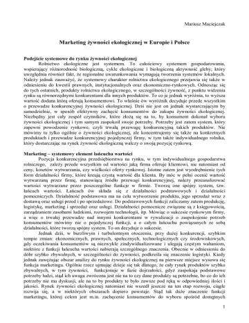Mariusz Maciejczak Marketing żywności ekologicznej w Europie i Polsce Podejście systemowe do rynku żywności ekologicznej Rolnictwo ekologiczne jest systemem. To całościowy systemem gospodarowania, wspierający różnorodność biologiczną, cykle ekologiczne i biologiczną aktywność gleby; który uwzględnia również fakt, że regionalne uwarunkowania wymagają tworzenia systemów lokalnych. Należy jednak zauważyć, że systemowy charakter rolnictwa ekologicznego przejawia się także w odniesieniu do kwestii prawnych, instytucjonalnych oraz ekonomiczno-rynkowych. Odnosząc się do tych ostatnich, produkty rolnictwa ekologicznego, w szczególności żywność, z punktu widzenia rynku są równorzędnymi konkurentami dla innych produktów. To co je jednak wyróżnia, to wyższa wartość dodana którą oferują konsumentowi. To właśnie ów wyróżnik decyduje przede wszystkim o przewadze konkurencyjnej żywności ekologicznej. Dziś nie jest on jednak wystarczającym by samodzielnie, w sposób efektywny zachęcić konsumentów do zakupu żywności ekologicznej. Niezbędny jest cały zespół czynników, które złożą się na to, by konsument dokonał wyboru żywności ekologicznej i tym samym zaspokoił swoje potrzeby. Potrzeby jest zatem system, który zapewni powodzenie rynkowe, czyli trwałą przewagę konkurencyjną takich produktów. Nie mówimy tu tylko ogólnie o żywności ekologicznej, ale koncentrujemy się także na konkretnych produktach i przewadze konkurencyjnej pojedynczej firmy, w tym także indywidualnego rolnika, który dostarczając na rynek żywność ekologiczną walczy o swoją pozycję rynkową. Marketing – systemowy element łańcucha wartości Pozycja konkurencyjna przedsiębiorstwa na rynku, w tym indywidualnego gospodarstwa rolniczego, zależy przede wszystkim od wartości jaką firma oferuje klientowi, nie natomiast od ceny, kosztów wytwarzania, czy wielkości oferty rynkowej. Istotne zatem jest wyodrębnienie tych form działalności firmy, które kreują czystą wartość dla klienta. By móc w pełni ocenić wartość wytwarzaną przez firmę, stanowiącą źródło przewagi konkurencyjnej, należy przeanalizować wartości wytwarzane przez poszczególne funkcje w firmie. Tworzą one spójny system, tzw. łańcuch wartości. Łańcuch ów składa się z działalności podstawowych i działalności pomocniczych. Działalność podstawowa ma na celu wytworzenie produktu, jego sprzedaż wraz z dostawą oraz usługi przed i po sprzedażowe. Do podstawowych funkcji zaliczamy zatem produkcję, logistykę, marketing i sprzedaż oraz usługi. Działalności pomocnicze związane są z księgowością, zarządzaniem zasobami ludzkimi, rozwojem technologii, itp. Mówiąc o sukcesie rynkowym firmy, a więc o trwałej przewadze nad innymi konkurentami w rywalizacji o zaspokojenie potrzeb konsumentów mówimy nie o pojedynczej funkcji, a o całym łańcuchu powiązanych ze sobą działalności, które tworzą spójny system. To on decyduje o sukcesie. Jednak dziś, w burzliwym i turbulentnym otoczeniu, przy dużej konkurencji, szybkim tempie zmian: ekonomicznych, prawnych, społecznych, technologicznych czy środowiskowych, gdy oczekiwania konsumentów są niezwykle zindywidualizowane i ulegają częstym wahaniom, niektóre z funkcji łańcucha wartości nabierają szczególnego znaczenia. Obecnie w odniesieniu do dóbr szybko zbywalnych, w szczególności do żywności, podkreśla się znaczenie logistyki. Kiedy jednak zawężając obszar analizy do rynku żywności ekologicznej na pierwsze miejsce wysuwa się funkcja marketingu. Ogólnie rzecz ujmując dzieje się tak dlatego, że cały rynek produktów szybko zbywalnych, w tym żywności, funkcjonuje w fazie dojrzałości, gdyż zaspokaja podstawowe potrzeby ludzi, stąd ich uwaga zwrócona jest nie na to czy dane produkty są potrzebne, bo co do ich potrzeby nie ma dyskusji, ale na to by produkty te było zawsze pod ręką w odpowiedniej ilości i jakości. Rynek żywności ekologicznej natomiast nie wszedł jeszcze na ten etap rozwoju, ciągle rozwija się, a w niektórych obszarach dopiero powstaje. Stąd tak duże znaczenie funkcji marketingu, której celem jest m.in. zachęcenie konsumentów do wyboru spośród dostępnych 1 substytutów - różnych produktów spożywczych - właśnie tych, konkretnych– żywności ekologicznej - która wnosi dodatkową wartość dodaną, zaspokaja także inne, często wyższe potrzeby, daje mu satysfakcje. Marketing to działanie na rynku. Istotne jest uświadomienie sobie, że działanie to ma swoją charakterystykę, a w dalszej kolejności analizowanie i rozwijanie go. Najczęściej marketing definiowany jest jako proces społeczny i menadżerski, dzięki któremu konkretne osoby i grupy otrzymują to, czego potrzebują i co pragną osiągnąć poprzez tworzenie, oferowanie i wymianę posiadających wartość dóbr. Lecz marketing opisywany jest także jako system. To system osiągania sukcesów na rynku dzięki orientacji na nabywców, ciągłemu badaniu i poznawaniu ich potrzeb, wytwarzaniu produktów najlepiej zaspokajających istniejące i pobudzone potrzeby oraz dostarczaniu produktów nabywcom wraz z informacją i promocją dla doprowadzenia do wymiany tworzącej wartość dla nabywców i zyski dla przedsiębiorstwa. Zatem marketing, najprościej ujmując, to zyskowne dostarczanie satysfakcji klientom, w tym poprzez zaspokajanie ich potrzeb. To w dużej mierze wiedza, działanie, ale także i sztuka łączenia potrzeby klienta z ofertą przedsiębiorstwa. W procesie tym marketing działa jako katalizator, przekaźnik, łącznik. Można iść nawet o krok dalej i stwierdzić, że celem marketingu jest uczynienie sprzedaży zbyteczną. Jego celem jest poznanie i zrozumienie klienta tak dobrze, aby produkt lub usługa dopasowały się doń i... sprzedały się same! Marketing MIX – od 4P do 4C Systemowy charakter przejawia się w takiej kompozycji skł