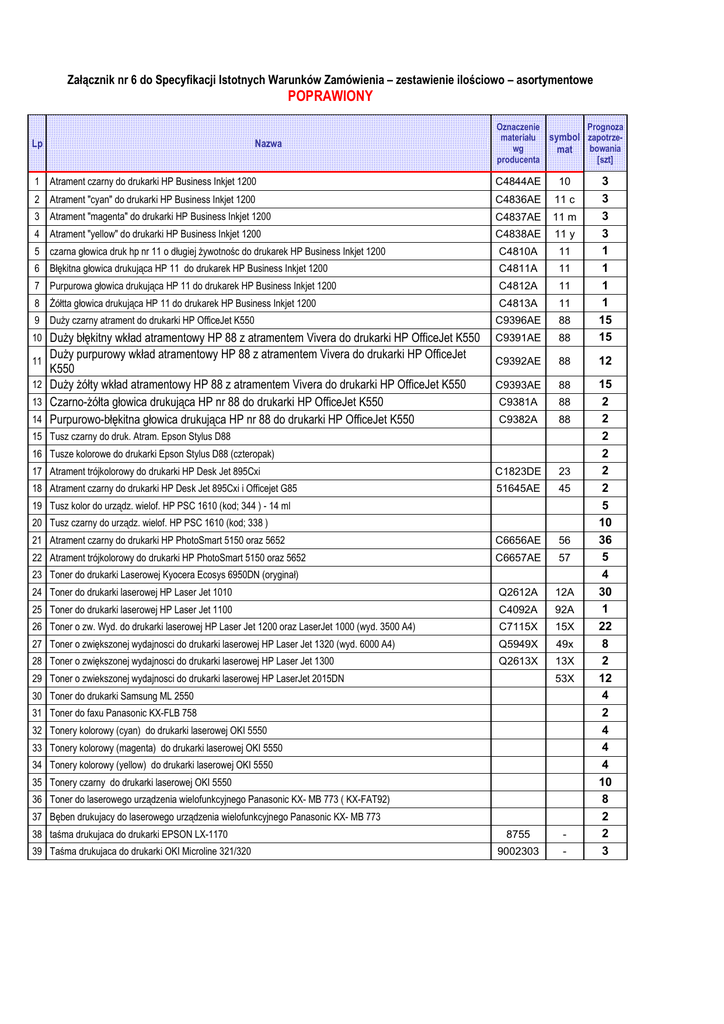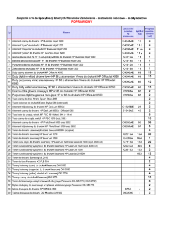Załącznik nr 6 do Specyfikacji Istotnych Warunków Zamówienia – zestawienie ilościowo – asortymentowe POPRAWIONY Lp Nazwa Oznaczenie Prognoza materiału symbol zapotrzewg bowania mat producenta [szt] 1 Atrament czarny do drukarki HP Business Inkjet 1200 C4844AE 10 3 2 Atrament "cyan" do drukarki HP Business Inkjet 1200 C4836AE 11 c 3 Atrament "magenta" do drukarki HP Business Inkjet 1200 C4837AE 11 m 4 Atrament "yellow" do drukarki HP Business Inkjet 1200 C4838AE 11 y 5 czarna głowica druk hp nr 11 o długiej Ŝywotnośc do drukarek HP Business Inkjet 1200 C4810A 11 6 Błękitna głowica drukująca HP 11 do drukarek HP Business Inkjet 1200 C4811A 11 7 Purpurowa głowica drukująca HP 11 do drukarek HP Business Inkjet 1200 C4812A 11 C4813A 11 C9396AE 88 C9391AE 88 3 3 3 1 1 1 1 15 15 C9392AE 88 12 C9393AE 88 C9381A 88 C9382A 88 17 Atrament trójkolorowy do drukarki HP Desk Jet 895Cxi C1823DE 23 18 Atrament czarny do drukarki HP Desk Jet 895Cxi i Officejet G85 51645AE 45 21 Atrament czarny do drukarki HP PhotoSmart 5150 oraz 5652 C6656AE 56 22 Atrament trójkolorowy do drukarki HP PhotoSmart 5150 oraz 5652 C6657AE 57 24 Toner do drukarki laserowej HP Laser Jet 1010 Q2612A 12A 25 Toner do drukarki laserowej HP Laser Jet 1100 C4092A 92A 26 Toner o zw. Wyd. do drukarki laserowej HP Laser Jet 1200 oraz LaserJet 1000 (wyd. 3500 A4) C7115X 15X 27 Toner o zwiększonej wydajnosci do drukarki laserowej HP Laser Jet 1320 (wyd. 6000 A4) Q5949X 49x 28 Toner o zwiększonej wydajnosci do drukarki laserowej HP Laser Jet 1300 Q2613X 13X 15 2 2 2 2 2 2 5 10 36 5 4 30 1 22 8 2 12 4 2 4 4 4 10 8 2 2 3 8 śółtta głowica drukująca HP 11 do drukarek HP Business Inkjet 1200 9 DuŜy czarny atrament do drukarki HP OfficeJet K550 10 11 12 13 14 DuŜy błękitny wkład atramentowy HP 88 z atramentem Vivera do drukarki HP OfficeJet K550 DuŜy purpurowy wkład atramentowy HP 88 z atramentem Vivera do drukarki HP OfficeJet K550 DuŜy Ŝółty wkład atramentowy HP 88 z atramentem Vivera do drukarki HP OfficeJet K550 Czarno-Ŝółta głowica drukująca HP nr 88 do drukarki HP OfficeJet K550 Purpurowo-błękitna głowica drukująca HP nr 88 do drukarki HP OfficeJet K550 15 Tusz czarny do druk. Atram. Epson Stylus D88 16 Tusze kolorowe do drukarki Epson Stylus D88 (czteropak) 19 Tusz kolor do urządz. wielof. HP PSC 1610 (kod; 344 ) - 14 ml 20 Tusz czarny do urządz. wielof. HP PSC 1610 (kod; 338 ) 23 Toner do drukarki Laserowej Kyocera Ecosys 6950DN (oryginał) 29 Toner o zwiekszonej wydajnosci do drukarki laserowej HP LaserJet 2015DN 53X 30 Toner do drukarki Samsung ML 2550 31 Toner do faxu Panasonic KX-FLB 758 32 Tonery kolorowy (cyan) do drukarki laserowej OKI 5550 33 Tonery kolorowy (magenta) do drukarki laserowej OKI 5550 34 Tonery kolorowy (yellow) do drukarki laserowej OKI 5550 35 Tonery czarny do drukarki laserowej OKI 5550 36 Toner do laserowego urządzenia wielofunkcyjnego Panasonic KX- MB 773 ( KX-FAT92) 37 Bęben drukujacy do laserowego urządzenia wielofunkcyjnego Panasonic KX- MB 773 38 taśma drukujaca do drukarki EPSON LX-1170 39 Taśma drukujaca do drukarki OKI Microline 321/320 8755 - 9002303 - 20 300 200 50 10 200 30 40 Toner o zwiększonej wydajnosci do drukarki Samsung serii ML-2850 (ML-2850B) 41 Czyste płyty CD-R X48 700 MB na trzpieniu 42 Czyste płyty DVD-R X16 pudełka SLIM 43 Czyste płyty DVD-R X8-X16 Double Layer pudełka SLIM 44 Czyste płyty DVD-RW X4 pudełka SLIM 45 Dyskietki 3,5" 1,44 MB pudełko kartonowe 46 SpęŜone powietrze (w pojemniku z dyfuzorem ) - minimum 400 ml 47 Segregatory do CD / DVD na min 100 płyt 48 s.na 104CD Myszy optyczne z "przewijaczem" (USB/PS/2) minimum 500 DPI kursor nie skaczący i nie drŜacy (przy nieodblaskowym blacie biurka) 10 49 klawiatury biurowe PS/2 (wygodny podstawowy zestaw klawiszy ) 50 Komputerowe listwy zasilajace z kablem o długosci 5 m (5 gniazd) 51 Płyny do czyszczenia ekranów komputerowych LCD (pojemność min. 400 ml) 52 Płyny do czyszczenia obudów komputerowych i klawiatur (pojemność min. 400 ml) 53 Pudełka zamykane na 100 sztuk dyskietek 3,5" 54 "Grube" przedłuŜacze kabla USB - 2-3 m 55 PrzedłuŜacze kabli PS/2 - min 1,5m 56 Koperty na CD 57 Taśmy drukujace do drukarki igłowej OKI ML 6300BF 58 Taśmy do streamera - LTO3 Ultrium 400/800 GB 5 Przyklad 59 Taśmy do streamera - LTO5 60 Taśma czyszczaca do napędu LTO-3 61 Taśma czyszczaca do napędu LTO-5 Pojemniki z tworzywa sztucznego posiadające od 6 do 10 szufladek na dokumenty w formacie A4 (w jednej 62 szufladce musi się zmieścić plik dokumentów o grubosci 20mm. Szufladki musza zawierać na przednim szyldzie okienko do umieszczenia karteczek z opisami zawartosci kaŜdej szufladki. 10 20 15 10 2 10 10 500 5 20 10 1 1 2 50 2 63 Pisaki do płyt CD-R (Permament marker) 64 Zewnętrzny dysk twardy z interfejsem eSATA i USB o pojemnosci 500 GB Kable (patchcordy) Molex kategorii 6 FTP, dla certyfikowanego systemu okablowania Molex PowerCat 6, o 65 długości 3 m w kolorze czerwonym, niebieskim, zielonym), Ŝółtym (oznaczenie MOLEX:PCD-00309-0C, PCD00309-0H, PCD-00309-0J, PCD-00309-0K) 5 Kable (patchcordy)Molex kategorii 6 FTP, dla certyfikowanego systemu okablowania Molex PowerCat 6, o 66 długości 5 m w kolorze czerwonym, niebieskim, zielonym, Ŝółtym (oznaczenie MOLEX:PCD-00312-0C, PCD00312-0H, PCD-00312-0J, PCD-00312-0K) 5 67 Kable (patchcordy) Molex w standardzie kategorii 6 FTP Molex Power Cat o długosci 10 m w kolorze niebieskim lub czerwonym (oznaczenie MOLEX:PCD-00317-0H, PCD-00317-0C) 68 Toner czarny do druk laserowej kolorowej A3 HP Color LaserJet CP5225dn 69 Toner kolorowy (C/M/Y) do nowej druk. Laserowej kolorowej A3 (udzial poszczegolnych kolorów będzie wynikal z eksploatacji drukarki 5 CE740A 3 CE741A CE742A CE743A 6 6 70 Moduly pamieci RAM DDR2 (minimum PC 2700) 71 Czarny bęben światłoczuły do kolorowego urządzenia wielofunkcyjnego laserowego OKI C5550 43381724 2 72 Bęben światłoczuły Cyan do kolorowego urządzenia wielofunkcyjnego