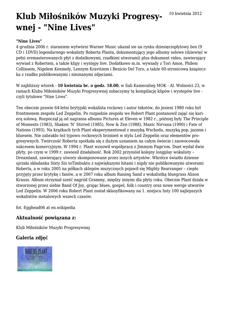Klub Miłośników Muzyki Progresywnej - "Nine Lives" 10 kwietnia 2012 "Nine Lives" 4 grudnia 2006 r. staraniem wytwórni Warner Music ukazał sie na rynku dziesięciopłytowy box (9 CD i 1DVD) legendarnego wokalisty Roberta Planta, dokumentujący jego albumy solowe (dziewięć w pełni zremasterowanych płyt z dodatkowymi, rzadkimi utworami) plus dokument video, zawierający wywiad z Robertem, a także klipy i występy live. Dodatkowo m.in. wywiady z Tori Amos, Philem Collinsem, Nigelem Kennedy, Lennym Kravitzem i Benicio Del Toro, a także 60-stronicowa książeczka z rzadko publikowanymi i nieznanymi zdjęciami. W najbliższy wtorek - 10 kwietnia br. o godz. 18.00, w Sali Kameralnej MOK - Al. Wolności 23, w ramach Klubu Miłośników Muzyki Progresywnej zobaczymy tę kompilację klipów i wystepów live czyli tytułowe "Nine Lives". Ten obecnie prawie 64-letni brytyjski wokalista rockowy i autor tekstów, do jesieni 1980 roku był frontmenem zespołu Led Zeppelin. Po rozpadzie zespołu we Robert Plant postanowił zająć się karierą solową. Rozpoczął ją od nagrania albumu Pictures at Eleven w 1982 r., później były The Principle of Moments (1983), Shaken 'N' Stirred (1985), Now & Zen (1988), Manic Nirvana (1990) i Fate of Nations (1993). Na krążkach tych Plant eksperymentował z muzyką Wschodu, muzyką pop, jazzem i bluesem. Nie zabrakło też typowo rockowych brzmień w stylu Led Zeppelin oraz elementów progresywnych. Twórczość Roberta spotkała się z dużym uznaniem na całym świecie i zaowocowała sukcesem komercyjnym. W 1994 r. Plant wznowił współpracę z Jimmym Page'em. Duet wydał dwie płyty, po czym w 1999 r. zawiesił działalność. Rok 2002 przyniósł kolejny longplay wokalisty – Dreamland, zawierający utwory skomponowane przez innych artystów. Wkrótce światło dzienne ujrzała składanka Sixty Six toTimbuktu z największymi hitami i nigdy nie publikowanymi utworami Roberta, a w roku 2005 na półkach sklepów muzycznych pojawił się Mighty Rearranger – ciepło przyjęty przez krytykę i fanów, a w 2007 roku album Raising Sand z wokalistką bluegrass Alison Krauss. Album otrzymał sześć nagród Grammy, między innymi dla płyty roku. Obecnie Plant działa w stworzonej przez siebie Band Of Joy, grając blues, gospel, folk i country oraz nowe wersje utworów Led Zeppelin. W 2006 roku Robert Plant został sklasyfikowany na 1. miejscu listy 100 najlepszych wokalistów metalowych wszech czasów. fot. Egghead06 at en.wikipedia Aktualność powiązana z: Klub Miłośników Muzyki Progresywnej Galeria zdjęć