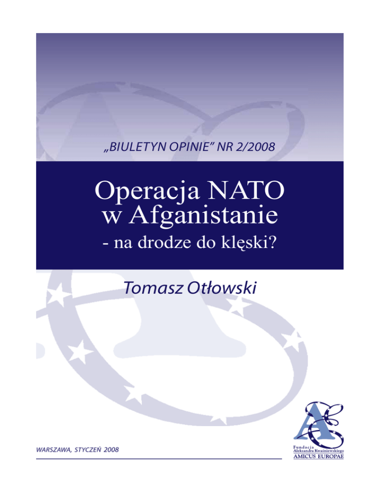 „BIULETYN OPINIE” NR 2/2008 Operacja NATO w Afganistanie - na drodze do klęski? Tomasz Otłowski WARSZAWA, STYCZEŃ 2008 Seria „Biuletyn – Opinie Fundacji Amicus Europae” jest cykliczną publikacją, analizującą najważniejsze wydarzenia i procesy społeczno-polityczne oraz międzynarodowe, zachodzące na świecie. Tezy przedstawiane w materiałach publikowanych w „Biuletynie” odzwierciedlają wyłącznie poglądy ich autorów. Operacja Nato w Afganistanie... Aktualna sytuacja strategiczna i operacyjna w Afganistanie 01 I. Aktualna sytuacja strategiczna i operacyjna w Afganistanie Rok 2007 – szósty rok trwania operacji sił sprzymierzonych w Afganistanie – nie przyniósł spodziewanego przełomu ani w wymiarze strategicznym, ani także operacyjnym. Po serii klęsk, zadanych Talibom i grupom Al-Kaidy w drugiej połowie 2006 roku w wyniku operacji ofensywnych sił ISAF, kiedy to zginęło w sumie ponad 2 tys. islamistów1, wydawało się, że zdolność bojowa przeciwników nowych władz afgańskich została poważnie naruszona i w następnym roku możliwe będzie odzyskanie przez koalicję inicjatywy strategicznej. Jednak wbrew wszelkim prognozom, Talibowie niezwykle szybko odtworzyli swe zdolności bojowe (głównie dzięki zapleczu logistycznemu, posiadanemu na terytorium Pakistanu). Co więcej, rozpoczęli kampanię ofensywną przeciwko siłom koalicji, kontynuując ją nawet zimą 2006/2007. Wraz z nastaniem wiosny ’07, intensywność operacji Talibów zaczęła gwałtownie wzrastać, aby osiągnąć swe apogeum w okresie letnim i jesiennym ub. roku. To właśnie w tym czasie Talibowie podjęli działania militarne i terrorystyczne2 w tych regionach Afganistanu, które nie stanowią tradycyjnego zaplecza ich ruchu (np. prowincje Farah, Badghis, Herat czy Kapisa) i gdzie nie byli obecni po upadku ich reżimu pod koniec 2001 roku lub obecność ta była niewielka.3 Szczególnie wymownym potwierdzeniem fatalnego stanu operacji afgańskiej było pojawienie się Talibów w tych prowincjach na północy kraju, gdzie nie zdołali oni rozciągnąć swej władzy nawet podczas okresu sprawowania przez nich rządów w Kabulu przed 2001 rokiem.4 Jednocześnie dramatycznie wzrosła intensywność walk prowadzonych przez ISAF z siłami antyrządowymi.5 W rezultacie zasadniczym modus operandi sił koalicyjnych w ub. roku stało się dążenie do utrzymania (nie zawsze skutecznie) kontrolowanego wcześniej terytorium. Agresywność i skuteczność działań przeciwnika, wraz ze szczupłością sił własnych, nie pozwalały na podjęcie zakrojonych na szerszą skalę i skoordynowanych akcji ofensywnych przeciwko umacniającym swe pozycje Talibom. Operacje zaczepne koalicjantów miały ograniczony, lokalny charakter i nie wpływały zasadniczo na całościowy obraz kampanii 1 W samej tylko operacji sił ISAF pod kryptonimem „Meduza” (wrzesień 2006 roku) zginąć miało ok. 1 – 1,5 tysiąca Talibów i bojowników Al-Kaidy (za: „Operation Medusa foiled Taliban plans”, www.usinfo.state.gov, 20 września 2006 roku). Według tego samego źródła, całość sił militarnych Talibów w Afganistanie wynosiła wówczas ok. 4 – 5 tys. kadrowych bojowników. 2 Wraz z rozpoczęciem Ramadanu Talibowie ogłosili podjęcie w prowincji Helmand (a następnie w całym Afganistanie) ofensywy pod krypt. „Nasrat” (arab.: „zwycięstwo”) („Helmand province targeted. Analyzing the Taliban’s threat”, portal internetowy www.afgha.com, 19 września 2007 roku). Głównym elementem operacji przeprowadzanych w ramach tej ofensywy były zamachy samobójcze (patrz m.in.: „The growing trend of suicide bombings in Afganistan”,„Stratfor”, 6 listopada 2007 roku. 3 „The state of the Taliban”, „Stratfor”, 6 listopada 2007 roku oraz: Sharifuddin Sharafiyar, “Taliban capture third western Afghan district”, Reuters, 5 listopada 2007 roku. 4 “Taleban’s northern front” w: “Institute for War and Peace Reporting” (IWPR), “Afghan Recovery Report” nr 274, listopad 2007 roku. Źródło to wskazuje także na bardzo istotny aspekt aktywności Talibów na północy Afganistanu – duża część walczących w ich szeregach bojowników, operujących w tych regionach, to cudzoziemscy ochotnicy i „najemnicy” (głównie Czeczeńcy, Pakistańczycy i Arabowie). 5 O skali tych walk najlepiej świadczy fakt, że siły brytyjskie w prowincji Helmand w płd. Afganistanie w ciągu ub. roku zużyły ok. 4 mln sztuk amunicji małego i średniego kalibru oraz 25 tys. sztuk amunicji artyleryjskiej (dla porównania – podczas ataku na Irak w 2003 roku brytyjscy artylerzyści wystrzelili „zaledwie” 6 tys. pocisków) (za: „A year in Helmand: 4m[ilion] bullets fired by British”, „Telegraph”, 13 stycznia 2008 roku). Operacja Nato w Afganistanie... Wprowadzenie 02 afgańskiej6. Pogarszająca się sytuacja bezpieczeństwa utrudniała (lub wręcz uniemożliwiała) także skuteczne prowadzenie cywilnych i humanitarnych programów pomocowych i modernizacyjnych na dużej części terytorium Afganistanu, co dodatkowo skomplikowało strategiczne położenie koalicji, skazując na porażkę dążenia ISAF do wygrania batalii „o serca i umysły” lokalnych społeczności. Przełom roku nie przyniósł zmian w ogólnym położeniu sił koalicyjnych. W tej sytuacji nie dziwi więc, że w ub. roku pobite zostały w Afganistanie wszelkie rekordy dotyczące skali przemocy, liczby ofiar wśród ludności cywilnej i żołnierzy koalicji.7 Doniesienia z Afganistanu sugerują również, że poprawie uległa ogólna kondycja ruchu Talibów. Jeszcze dwa, trzy lata temu słabo zorganizowani i działający na zasadach „pospolitego ruszenia”, obecnie są oni sprawną i skuteczną strukturą polityczno-militarną, jak zwykle z silnym oddziaływaniem ideologii i religii.8 Działania Talibów są dziś z reguły dobrze zaplanowane i zorganizowane oraz przeprowadzane z dużą skuteczności