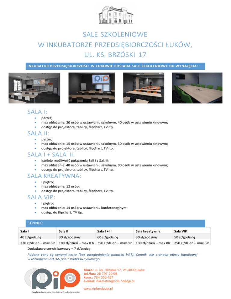 SALE SZKOLENIOWE W INKUBATORZE PRZEDSIĘBIORCZOŚCI ŁUKÓW, UL. KS. BRZÓSKI 17 INKUBATOR PRZEDSIĘBIORCZOŚCI W ŁUKOWIE POSIADA SALE SZKOLENIOWE DO WYNAJĘCIA: SALA I: parter; max obłożenie: 20 osób w ustawieniu szkolnym, 40 osób w ustawieniu kinowym; dostęp do projektora, tablicy, flipchart, TV itp. SALA II: parter; max obłożenie: 15 osób w ustawieniu szkolnym, 30 osób w ustawieniu kinowym; dostęp do projektora, tablicy, flipchart, TV itp. SALA I + SALA II: istnieje możliwość połączenia Sali I z Salą II; max obłożenie: 40 osób w ustawieniu szkolnym, 90 osób w ustawieniu kinowym; dostęp do projektora, tablicy, flipchart, TV itp. SALA KREATYWNA: I piętro; max obłożenie: 12 osób; dostęp do projektora, tablicy, flipchart, TV itp. SALA VIP: I piętro; max obłożenie: 14 osób w ustawieniu konferencyjnym; dostęp do flipchart, TV itp. CENNIK: Sala I Sala II Sala I + II Sala kreatywna: Sala VIP 40 zł/godzinę 30 zł/godzinę 60 zł/godzinę 30 zł/godzinę 50 zł/godzinę 220 zł/dzień – max 8 h 180 zł/dzień – max 8 h 350 zł/dzień – max 8 h 180 zł/dzień – max 8h 250 zł/dzień – max 8 h Dodatkowo serwis kawowy – 7 zł/osobę Podane ceny są cenami netto (bez uwzględnienia podatku VAT). Cennik nie stanowi oferty handlowej w rozumieniu art. 66 par.1 Kodeksu Cywilnego. biuro: ul. ks. Brzóski 17, 21-400 Łuków tel./fax: 25 797 20 08 kom.: 784 306 487 e-mail: [email protected] www.ripfundacja.pl