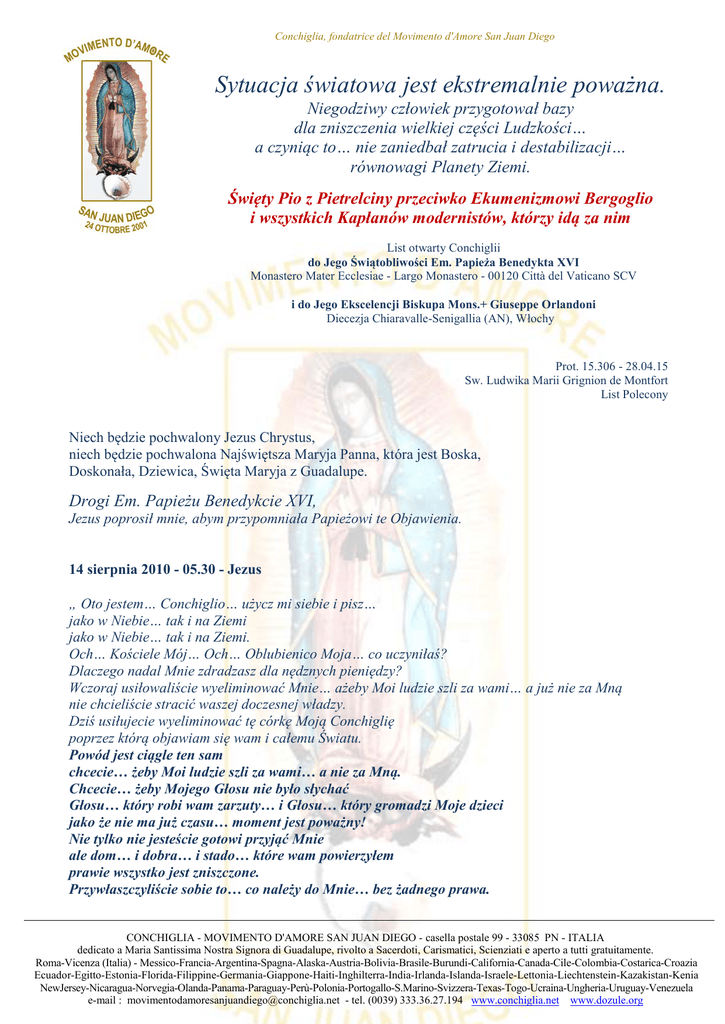 Conchiglia, fondatrice del Movimento d'Amore San Juan Diego Sytuacja światowa jest ekstremalnie poważna. Niegodziwy człowiek przygotował bazy dla zniszczenia wielkiej części Ludzkości… a czyniąc to… nie zaniedbał zatrucia i destabilizacji… równowagi Planety Ziemi. Święty Pio z Pietrelciny przeciwko Ekumenizmowi Bergoglio i wszystkich Kapłanów modernistów, którzy idą za nim List otwarty Conchiglii do Jego Świątobliwości Em. Papieża Benedykta XVI Monastero Mater Ecclesiae - Largo Monastero - 00120 Città del Vaticano SCV i do Jego Ekscelencji Biskupa Mons.+ Giuseppe Orlandoni Diecezja Chiaravalle-Senigallia (AN), Włochy Prot. 15.306 - 28.04.15 Sw. Ludwika Marii Grignion de Montfort List Polecony Niech będzie pochwalony Jezus Chrystus, niech będzie pochwalona Najświętsza Maryja Panna, która jest Boska, Doskonała, Dziewica, Święta Maryja z Guadalupe. Drogi Em. Papieżu Benedykcie XVI, Jezus poprosił mnie, abym przypomniała Papieżowi te Objawienia. 14 sierpnia 2010 - 05.30 - Jezus „ Oto jestem… Conchiglio… użycz mi siebie i pisz… jako w Niebie… tak i na Ziemi jako w Niebie… tak i na Ziemi. Och… Kościele Mój… Och… Oblubienico Moja… co uczyniłaś? Dlaczego nadal Mnie zdradzasz dla nędznych pieniędzy? Wczoraj usiłowaliście wyeliminować Mnie… ażeby Moi ludzie szli za wami… a już nie za Mną nie chcieliście stracić waszej doczesnej władzy. Dziś usiłujecie wyeliminować tę córkę Moją Conchiglię poprzez którą objawiam się wam i całemu Światu. Powód jest ciągle ten sam chcecie… żeby Moi ludzie szli za wami… a nie za Mną. Chcecie… żeby Mojego Głosu nie było słychać Głosu… który robi wam zarzuty… i Głosu… który gromadzi Moje dzieci jako że nie ma już czasu… moment jest poważny! Nie tylko nie jesteście gotowi przyjąć Mnie ale dom… i dobra… i stado… które wam powierzyłem prawie wszystko jest zniszczone. Przywłaszczyliście sobie to… co należy do Mnie… bez żadnego prawa. CONCHIGLIA - MOVIMENTO D'AMORE SAN JUAN DIEGO - casella postale 99 - 33085 PN - ITALIA dedicato a Maria Santissima Nostra Signora di Guadalupe, rivolto a Sacerdoti, Carismatici, Scienziati e aperto a tutti gratuitamente. Roma-Vicenza (Italia) - Messico-Francia-Argentina-Spagna-Alaska-Austria-Bolivia-Brasile-Burundi-California-Canada-Cile-Colombia-Costarica-Croazia Ecuador-Egitto-Estonia-Florida-Filippine-Germania-Giappone-Haiti-Inghilterra-India-Irlanda-Islanda-Israele-Lettonia-Liechtenstein-Kazakistan-Kenia NewJersey-Nicaragua-Norvegia-Olanda-Panama-Paraguay-Perù-Polonia-Portogallo-S.Marino-Svizzera-Texas-Togo-Ucraina-Ungheria-Uruguay-Venezuela e-mail : [email protected] - tel. (0039) 333.36.27.194 www.conchiglia.net www.dozule.org Dziś bardziej niż wczoraj kochacie i macie doczesną władzę w każdej dziedzinie. Staliście się politykierami szatana. Wśród was są tacy… którzy ukuli « Stany Zjednoczone Kościoła Światowego »… Jedną Religię Światową. Jesteście zdrajcami! Miał to być Kościół Światowy Jezusa… a nie szatana. Jutro zamierzacie obłudnie wspominać w niewłaściwy sposób Wniebowzięcie Mojej Matki Maryi. Tak… mówię ‘obłudnie’ ponieważ zamiast powiedzieć Światu jak naprawdę mają się fakty wyszeptujecie kilka głupich słów których Moje dzieci nie mogą zaakceptować i uwierzyć w nie. Wniebowzięcie Mojej Matki jest cudowną i zdumiewającą rzeczywistością. Chwała Maryi powinna być znana na całym Świecie i powinna być uroczyście ogłoszona wśród modlitw i śpiewów radości. A zamiast tego… powtarzam… głupie i obraźliwe szepty uniosą się ku Niebu ponieważ bardzo wystrzegacie się obrażania różnych kościołów protestanckich w imię fałszywego i bezbarwnego Ekumenizmu… o który Ja nie prosiłem przeciwnie… prosiłem o głoszenie i rozpowszechnianie Ewangelii Prawdy na całym Świecie aż po najbardziej odległe zakątki Ziemi. I powiedziałem również… że « Kto nie wierzy we Mnie… nie ma Zbawienia ». Zatem jesteście wspólnikami szatana i poprzekręcaliście Prawdę zatrzymując z Ewangelii tylko to… co szło na waszą korzyść w bogactwie i władzy… oraz w sądzie. Ilu z was jest już w Piekle. I ilu jeszcze tam pójdzie… nie możecie sobie tego nawet wyobrazić. Powinniście dobrze przeczytać i wiele medytować nad tym… co powiedziałem oraz wytłumaczyć Moim ludziom jak nastąpi Moje bliskie Przyjście… przed Ostatecznym Przyjściem. Otwórzcie Tajne Archiwa Watykańskie. Pokażcie światu dowody. Ratujcie przynajmniej to… co da się uratować… ażeby Moi ludzie uświadomili to sobie. Niedoceniacie Moich ludzi. Dokąd będziecie usiłowali ich oszukiwać? Wasze milczenie sieje dalsze zamieszanie zarówno wśród Moich ludzi… jak i wśród Moich wiernych i kochanych Kapłanów którzy idą za Mną… ponieważ Mnie kochają i szanują Mnie. I zanim będę kontynuował na ten temat… leży Mi na sercu sprecyzowanie… i niech będzie wiadome że to tych niewielu Kapłanów… którzy naprawdę Mnie kochają są filarami… które jeszcze podtrzymują Mój Prawdziwy Kościół. Znam spiski tych wszystkich Purpuratów i Kapłanów… którzy Mnie zdradzają i zdemaskuję was jednego po drugim ku waszemu wielkiemu wstydowi i klęsce. Teraz zwracam się do was… Moja mała wierna Reszto… Moja najukochańsza trzodo… Pasterze Moi szanowani i umiłowani. Niektórzy Możni Kościoła… w porozumieniu z niektórymi Możnymi Państw Świata… 2 CONCHIGLIA - MOVIMENTO D'AMORE SAN JUAN DIEGO - casella postale 99 - 33085 PN - ITALIA dedicato a Maria Santissima Nostra Signora di Guadalupe, rivolto a Sacerdoti, Carismatici, Scienziati e aperto a tutti gratuitamente. Roma-Vicenza (Italia) - Messico-Francia-Argentina-Spagna-Alaska-Austria-Bolivia-Brasile-Burundi-California-Canada-Cile-Colombia-Costarica-Croazia Ecuador-Egitto-Estonia-Florida-Filippine-Germania-Giappone-Haiti-Inghilterra-India-Irlanda