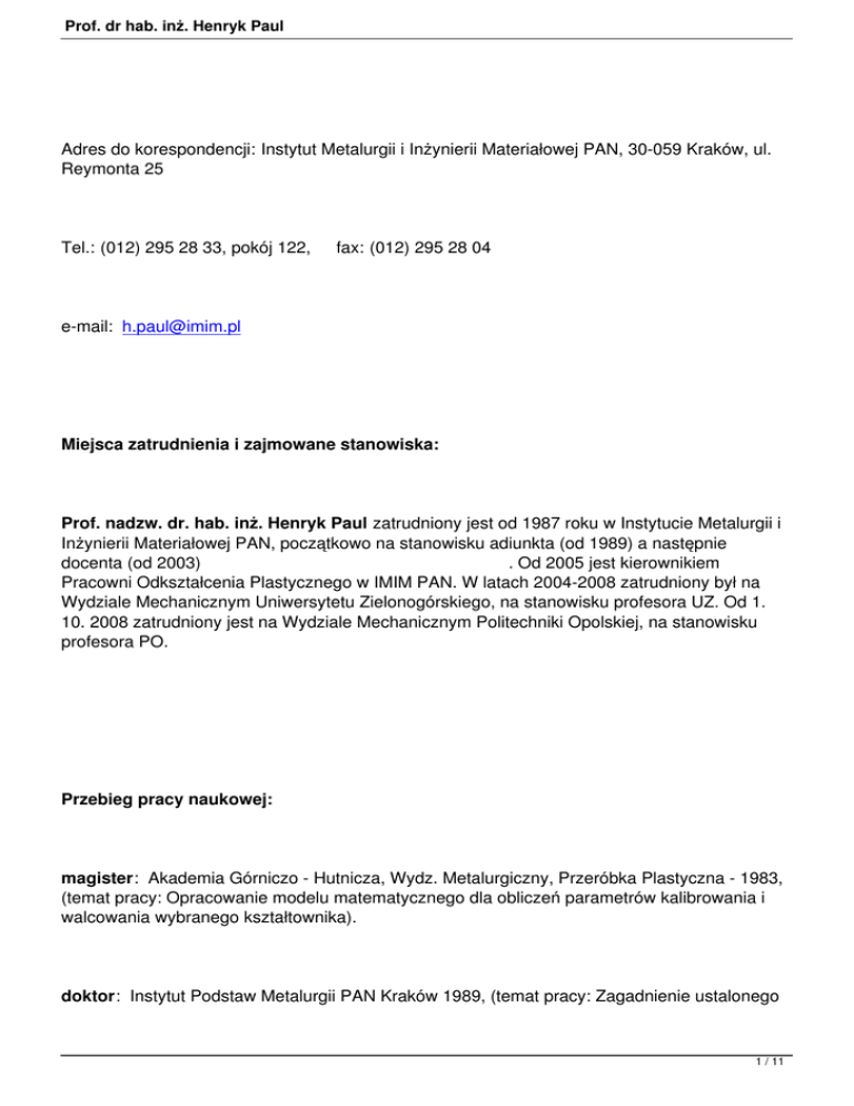 Prof. dr hab. inż. Henryk Paul - Instytut Metalurgii i Inżynierii