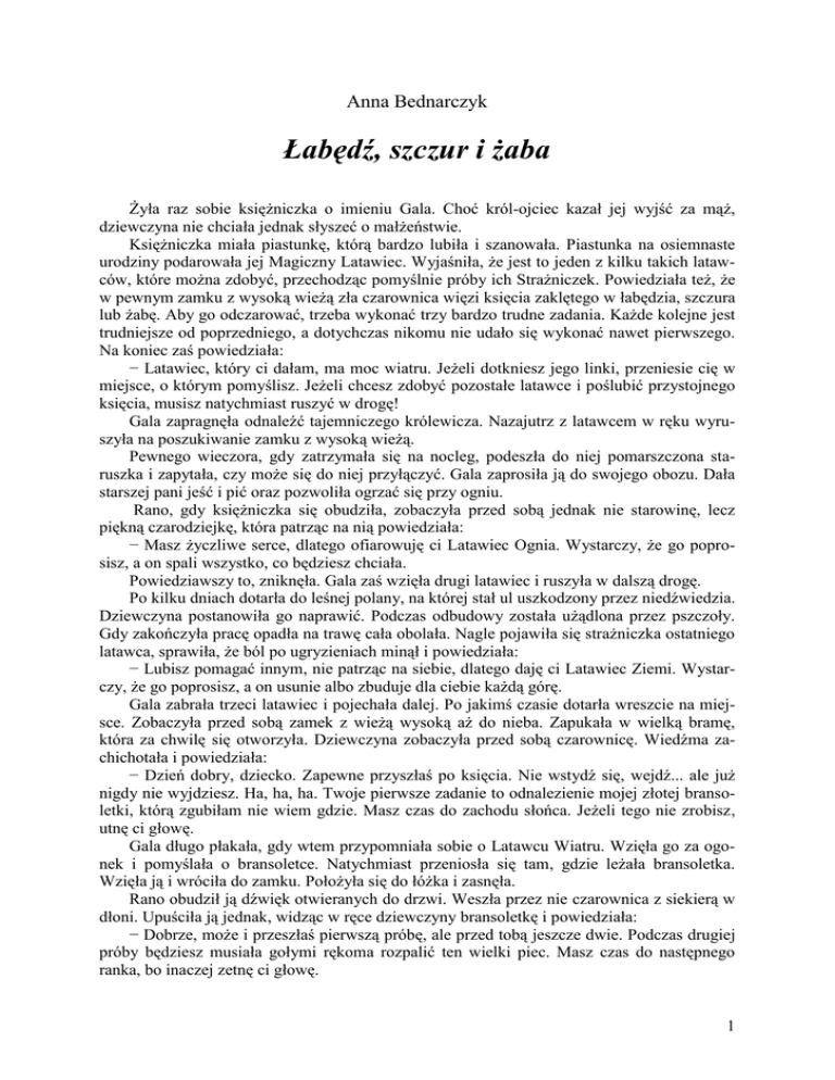Anna Bednarczyk Łabędź, szczur i żaba Żyła raz sobie księżniczka o imieniu Gala. Choć król-ojciec kazał jej wyjść za mąż, dziewczyna nie chciała jednak słyszeć o małżeństwie. Księżniczka miała piastunkę, którą bardzo lubiła i szanowała. Piastunka na osiemnaste urodziny podarowała jej Magiczny Latawiec. Wyjaśniła, że jest to jeden z kilku takich latawców, które można zdobyć, przechodząc pomyślnie próby ich Strażniczek. Powiedziała też, że w pewnym zamku z wysoką wieżą zła czarownica więzi księcia zaklętego w łabędzia, szczura lub żabę. Aby go odczarować, trzeba wykonać trzy bardzo trudne zadania. Każde kolejne jest trudniejsze od poprzedniego, a dotychczas nikomu nie udało się wykonać nawet pierwszego. Na koniec zaś powiedziała: − Latawiec, który ci dałam, ma moc wiatru. Jeżeli dotkniesz jego linki, przeniesie cię w miejsce, o którym pomyślisz. Jeżeli chcesz zdobyć pozostałe latawce i poślubić przystojnego księcia, musisz natychmiast ruszyć w drogę! Gala zapragnęła odnaleźć tajemniczego królewicza. Nazajutrz z latawcem w ręku wyruszyła na poszukiwanie zamku z wysoką wieżą. Pewnego wieczora, gdy zatrzymała się na nocleg, podeszła do niej pomarszczona staruszka i zapytała, czy może się do niej przyłączyć. Gala zaprosiła ją do swojego obozu. Dała starszej pani jeść i pić oraz pozwoliła ogrzać się przy ogniu. Rano, gdy księżniczka się obudziła, zobaczyła przed sobą jednak nie starowinę, lecz piękną czarodziejkę, która patrząc na nią powiedziała: − Masz życzliwe serce, dlatego ofiarowuję ci Latawiec Ognia. Wystarczy, że go poprosisz, a on spali wszystko, co będziesz chciała. Powiedziawszy to, zniknęła. Gala zaś wzięła drugi latawiec i ruszyła w dalszą drogę. Po kilku dniach dotarła do leśnej polany, na której stał ul uszkodzony przez niedźwiedzia. Dziewczyna postanowiła go naprawić. Podczas odbudowy została użądlona przez pszczoły. Gdy zakończyła pracę opadła na trawę cała obolała. Nagle pojawiła się strażniczka ostatniego latawca, sprawiła, że ból po ugryzieniach minął i powiedziała: − Lubisz pomagać innym, nie patrząc na siebie, dlatego daję ci Latawiec Ziemi. Wystarczy, że go poprosisz, a on usunie albo zbuduje dla ciebie każdą górę. Gala zabrała trzeci latawiec i pojechała dalej. Po jakimś czasie dotarła wreszcie na miejsce. Zobaczyła przed sobą zamek z wieżą wysoką aż do nieba. Zapukała w wielką bramę, która za chwilę się otworzyła. Dziewczyna zobaczyła przed sobą czarownicę. Wiedźma zachichotała i powiedziała: − Dzień dobry, dziecko. Zapewne przyszłaś po księcia. Nie wstydź się, wejdź... ale już nigdy nie wyjdziesz. Ha, ha, ha. Twoje pierwsze zadanie to odnalezienie mojej złotej bransoletki, którą zgubiłam nie wiem gdzie. Masz czas do zachodu słońca. Jeżeli tego nie zrobisz, utnę ci głowę. Gala długo płakała, gdy wtem przypomniała sobie o Latawcu Wiatru. Wzięła go za ogonek i pomyślała o bransoletce. Natychmiast przeniosła się tam, gdzie leżała bransoletka. Wzięła ją i wróciła do zamku. Położyła się do łóżka i zasnęła. Rano obudził ją dźwięk otwieranych do drzwi. Weszła przez nie czarownica z siekierą w dłoni. Upuściła ją jednak, widząc w ręce dziewczyny bransoletkę i powiedziała: − Dobrze, może i przeszłaś pierwszą próbę, ale przed tobą jeszcze dwie. Podczas drugiej próby będziesz musiała gołymi rękoma rozpalić ten wielki piec. Masz czas do następnego ranka, bo inaczej zetnę ci głowę. 1 Gdy tylko czarownica wyszła, Gala wyjęła Latawiec Ognia i dzięki niemu rozpaliła piec. Tak jak poprzednio czarownica przyszła z siekierą, aby ukarać księżniczkę. Gdy zobaczyła rozpalony piec, mina jej jednak zrzedła. − Przeszłaś drugą próbę. Teraz czeka cię trzecia, najtrudniejsza. Musisz przejść ten wysoki mur w ciągu jednego dnia. Będę na ciebie czekała po drugiej stronie i jeżeli ci się nie uda, zetnę ci głowę. Gala natychmiast wyjęła Latawiec Ziemi i rozkazała, aby zniszczył mur. Czarownica nie dała jednak za wygraną. − Nie wiem, jak to zrobiłaś, ale znów ci się udało – powiedziała zaskoczona. − Mam jednak dla ciebie jeszcze jedno zadanie, którego na pewno nie wykonasz. − Przecież miały być tylko trzy zadania! Tak mówiła piastunka. Czarownica nic nie powiedziała, lecz zaprowadziła księżniczkę do komnaty zamkowej, gdzie siedziały zwierzęta: łabędź, szczur i żaba. − Musisz zgadnąć, które z tych zwierząt to książę. Jeżeli wybierzesz źle, to utnę ci głowę. Gala długo się zastanawiała i płakała nad swoim losem. Niestety nie mogła użyć do tego zadania żadnego z latawców. Na twarzy czarownicy pojawił się uśmiech. Gala postanowiła, że spróbuje rozwiązać tę zagadkę sama. Pamiętała, że w dzieciństwie mama czytała jej książki, w których zawsze najbrzydsza rzecz okazywała się najcenniejsza. Wtedy ją olśniło. Wybrała żabę, a żaba zamieniła się w księcia. Zła czarownica zapadła się zaś pod ziemię. Gala wróciła do swego królestwa, została królową i żyła długo i szczęśliwie ze swoim księciem. MORAŁ: Warto pomagać innym, a rzeczy ładne nie zawsze są wartościowe. 2