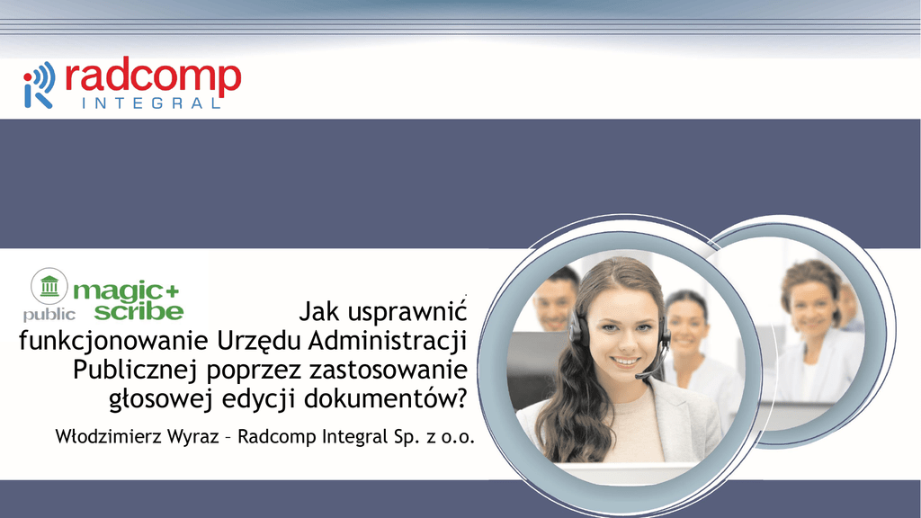 . Jak usprawnić funkcjonowanie Urzędu Administracji Publicznej poprzez zastosowanie głosowej edycji dokumentów? Włodzimierz Wyraz – Radcomp Integral Sp. z o.o. Wprowadzenie Nowoczesna technologia rozpoznawania mowy i analizy głosu MagicScribe+ Public to zautomatyzowany proces tworzenia dokumentów z dowolnego miejsca za pomocą urządzeń stacjonarnych lub mobilnych przy pomocy głosowego wprowadzania informacji (danych). Możliwe zastosowania systemu: • Dyktowanie głosem; • Protokołowanie posiedzeń, komisji, konferencji; • Tworzenie dokumentów z zarejestrowanych nagrań; • Zastosowanie w aplikacjach mobilnych; • Automatyzacja telefonicznej obsługi interesantów; • Wsparcie osób niedosłyszących; • Automatyczne centrum informacji. Tworzenie dokumentów głosem Bezpośrednie dyktowanie treści dokumentu: • Do wybranego okna edycyjnego (np. MS Word, notatnik, poczta) na lokalnym stanowisku pracy (komputerze), z możliwością pełnej i bieżącej edycji powstającego tekstu. • Na stanowisko pomocy technicznej (np. asystenta). Dyktowana treść jest automatycznie rozpoznawana i wyświetlana na ekranie monitora osoby, która dokonuje niezbędnej korekty. Gotowy dokument możne trafić do akceptacji i podpisu lub od razu do wydruku czy zapisu w bazie. Tworzenie dokumentów z nagrań dźwiękowych Źródłem tworzonego dokumentu jest plik dźwiękowy z nagraną treścią. Na stanowisku transkrypcyjnym nagranie zostaje automatycznie rozpoznane i zamienione na tekst. Otrzymany tekst, po jego weryfikacji i ewentualnej korekcie, stanowi finalną treść dokumentu. Protokołowanie posiedzeń, oficjalnych spotkań, konferencji W zależności od potrzeb, stosowny protokół może być utworzony: • Na bieżąco w trakcie trwania wydarzenia. Protokół tworzy zespół respeaker – moderator przy użyciu technologii rozpoznawania mowy i analizy głosu. Dzięki temu gotowy protokół jest dostępny praktycznie w kilka minut po zakończeniu wydarzenia. • W krótkim czasie po zakończeniu wydarzenia. Protokół powstaje na podstawie nagrania z przebiegu całego wydarzenia w sposób podobny do tworzenia dokumentu z nagrania dźwiękowego. Zastosowanie aplikacji mobilnych do wypełniania dokumentów Tworzenie sformalizowanych dokumentów głosem z dowolnego miejsca może stanowić istotne wsparcie w procesach automatyzacji obiegu dokumentów, rozpatrywania wniosków, pism, itp. Rozwiązanie takie pozwala na: • kontekstowe wypełnianie głosem całego formularza lub tylko jego określonych pól; • swobodne poruszanie się głosem po całym formularzu dokumentu; • informowanie zwrotne o brakujących lub błędnie wprowadzonych danych. Automatyzacja telefonicznej obsługi klientów Zastosowanie mechanizmów rozpoznawania mowy i interpretacji znaczenia rozpoznanej wypowiedzi pozwala na bezosobową obsługę osób dzwoniących do Centrum Obsługi Klientów (COK). Rozpoznana wypowiedź przekazywana jest do systemu wnioskującego w ramach, np. IVR czy Contact Center celem dalszego prowadzenia dialogu i odpowiedzi na pytania klienta. Całość konwersacji zapisywana jest bazie danych dla celów ewidencyjnych, analitycznych i kontrolnych. Wsparcie osób niesłyszących i niedosłyszących Rozwiązanie oparte na technologii rozpoznawania mowy, pozwalające na dynamiczne generowanie napisów odpowiadających wypowiadanym treściom w materiale audiowizualnym. Dodatkowo, źródłowy materiał audiowizualny może zostać ocechowany znacznikami czasowymi pozwalającymi w przyszłości na przeszukiwanie treści materiału celem szybkiego dotarcia do konkretnego fragmentu nagrania. Zastosowanie takiego rozwiązania w codziennej pracy Urzędu pozwala na szybkie i stosunkowo tanie przygotowanie materiałów audiowizualnych dostępnych dla każdego, w tym niepełnosprawnych w zakresie słuchowym. Głosowy asystent - aplikacja do automatycznego udostępniania informacji Portal głosowy symulujący fizycznego asystenta (konsultanta). Dostępny na stronie internetowej Urzędu umożliwia automatyczne przetwarzanie zapytań interesanta. Może być w formie audio (głosowej) lub audio - video (głosowo - wizualnej). Aplikacja rozpoznaje intencje mówcy (interesanta) na podstawie jego wypowiedzi przetłumaczonej przez system MagicScibe+ Public i udziela konkretnej odpowiedzi, wybierając ją z dostępnej bazy danych. Rozwiązanie to zapewnia interesantowi (klientowi) szybki i wygodny dostęp do wybranych informacji poprzez aplikację mobilną, stronę internetową lub kontakt telefoniczny. Obsługa wydarzeń międzynarodowych Obsługa wydarzeń międzynarodowych jest realizowana przez tłumaczenie symultaniczne wydarzenia z języka polskiego na inny język lub z języka obcego na polski, przy współpracy wykwalifikowanych tłumaczy symultanicznych. Tłumaczenie jest dostępne w miejscu, w którym odbywa się wydarzenie. Publikowanie rozpoznanych treści może odbywać się automatycznie w postaci napisów lub w Internecie z wykorzystaniem transmisji online. Podsumowanie korzyści Korzyści dla pracownika: • Oszczędność czasu i optymalizacja pracy; • Większa efektywność pracy (szybkość, jakość, precyzja); • Poprawa komfortu i ergonomii pracy. Korzyści dla jednostki administracyjnej: • Obniżenie kosztów działalności poprzez optymalizację nakładów na infrastrukturę informatyczną czy nakładów na zasoby osobowe; • Poprawa organizacji pracy poprzez skrócenie i usprawnienie przepływu informacji; • Wzrost poziomu zaufania społecznego poprzez usprawnienie obsługi interesantów. Korzyści dla interesantów: • Szybszy dostęp do różnego rodzaju informacji i danych; • Wielokanałowy dostęp do informacji; • Krótszy czas oczekiwania na decyzje, dokumenty, powiadomienia. Wybrane wdrożenia • Prawo i Administracja: • Najwyższa Izba Kontroli • Sądy Okręgowe w Toruniu, Piotrkowie Trybunalskim, Tarnobrzegu, Elblągu, Olsztynie, Płocku • Sądy Rejonow