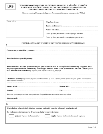 WNIOSEK O ODNOWIENIE 5-LETNIEGO TERMINU WAŻNOŚCI WYPISÓW Z LICENCJI WSPÓLNOTOWEJ DOTYCZĄCEJ MIĘDZYNARODOWEGO ZAROBKOWEGO PRZEWOZU DROGOWEGO RZECZY LR9 (dotyczy przedsiębiorcy posiadającego licencję udzieloną na okres powyżej 10 lat) Pieczęć wpływu Wypełnia Organ: Teczka podstawowa: ……………………………………….….…… Numer wniosku: ………………………………………….………… Data i podpis pracownika realizującego wniosek……….……..…… Data i podpis pracownika zamykającego wniosek……….…….…… FORMULARZ NALEŻY WYPEŁNIĆ CZYTELNIE DRUKOWANYMI LITERAMI I. Oznaczenie przedsiębiorcy-nazwa: ……..……………………………..................................................................……….. ………………………………………..……..............................................................…………………................................ Siedziba i adres przedsiębiorcy: ..…………….................................................................................................................. …………………………………….............................................................……..………………..........…………………… Adres siedziby, w której prowadzona jest główna działalność, w szczególności dokumenty księgowe, akta dotyczące pracowników, dokumenty zawierające dane na temat czasu prowadzenia pojazdu i odpoczynku oraz wszelkie inne dokumenty (wpisać jeżeli inny niż wskazany powyżej): ……………………………………………………………………………………………………………………………. Charakter prawny: (np. osoba fizyczna, spółka cywilna, sp. z o.o., spółka jawna, spółka akcyjna, spółka komandytowa, inny - wpisać właściwy) …………………………………………………………………..………………………………………………………… Numer KRS: ............................................................................................... Numer NIP: __ __ __ __ __ __ __ __ __ __ Telefon ……………………………………………………………... Fax ……………………………………………... Wyrażam zgodę na przesyłanie korespondencji drogą elektroniczną na niżej wskazany adres: Adres e-mail: …………………………………………………………………………………………………………. II. Wnioskuję o odnowienie 5-letniego terminu ważności wypisów z licencji wspólnotowej. Do wykonywania transportu drogowego będą wykorzystywane: pojazdy (wpisać liczbę pojazdów) wypisy (wpisać liczbę wnioskowanych wypisów) Strona 1 z 3 III. ZARZĄDZAJĄCY TRANSPORTEM: Imię i nazwisko …………………………………………………………………..………………………………………..………. Adres zamieszkania ……………………………………………………………………….……………………………………… Numer Certyfikatu Kompetencji Zawodowych ………………………………………………………………………………… IV. DO WNIOSKU DOŁĄCZAM: 1. Oświadczenie osoby zarządzającej transportem (FORMULARZ-CERTYFIKAT). 2. Kopię certyfikatu kompetencji zawodowych. 3. Dokumenty potwierdzające posiadanie odpowiedniej zdolności finansowej (zgodnie z art. 7 rozporządzenia (WE) nr 1071/2009): - roczne sprawozdanie finansowe - gwarancja bankowa - ubezpieczenie w tym ubezpieczenie odpowiedzialności zawodowej 4. Oświadczenie dotyczące bazy eksploatacyjnej (FORMULARZ –SIEDZIBA I BAZA). 5. Oświadczenie dotyczące kierowców (FORMULARZ- KIEROWCY). 6. Informacja z Krajowego Rejestru Karnego lub oświadczenie o niekaralności (FORMULARZ-NIEKARALNOŚĆ) przedsiębiorcy i osoby zrządzającej transportem. 7. FORMULARZ – WYKAZ POJAZDÓW. 8. Dowód uiszczenia opłaty za wydanie wypisu(ów) z licencji wspólnotowej. V. Forma odbioru (zaznaczyć właściwe). Osobiście Przesyłka kurierska – na koszt przedsiębiorcy wskazaną firmą kurierską (domyślnie GLS) Wniosek należy przesłać na adres: Biuro do spraw Transportu Międzynarodowego ul. Prosta 69, 00-838 Warszawa Opłata za odnowienie 5-letniego terminu ważności wypisów z licencji udzielonej na okres powyżej 10 lat: - na 5 lat wynosi 40 zł za każdy wypis z licencji Wpłaty należy dokonać na konto nr: 83 1010 1010 0079 7913 9120 0000 Główny Inspektorat Transportu Drogowego, 02-676 Warszawa, ul. Postępu 21, W tytule przelewu należy bezwzględnie podać numer NIP Strona 2 z 3 Administratorem danych osobowych podanych na wniosku jest Główny Inspektor Transportu Drogowego, z siedzibą przy ul. Postępu 21, 02-676 Warszawa. Zebrane dane osobowe będą przetwarzane zgodnie z ustawą z dnia 29 sierpnia 1997 r. o ochronie danych osobowych (Dz. U. 2002 r. nr 101, poz. 926 ze zm.) w celu wydania wypisów z licencji, zgodnie ze składanym wnioskiem. Każdej osobie przysługuje prawo dostępu do treści swoich danych i ich poprawiania. Podanie danych jest obowiązkowe i wynika z Rozporządzenia Parlamentu Europejskiego i Rady (WE) nr 1071/2009 z dnia 21 października 2009 r. ustanawiającego wspólne zasady dotyczące warunków wykonywania zawodu przewoźnika drogowego i uchylające dyrektywę rady 96/26/WE, Rozporządzenia Parlamentu Europejskiego i Rady (WE) nr 1072/2009 z dnia 21 października 2009 r. dotyczącego wspólnych zasad dostępu do rynku międzynarodowych przewozów drogowych oraz ustawy z dnia 6 września 2001 r. o transporcie drogowym (Dz. U. z 2012 r. poz. 1265 oraz z 2013 r. poz. 21 i poz. 567). ................................................................................................................................................................................................................................ Data Czytelny podpis przedsi