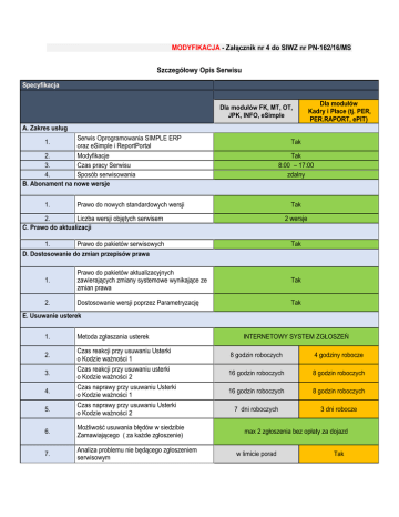 MODYFIKACJA - Załącznik nr 4 do SIWZ nr PN-162/16/MS Szczegółowy Opis Serwisu Specyfikacja Dla modułów FK, MT, OT, JPK, INFO, eSimple A. Zakres usług Serwis Oprogramowania SIMPLE ERP oraz eSimple i ReportPortal 2. Modyfikacje 3. Czas pracy Serwisu 4. Sposób serwisowania B. Abonament na nowe wersje 1. 1. Dla modułów Kadry i Płace (tj. PER, PER.RAPORT, ePIT) Tak Tak 8:00 – 17:00 zdalny Prawo do nowych standardowych wersji Tak 2. Liczba wersji objętych serwisem C. Prawo do aktualizacji 2 wersje 1. Prawo do pakietów serwisowych D. Dostosowanie do zmian przepisów prawa Tak 1. Prawo do pakietów aktualizacyjnych zawierających zmiany systemowe wynikające ze zmian prawa Tak 2. Dostosowanie wersji poprzez Parametryzację Tak E. Usuwanie usterek 1. Metoda zgłaszania usterek INTERNETOWY SYSTEM ZGŁOSZEŃ 2. Czas reakcji przy usuwaniu Usterki o Kodzie ważności 1 8 godzin roboczych 4 godziny robocze 3. Czas reakcji przy usuwaniu usterki o Kodzie ważności 2 16 godzin roboczych 8 godzin roboczych 4. Czas naprawy przy usuwaniu Usterki o Kodzie ważności 1 16 godzin roboczych 8 godzin roboczych 5. Czas naprawy przy usuwaniu Usterki o Kodzie ważności 2 7 dni roboczych 3 dni robocze 6. Możliwość usuwania błędów w siedzibie Zamawiającego ( za każde zgłoszenie) 7. Analiza problemu nie będącego zgłoszeniem serwisowym max 2 zgłoszenia bez opłaty za dojazd w limicie porad Tak 8. Naprawa problemu nie będącego zgłoszeniem serwisowym 9. Liczba przyjmowanych zgłoszeń miesięcznie Liczba osób uprawnionych do zgłaszania problemów F. Wsparcie telefoniczne 10. w limicie porad bez limitu bez limitu 1. Dostęp do Telefonicznego Centrum Serwisowego od poniedziałku do piątku w godzinach 2. Porady dot. funkcjonowania Oprogramowania SIMPLE ERP i Modyfikacji (ilość godzin / w okresie obowiązywania umowy) 16 3. Ponad limitowe porady dot. funkcjonowania Oprogramowania SIMPLE ERP i Modyfikacji opłata 4. Spotkania z Zamawiającym monitorujące jakość świadczonych usług serwisowych 5. Dedykowany opiekun umowy ze strony Wykonawcy Tak 1. Dostęp do całotygodniowego całodobowego Internetowego Centrum Pomocy Tak 2. Aktywacja dostępu do Internetowego Centrum Pomocy Tak 3. Szkolenie z obsługi Internetowego Centrum Pomocy Tak 4. Dostęp do bazy wiedzy o aktualizacjach i nowych wersjach Tak 8:00 – 17:00 1 w trakcie trwania umowy G. Baza wiedzy H. Środowisko 1. Audyt Oprogramowania SIMPLE ERP i Modyfikacji pod względem wydajnościowym 1 raz w trakcie trwania umowy 2. Strojenie Oprogramowania SIMPLE ERP i Modyfikacji pod względem wydajnościowym 1 raz w trakcie trwania umowy 3. Diagnozowanie usterek spowodowanych przyczynami sprzętowymi (administracja infrastrukturą) w limicie porad 4. Naprawa usterek spowodowanych przyczynami sprzętowymi w limicie porad