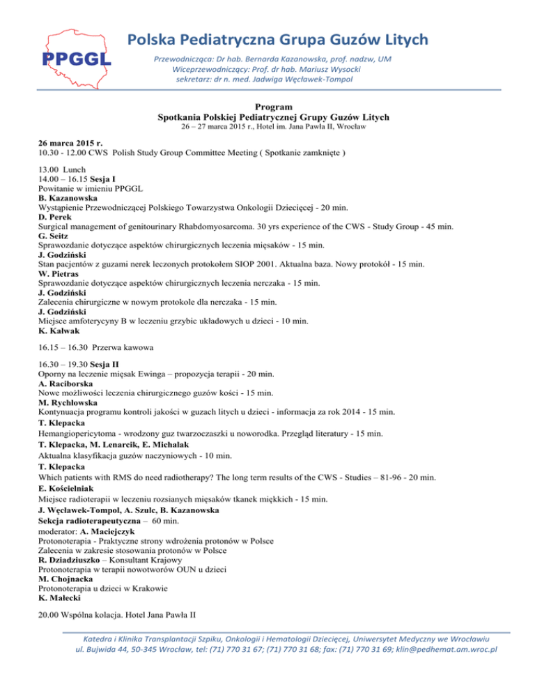 Polska Pediatryczna Grupa Guzów Litych Przewodnicząca: Dr hab. Bernarda Kazanowska, prof. nadzw, UM Wiceprzewodniczący: Prof. dr hab. Mariusz Wysocki sekretarz: dr n. med. Jadwiga Węcławek-Tompol Program Spotkania Polskiej Pediatrycznej Grupy Guzów Litych 26 – 27 marca 2015 r., Hotel im. Jana Pawła II, Wrocław 26 marca 2015 r. 10.30 - 12.00 CWS Polish Study Group Committee Meeting ( Spotkanie zamknięte ) 13.00 Lunch 14.00 – 16.15 Sesja I Powitanie w imieniu PPGGL B. Kazanowska Wystąpienie Przewodniczącej Polskiego Towarzystwa Onkologii Dziecięcej - 20 min. D. Perek Surgical management of genitourinary Rhabdomyosarcoma. 30 yrs experience of the CWS - Study Group - 45 min. G. Seitz Sprawozdanie dotyczące aspektów chirurgicznych leczenia mięsaków - 15 min. J. Godziński Stan pacjentów z guzami nerek leczonych protokołem SIOP 2001. Aktualna baza. Nowy protokół - 15 min. W. Pietras Sprawozdanie dotyczące aspektów chirurgicznych leczenia nerczaka - 15 min. J. Godziński Zalecenia chirurgiczne w nowym protokole dla nerczaka - 15 min. J. Godziński Miejsce amfoterycyny B w leczeniu grzybic układowych u dzieci - 10 min. K. Kałwak 16.15 – 16.30 Przerwa kawowa 16.30 – 19.30 Sesja II Oporny na leczenie mięsak Ewinga – propozycja terapii - 20 min. A. Raciborska Nowe możliwości leczenia chirurgicznego guzów kości - 15 min. M. Rychłowska Kontynuacja programu kontroli jakości w guzach litych u dzieci - informacja za rok 2014 - 15 min. T. Klepacka Hemangiopericytoma - wrodzony guz twarzoczaszki u noworodka. Przegląd literatury - 15 min. T. Klepacka, M. Lenarcik, E. Michalak Aktualna klasyfikacja guzów naczyniowych - 10 min. T. Klepacka Which patients with RMS do need radiotherapy? The long term results of the CWS - Studies – 81-96 - 20 min. E. Kościelniak Miejsce radioterapii w leczeniu rozsianych mięsaków tkanek miękkich - 15 min. J. Węcławek-Tompol, A. Szulc, B. Kazanowska Sekcja radioterapeutyczna – 60 min. moderator: A. Maciejczyk Protonoterapia - Praktyczne strony wdrożenia protonów w Polsce Zalecenia w zakresie stosowania protonów w Polsce R. Dziadziuszko – Konsultant Krajowy Protonoterapia w terapii nowotworów OUN u dzieci M. Chojnacka Protonoterapia u dzieci w Krakowie K. Małecki 20.00 Wspólna kolacja. Hotel Jana Pawła II Katedra i Klinika Transplantacji Szpiku, Onkologii i Hematologii Dziecięcej, Uniwersytet Medyczny we Wrocławiu ul. Bujwida 44, 50-345 Wrocław, tel: (71) 770 31 67; (71) 770 31 68; fax: (71) 770 31 69; [email protected] 27 marca 2015 r. 8.30 – 11.15 Sesja III Pakiet onkologiczny – nowe wyzwanie - 15 min. A. Chybicka Deferazyroks w terapii chelatującej u dzieci – jak radzić sobie z objawami ubocznymi leku - 15 min. K. Kałwak - wykład sponsorowany przez firmę Novartis Registry and CWS 2007 HR, up date - 20 min. E. Kościelniak Stan bazy CWS-2006. Randomizacja CWS-2007 - 20 min. B. Kazanowska Ocena radiologiczna odpowiedzi guza na leczenie - 30 min. C. Olchowy Problemy diagnostyczno-terapeutyczne u chorych z Sarcoma Synoviale - 15 min. J. Węcławek-Tompol, B. Kazanowska Prognosis of children and adolescent with soft tissue Ewing tumors treated in the CWS Studies – 91-2002P - 15 min. E. Kościelniak Aktualne możliwości leczenia neuroblastoma w Polsce - 20 min. W. Balwierz Wyniki leczenia dzieci ze zwojakiem zarodkowym współczulnym. Raport PPGGL 2001-2014 - 15 min. W. Balwierz, A. Wieczorek 11.15 – 11.30 Przerwa kawowa 11.30 - 14.30 Sesja IV Prospektywne badanie obserwacyjne dotyczące obwodowych guzów neuroblastycznych z zajęciem kanału kręgowego (SCI) - 15 min. W. Balwierz, A. Wieczorek Analiza bazy danych guzów germinalnych. Propozycja projektu monitorowania zmian w jądrach typu microlithiasis - 15 min. J. Stefanowicz, W. Kosiak Niezróżnicowany embrionalny mięsak wątroby. Doświadczenie z jednego Ośrodka - 10 min. B. Dembowska-Bagińska Nietypowe i trudne przypadki mięsaków tkanek miękkich u dzieci w materiale Ośrodka Gdańskiego - 10 min. M. Krawczyk Nowotwory rzadko występujące u dzieci - znaczenie konsultacji - 15 min. E. Bień Podsumowanie wyników leczenia guzów wątroby u dzieci w ostatnich 10 latach - 15 min. M. Murawski Fibromatozy w materiale ogólnopolskim – 10 min. K. Bronowicki Odległe powikłania narządowe po leczeniu guzów litych u dzieci - 15 min. M. Krawczuk-Rybak Nowy protokół guzów wątroby na lata 2016-2020 - 15 min. P. Czauderna Propozycja ogólnopolskiej bazy danych i banku materiału biologicznego - 10 min. P. Czauderna Omówienie trudnych przypadków z Ośrodków PPGGL – 20 min. Kraków, Gdańsk, Warszawa, Wrocław Podsumowanie i zakończenie spotkania – B. Kazanowska 14.30 Obiad PARTNERZY